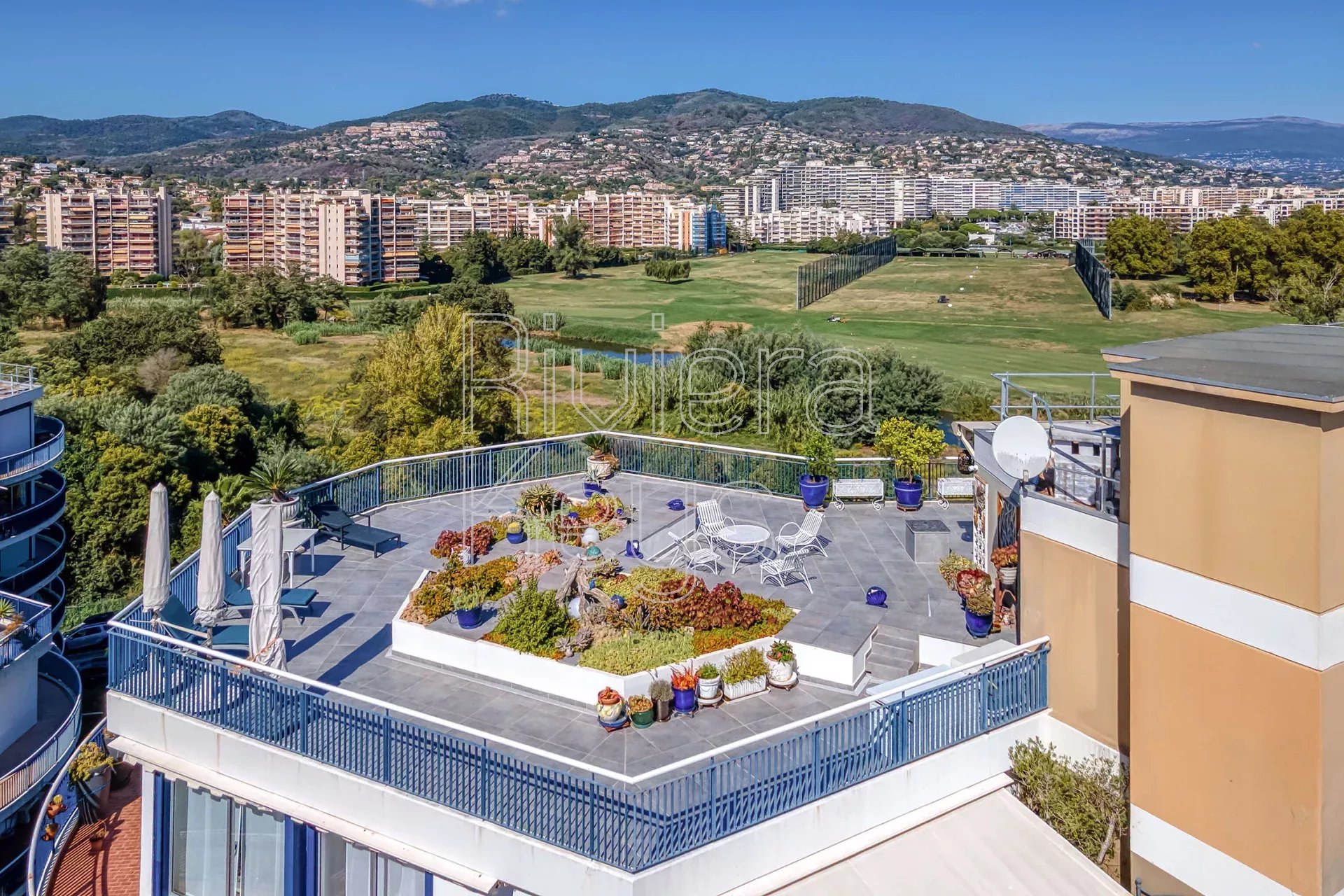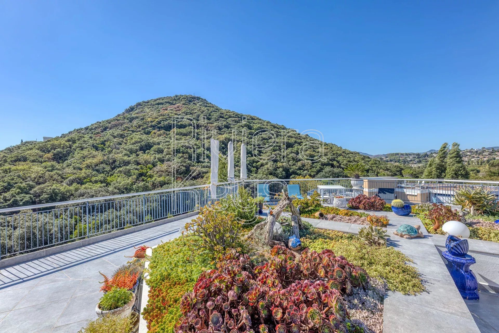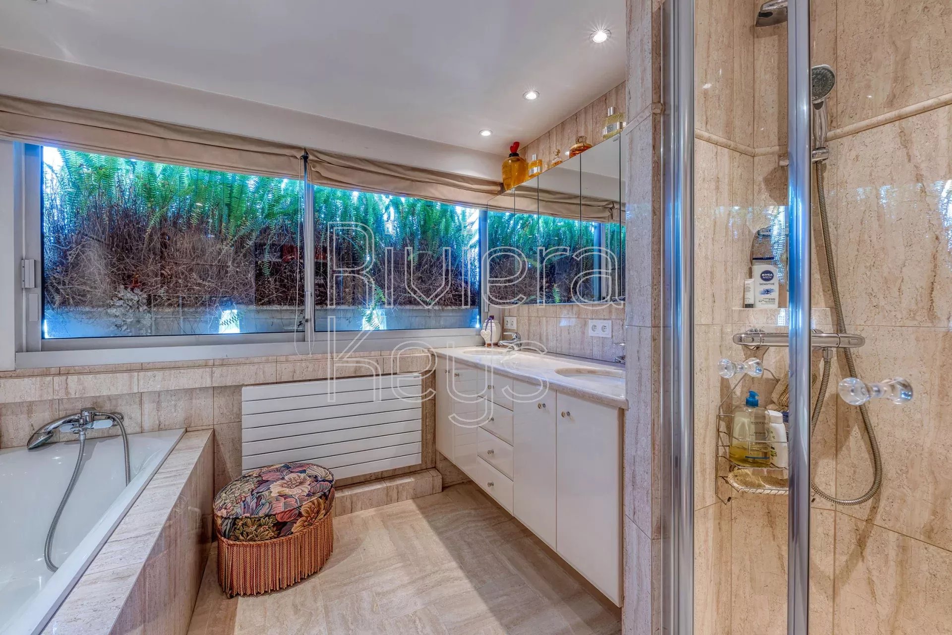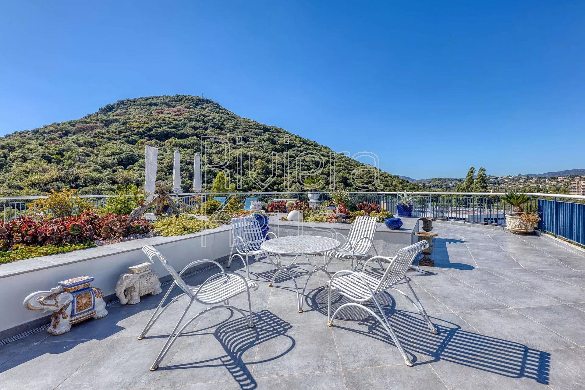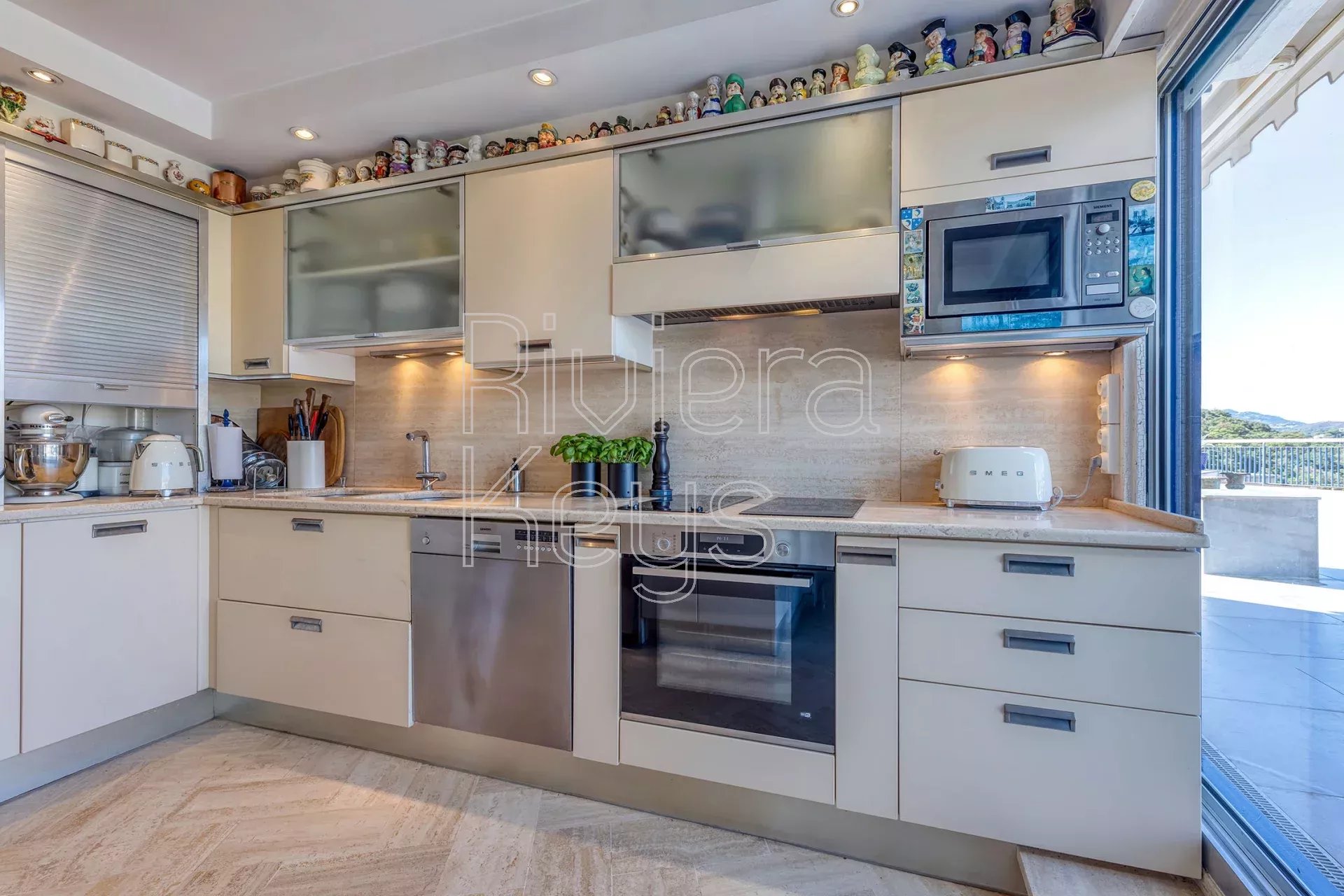 This 122 m² top-floor apartment offers a 160 m² terrace with panoramic sea views and a unique, enchanting view of San Peyre Mountain. The interior includes a bright, cross-through living and dining area, a fully equipped kitchen, a master suite with dressing room and bathroom, a second bedroom, a study, and a second bathroom. Sliding glass doors from every room open onto the continuous balcony or terrace, ensuring sunlight throughout the day.