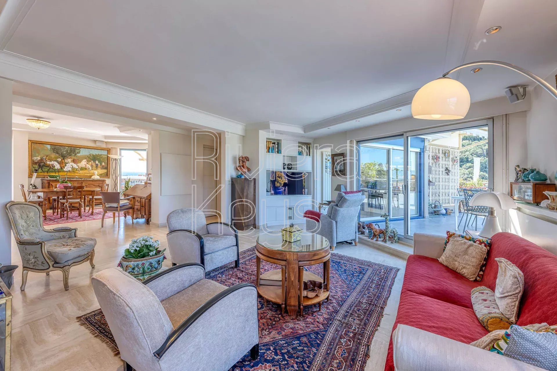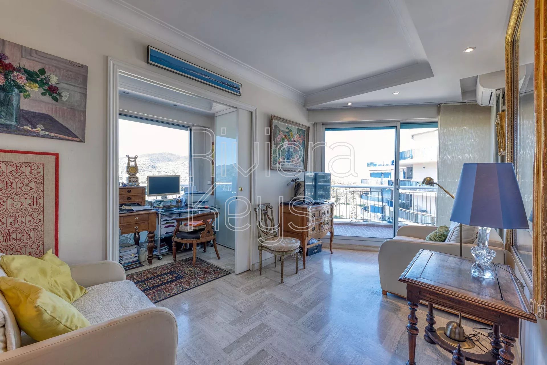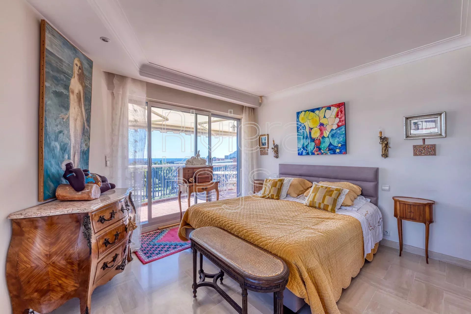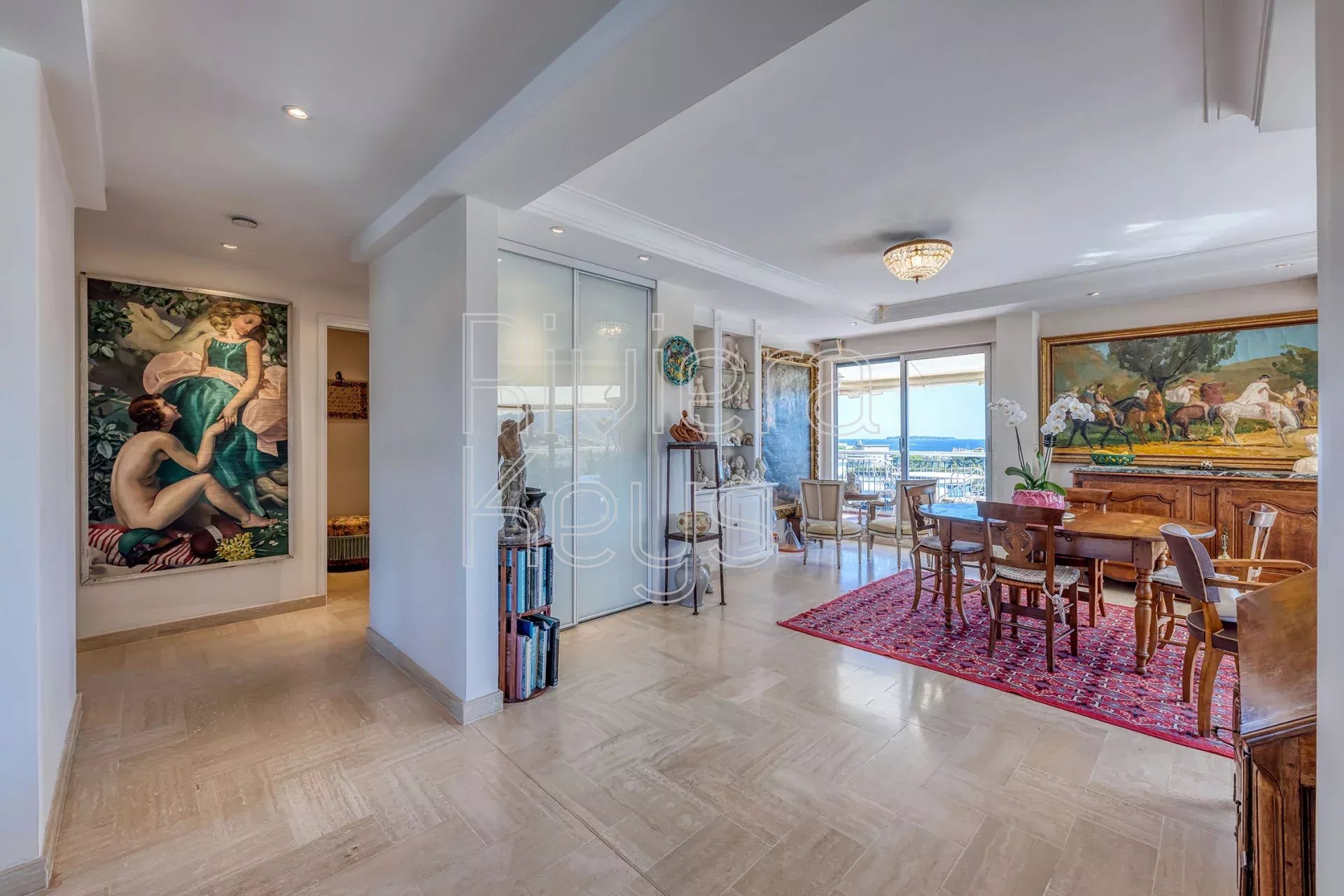 This 122 m² top-floor apartment offers a 160 m² terrace with panoramic sea views and a unique, enchanting view of San Peyre Mountain. The interior includes a bright, cross-through living and dining area, a fully equipped kitchen, a master suite with dressing room and bathroom, a second bedroom, a study, and a second bathroom. Sliding glass doors from every room open onto the continuous balcony or terrace, ensuring sunlight throughout the day.