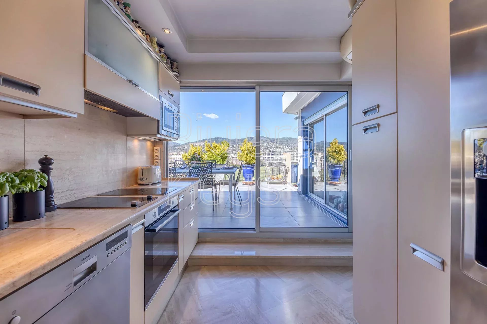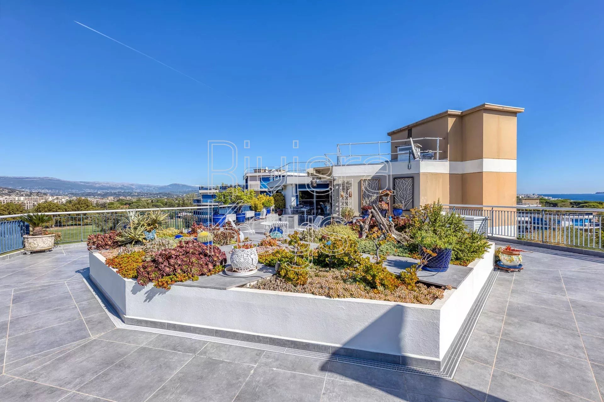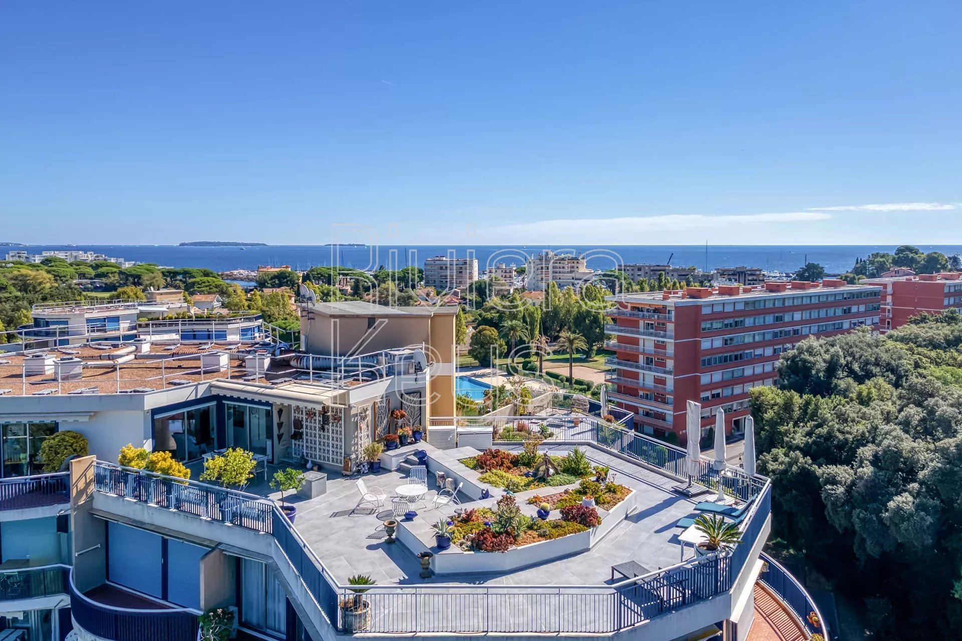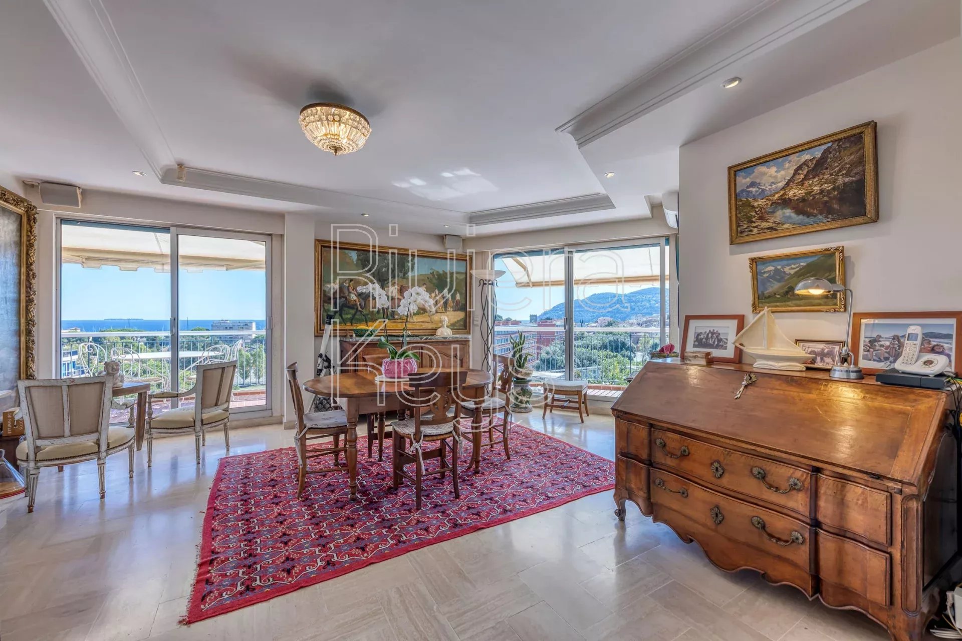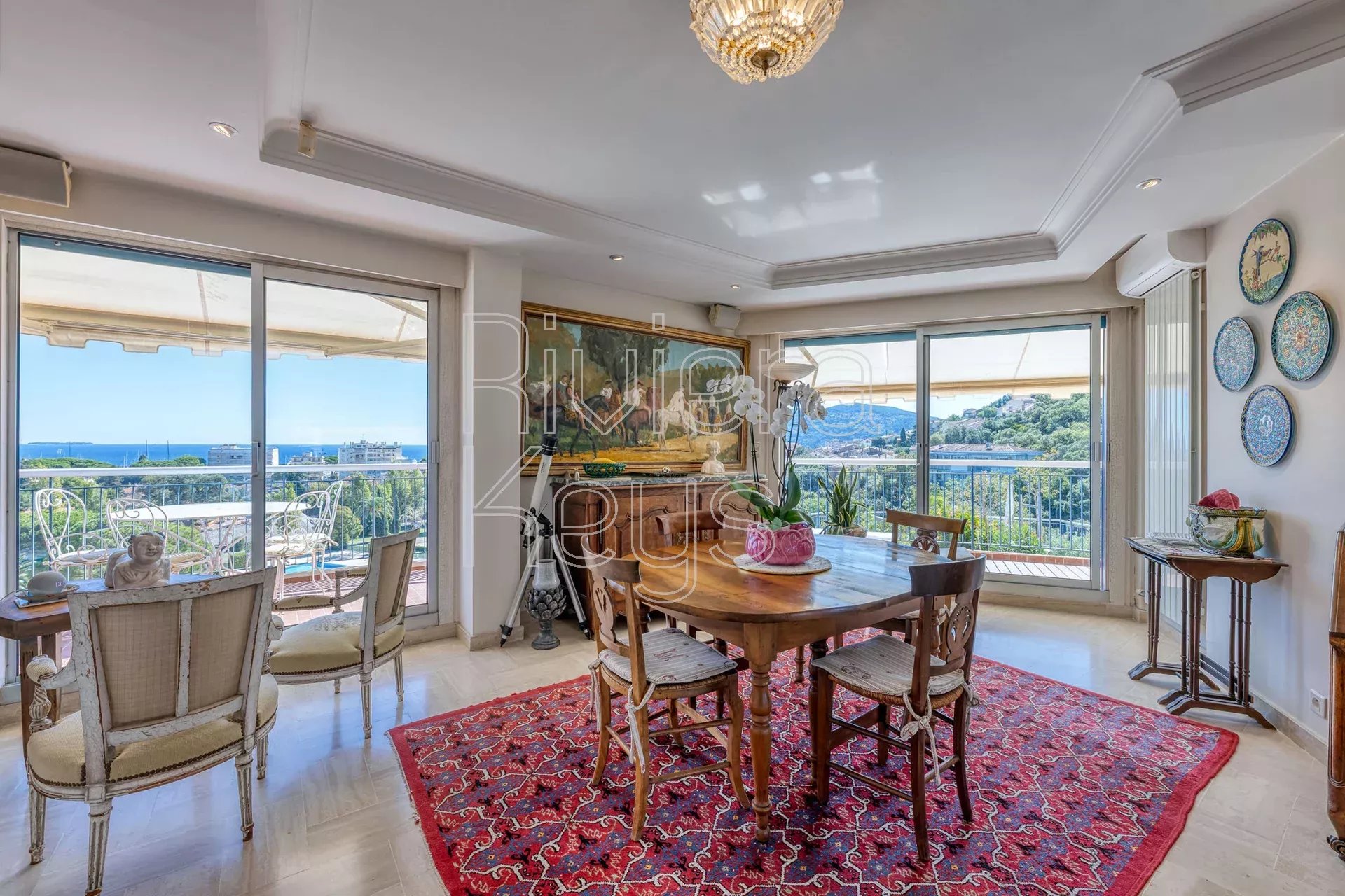 This 122 m² top-floor apartment offers a 160 m² terrace with panoramic sea views and a unique, enchanting view of San Peyre Mountain. The interior includes a bright, cross-through living and dining area, a fully equipped kitchen, a master suite with dressing room and bathroom, a second bedroom, a study, and a second bathroom. Sliding glass doors from every room open onto the continuous balcony or terrace, ensuring sunlight throughout the day.