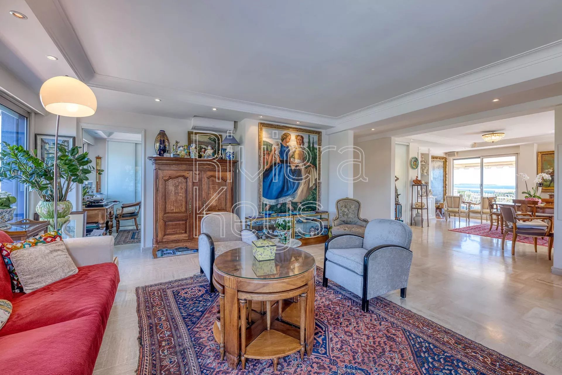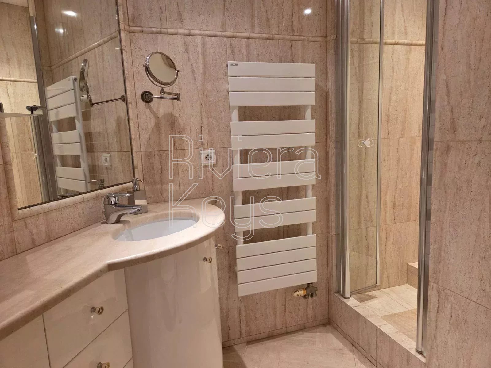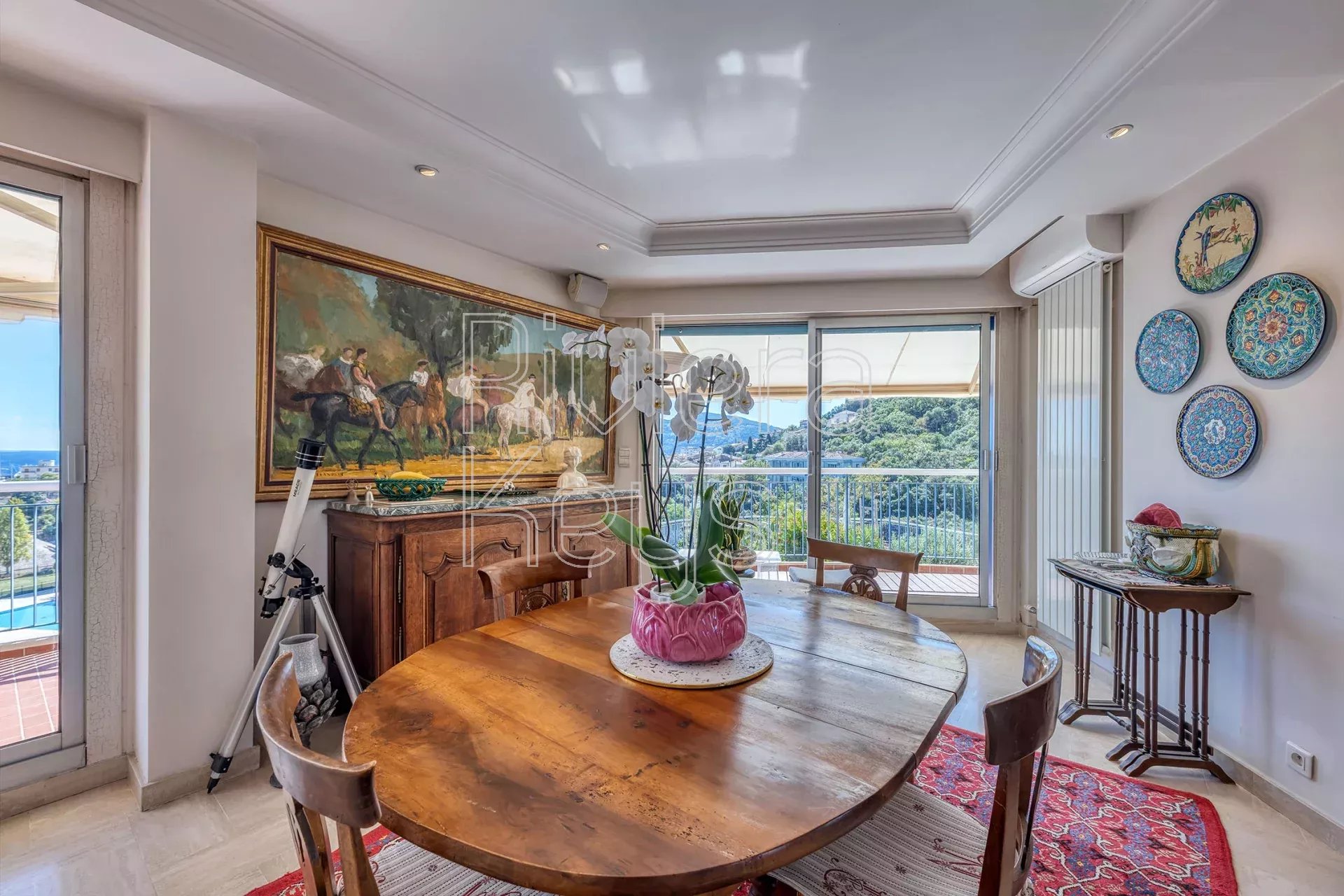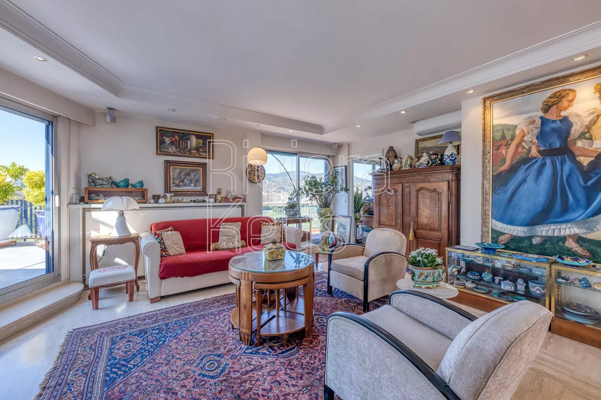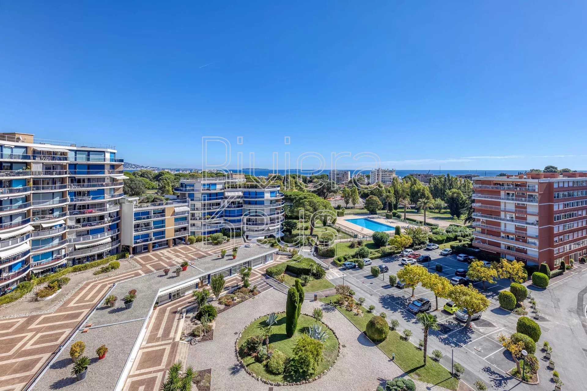 This 122 m² top-floor apartment offers a 160 m² terrace with panoramic sea views and a unique, enchanting view of San Peyre Mountain. The interior includes a bright, cross-through living and dining area, a fully equipped kitchen, a master suite with dressing room and bathroom, a second bedroom, a study, and a second bathroom. Sliding glass doors from every room open onto the continuous balcony or terrace, ensuring sunlight throughout the day.