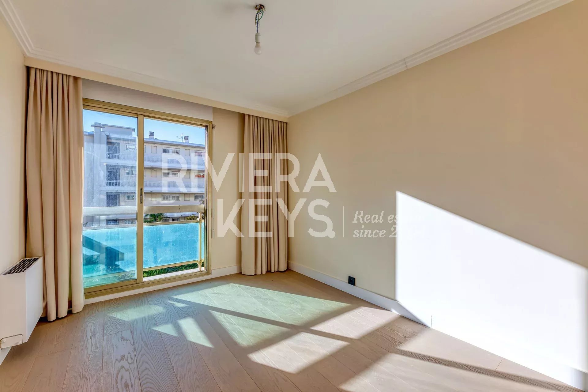 The apartment includes an entrance hall, a living room opening onto a pleasant terrace, 3 bedrooms with built-in wardrobes—two of which open onto a quiet balcony—an independent kitchen to be fitted, a shower room, a bathroom with WC, a dressing room, and a separate WC.