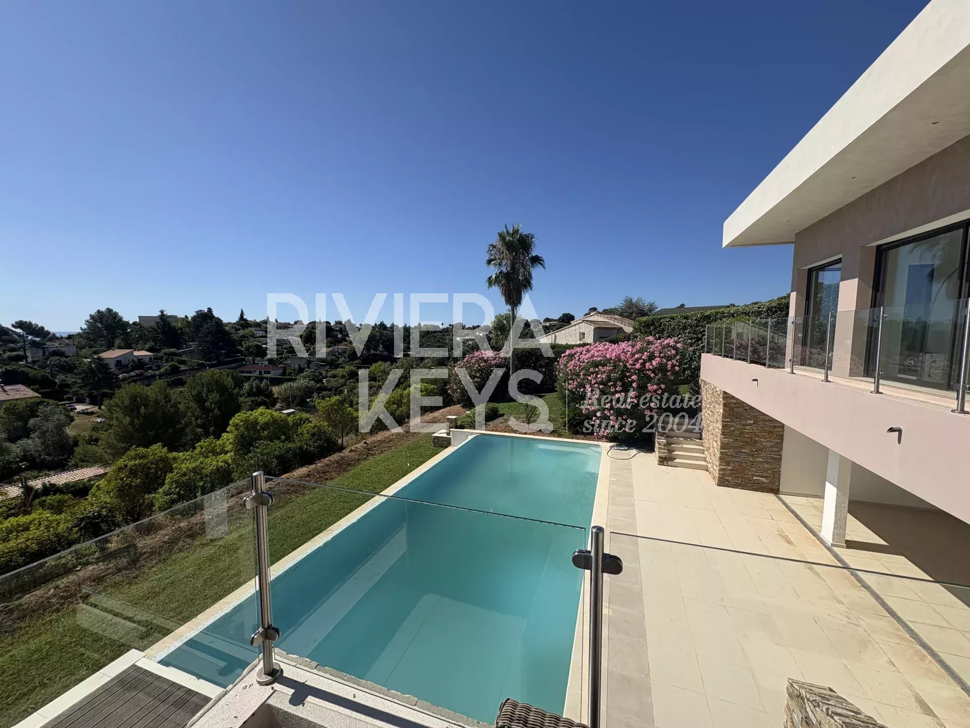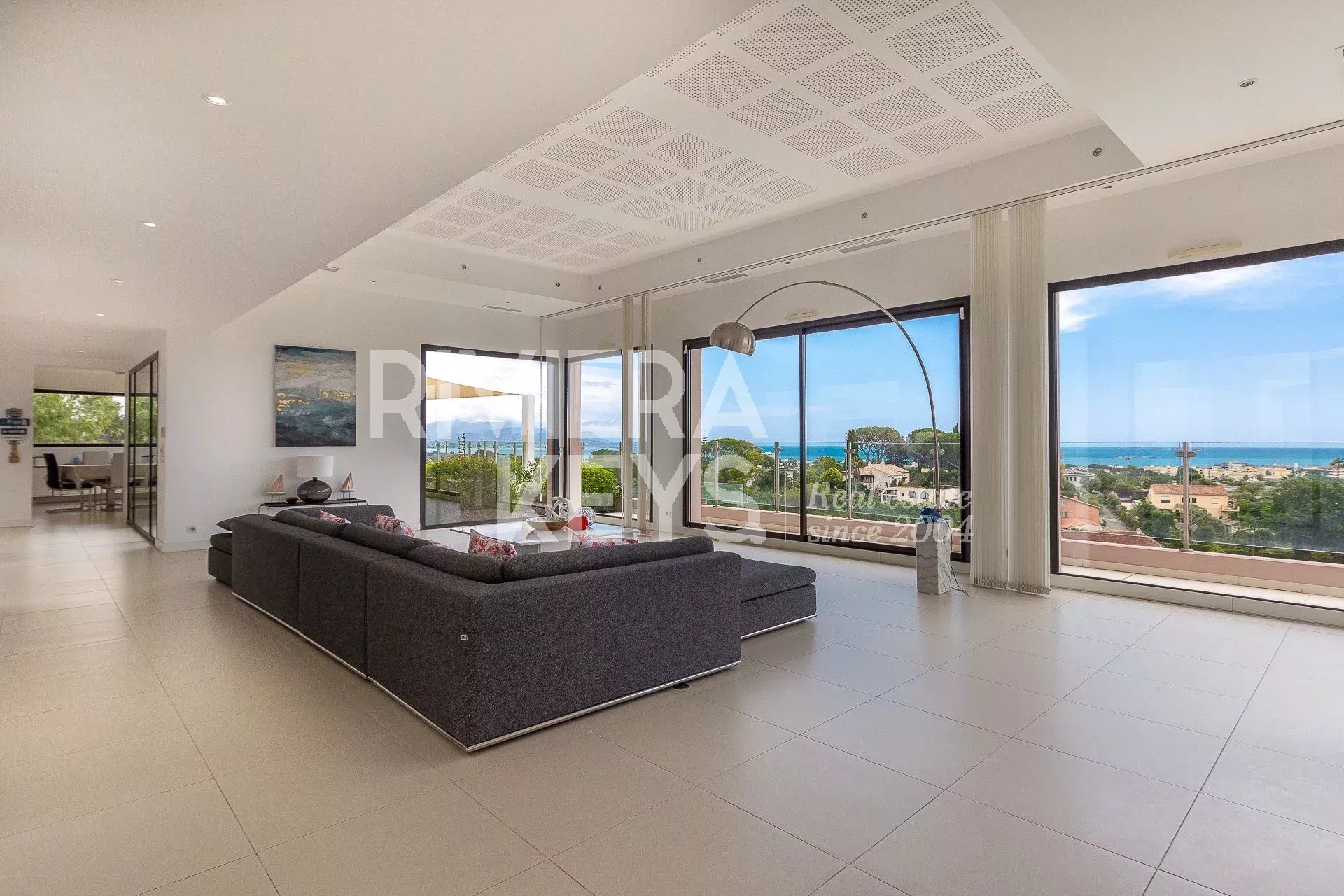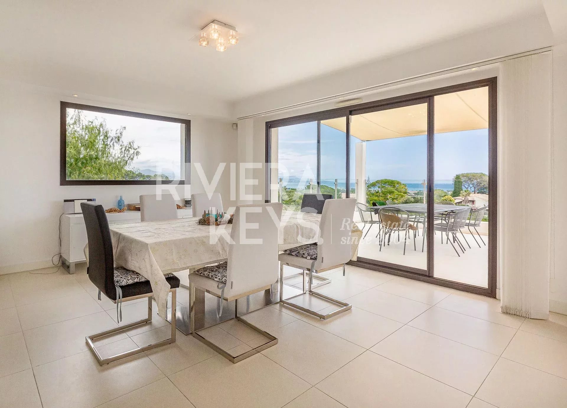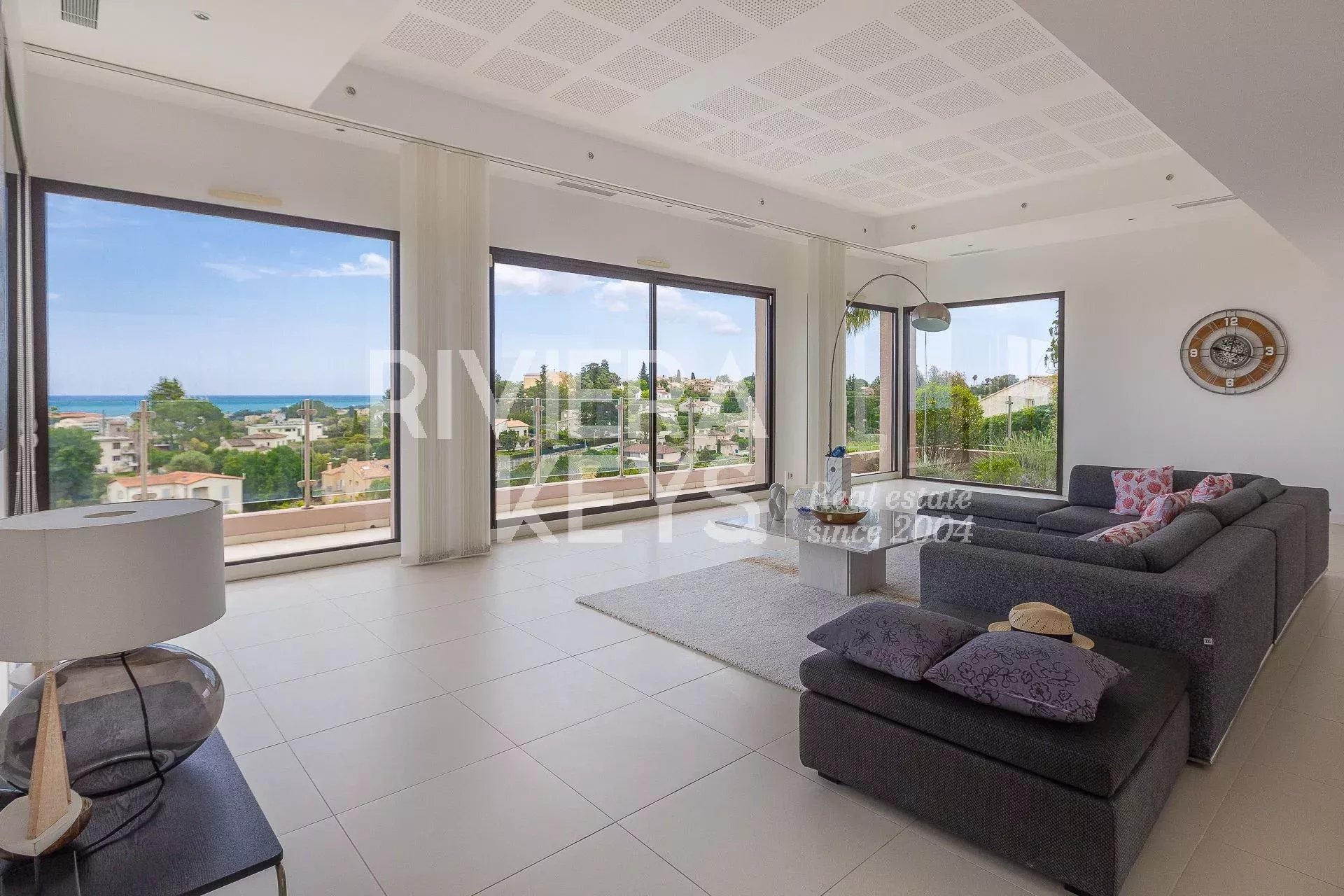 This modern-style villa, located in a secure private estate in Antibes, offers 240 sqm of living space and boasts panoramic views of the sea and surrounding landscape. Set on a 1,800 sqm plot, the property features a spacious, light-filled living room opening onto a terrace, a TV lounge, and four bedrooms, each with its own en-suite bathroom. The fully equipped kitchen also opens onto a terrace.