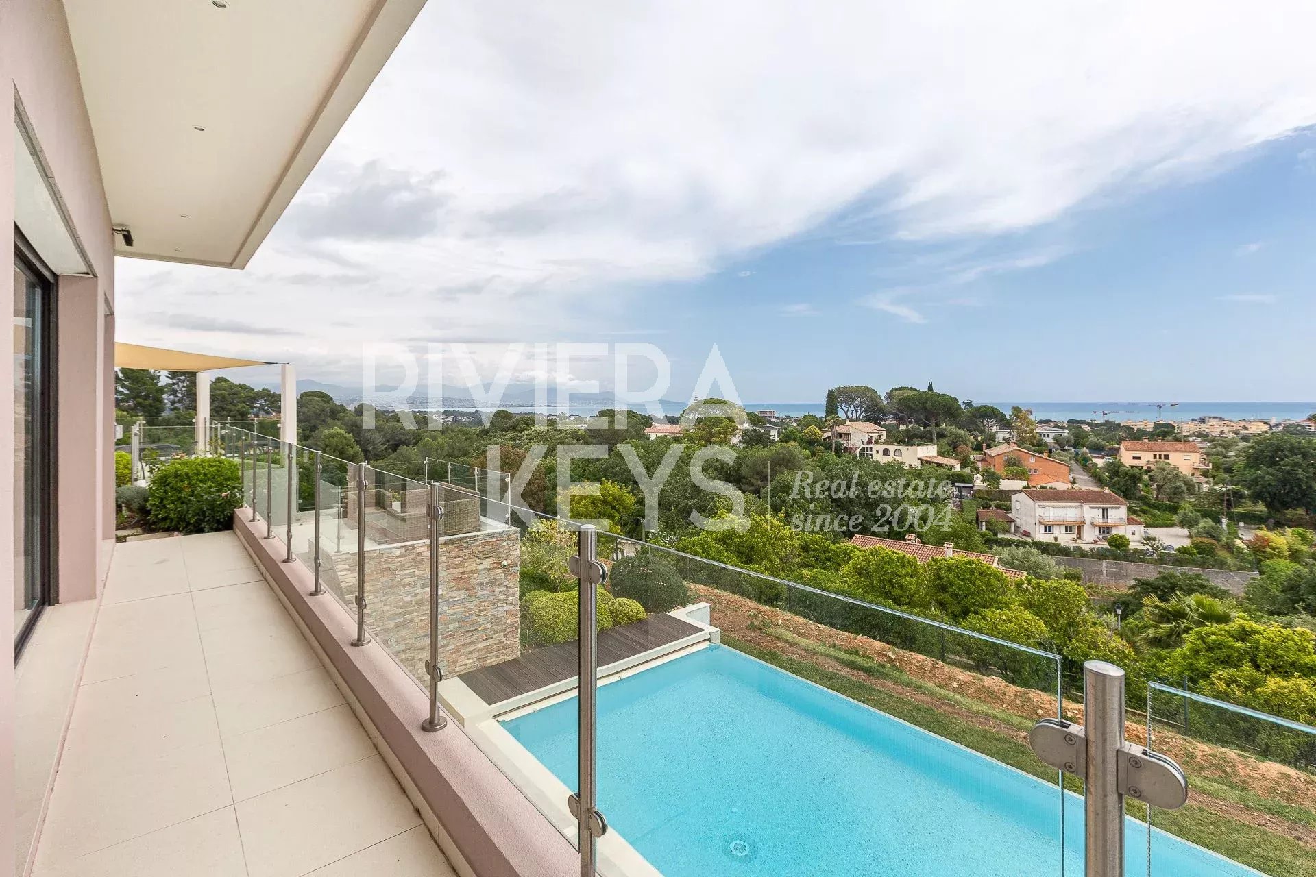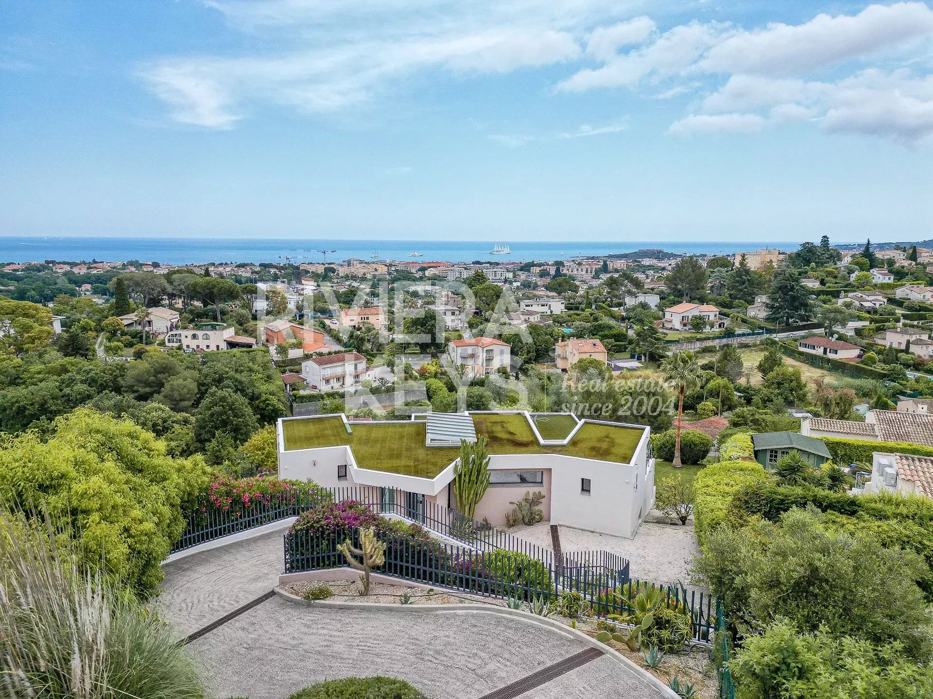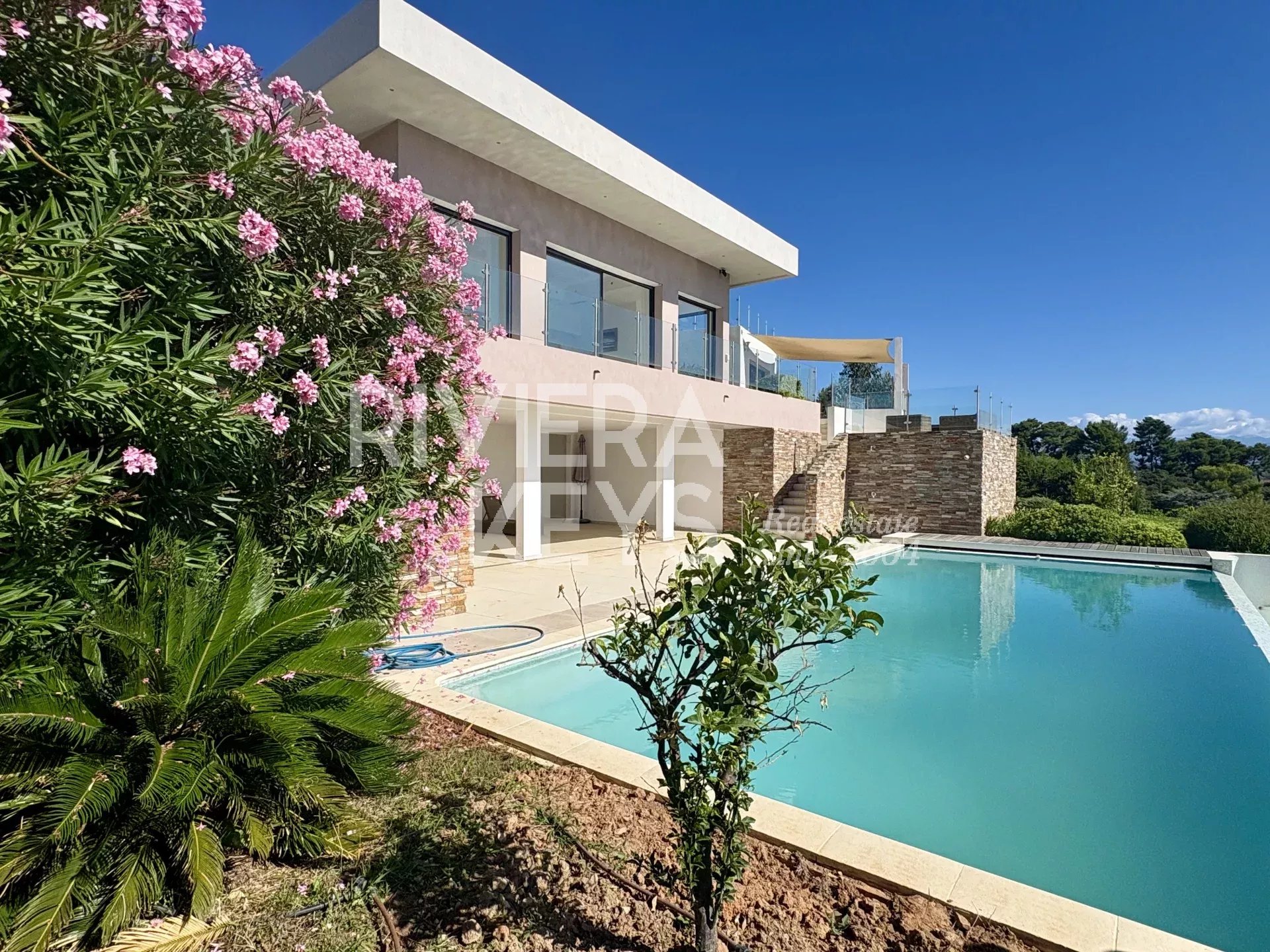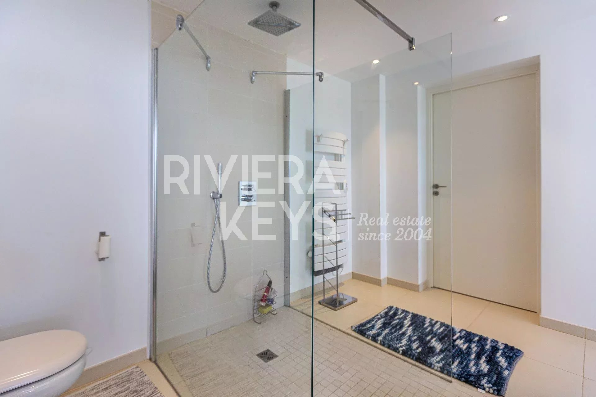 This modern-style villa, located in a secure private estate in Antibes, offers 240 sqm of living space and boasts panoramic views of the sea and surrounding landscape. Set on a 1,800 sqm plot, the property features a spacious, light-filled living room opening onto a terrace, a TV lounge, and four bedrooms, each with its own en-suite bathroom. The fully equipped kitchen also opens onto a terrace.