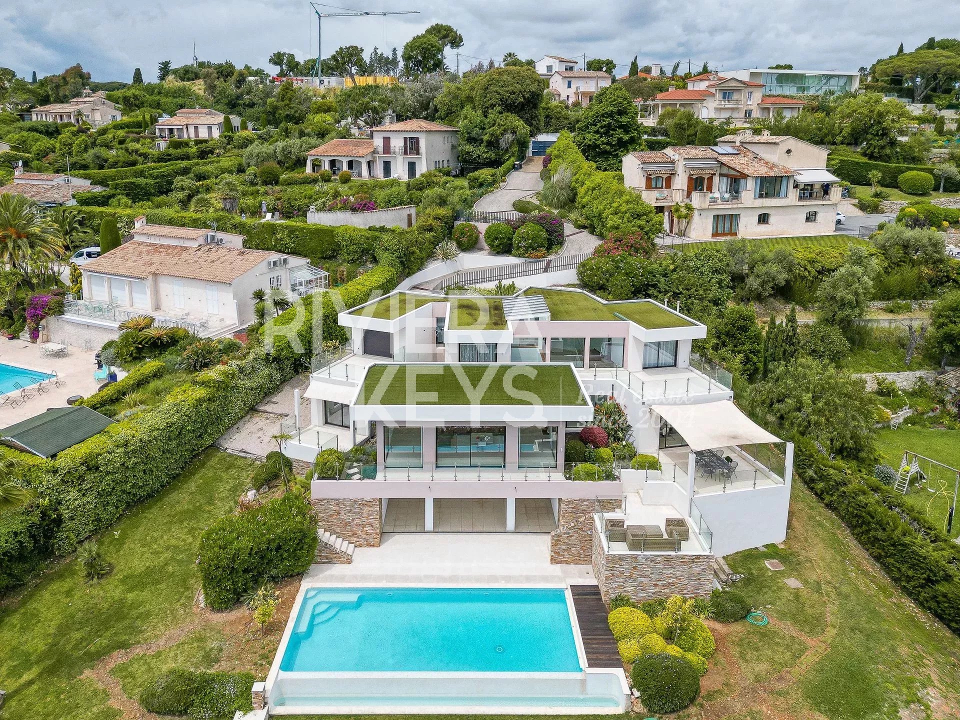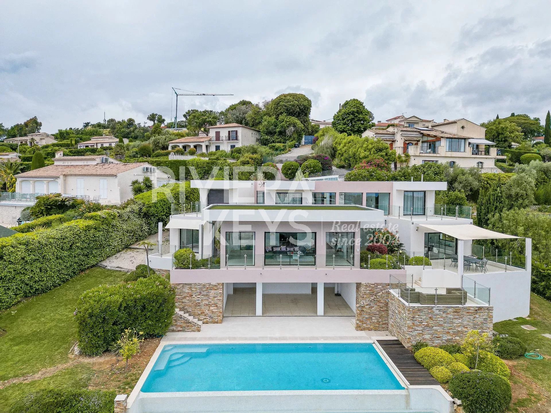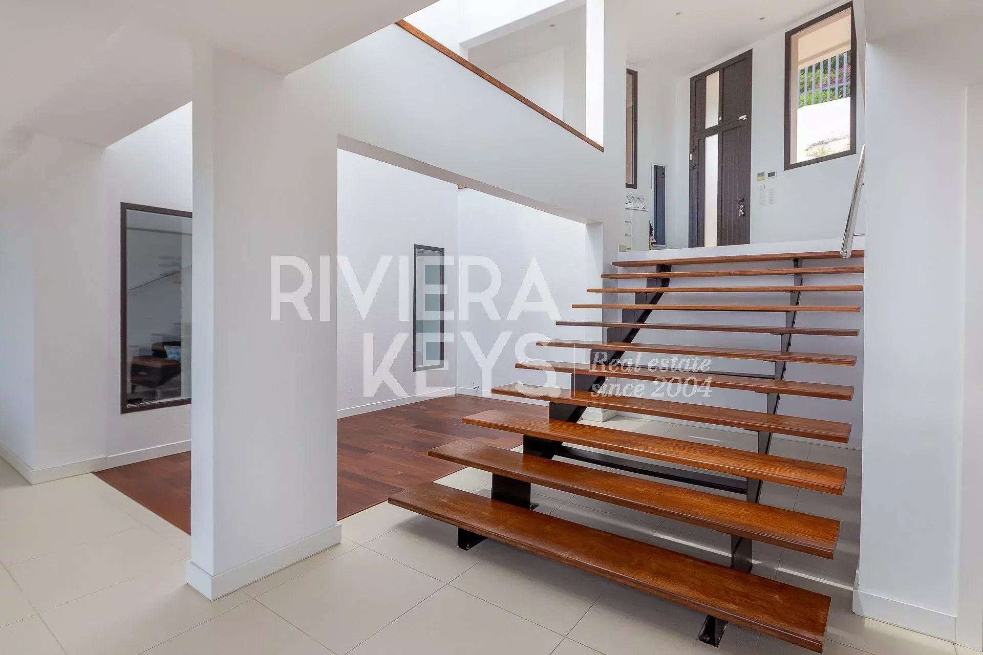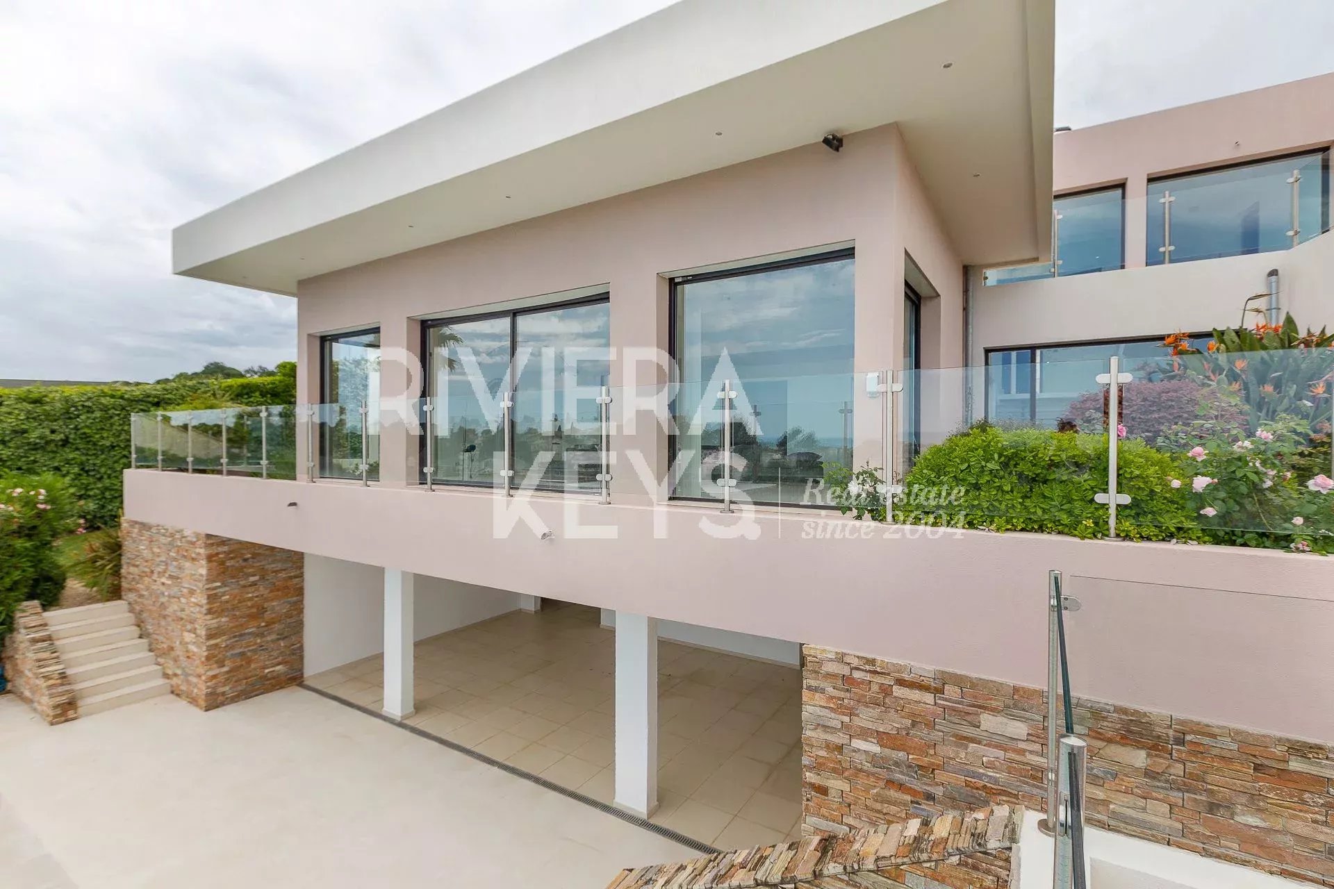 This modern-style villa, located in a secure private estate in Antibes, offers 240 sqm of living space and boasts panoramic views of the sea and surrounding landscape. Set on a 1,800 sqm plot, the property features a spacious, light-filled living room opening onto a terrace, a TV lounge, and four bedrooms, each with its own en-suite bathroom. The fully equipped kitchen also opens onto a terrace.