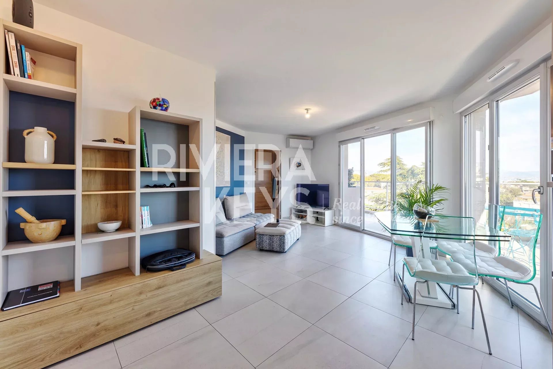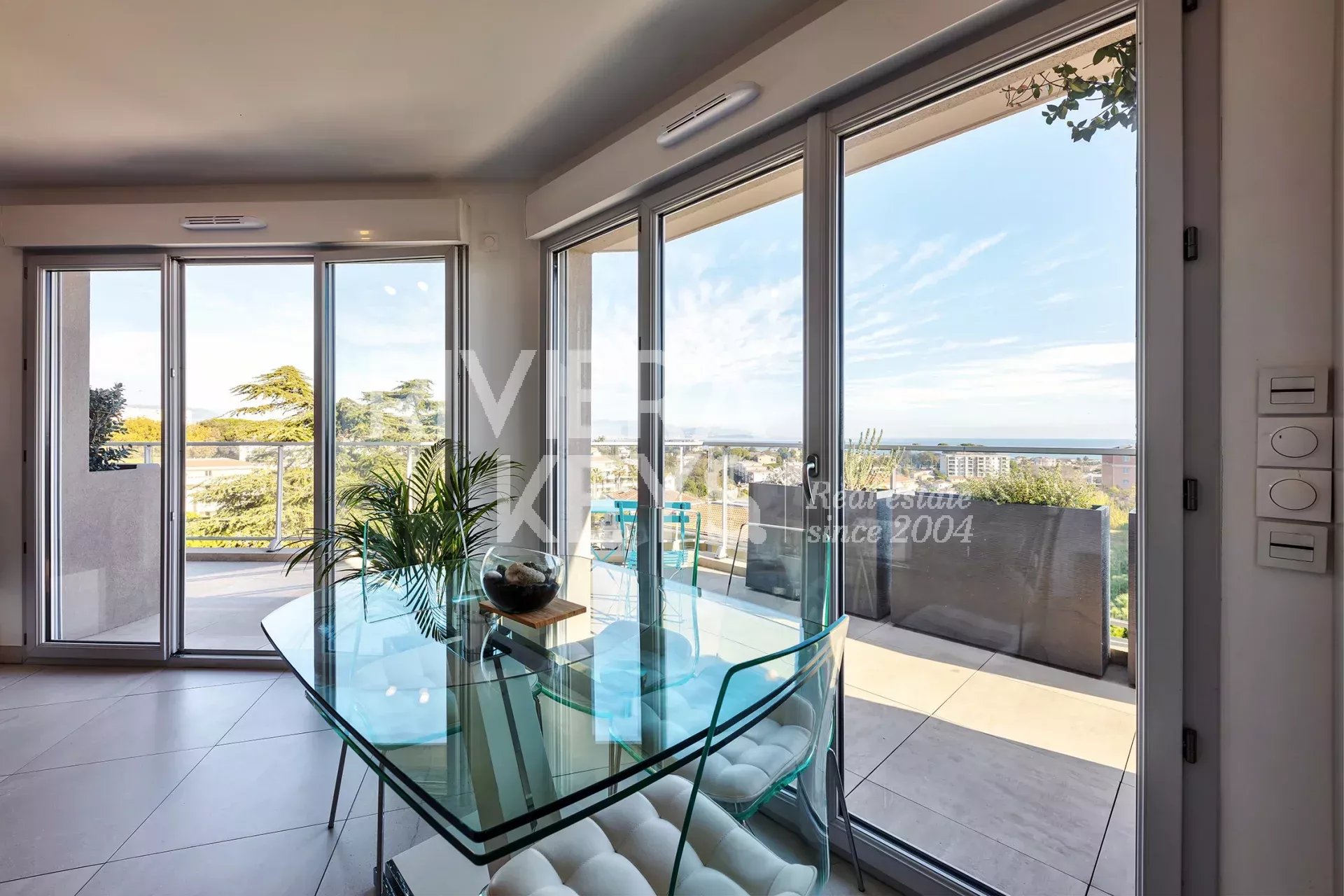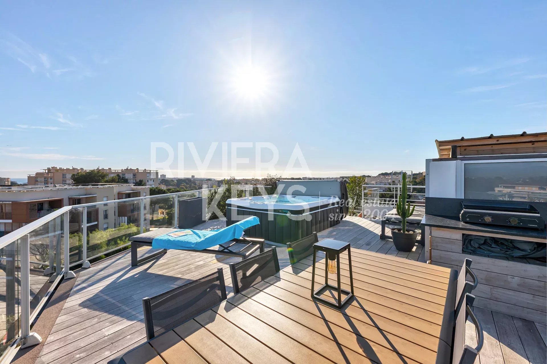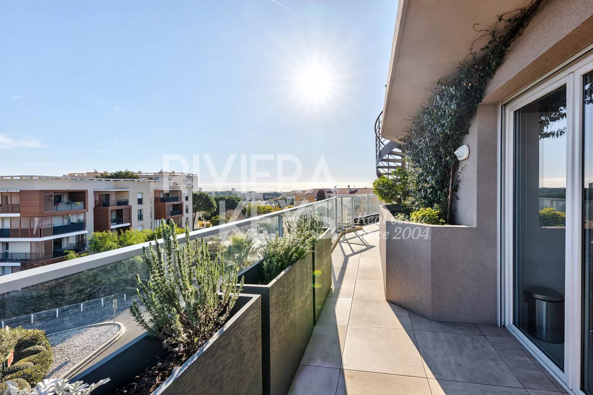 SOUS OFFRE ACCEPTEE .Dans le secteur prisé des Combes à Antibes, ce superbe appartement de 3 pièces, situé au dernier étage d'une petite résidence de standing récente, offre un cadre exceptionnel. Bénéficiant d'une climatisation intégrée, il se compose d'un séjour lumineux avec une cuisine ouverte entièrement équipée, de 2 chambres, chacune dotée d'une salle d'eau dont une avec WC, d'une terrasse de plain-pied et d'un vaste solarium de plus de 50 m². Ce dernier révèle une vue imprenable sur la Méditerranée et les montagnes environnantes.