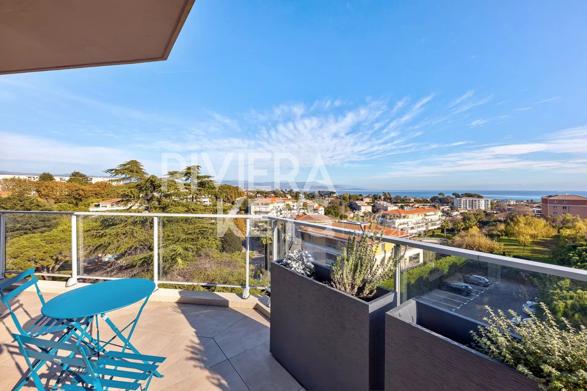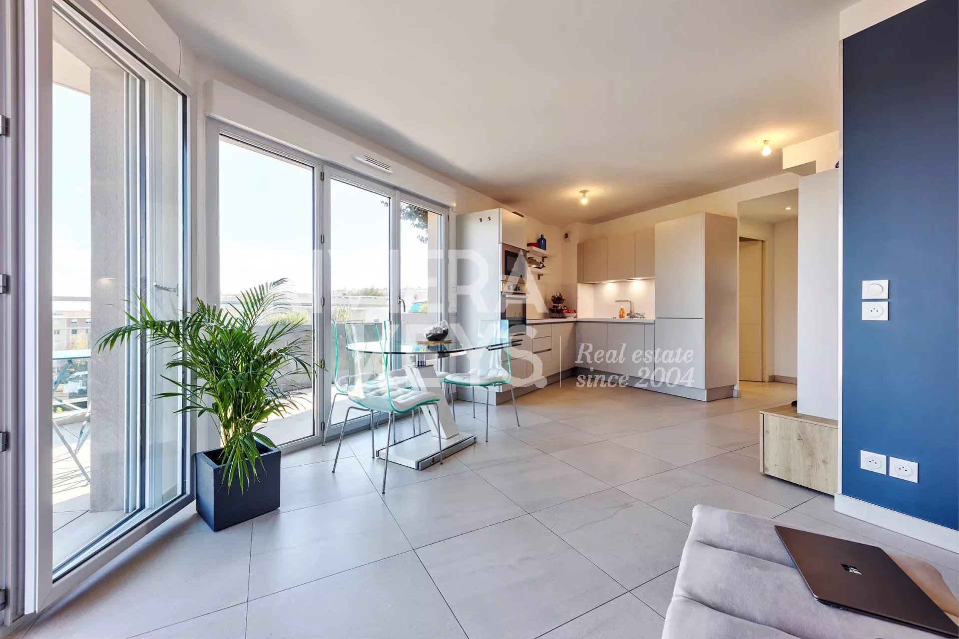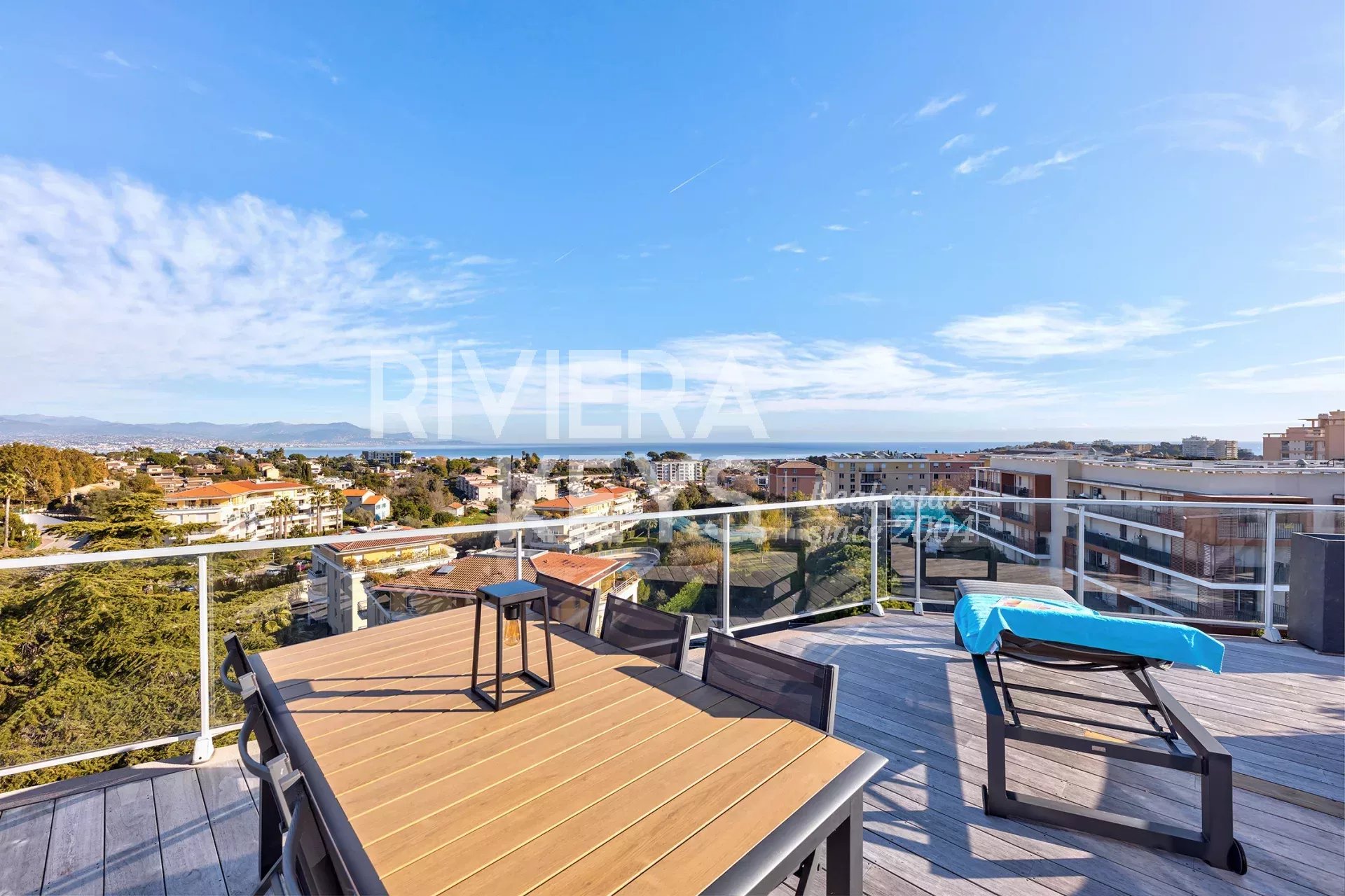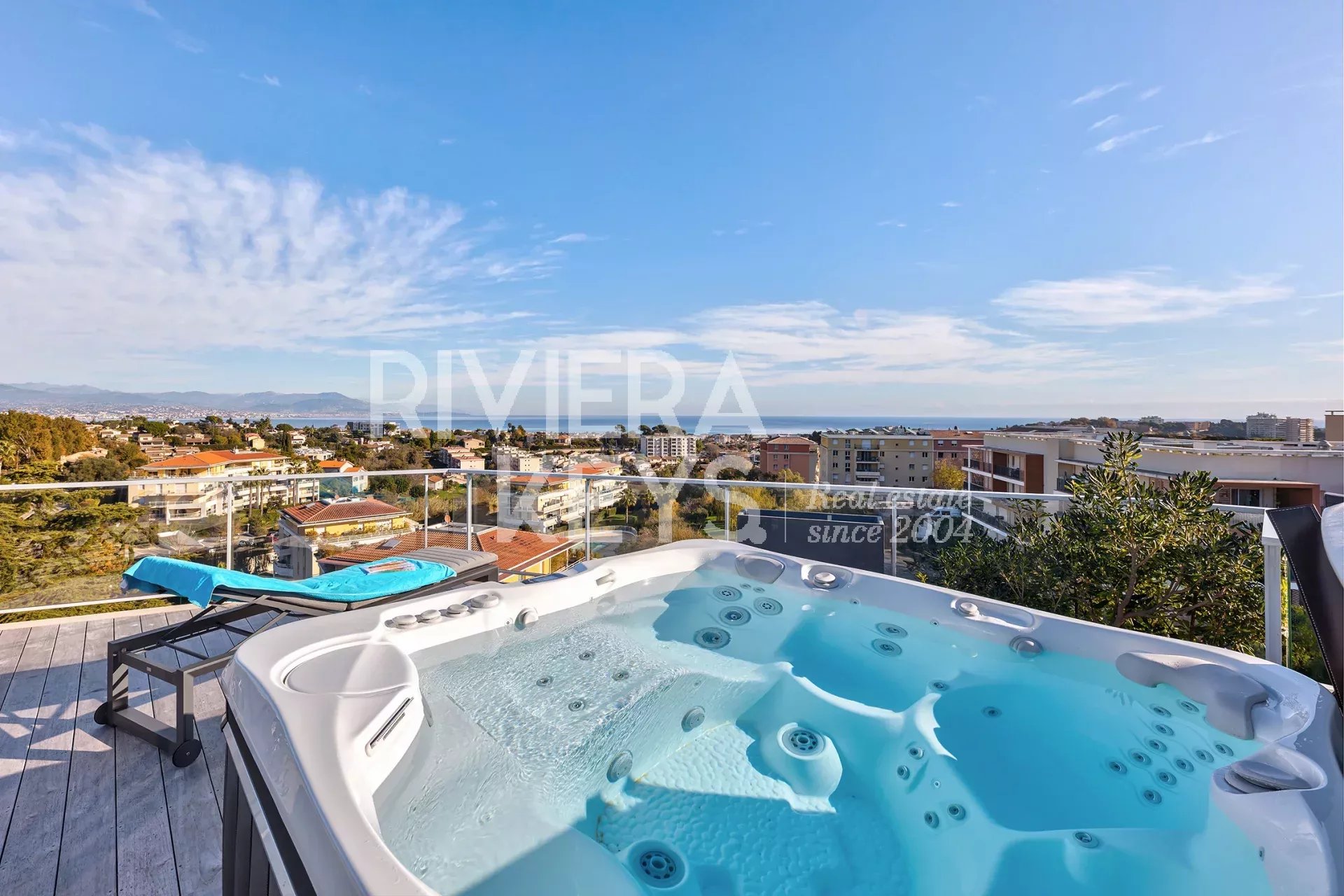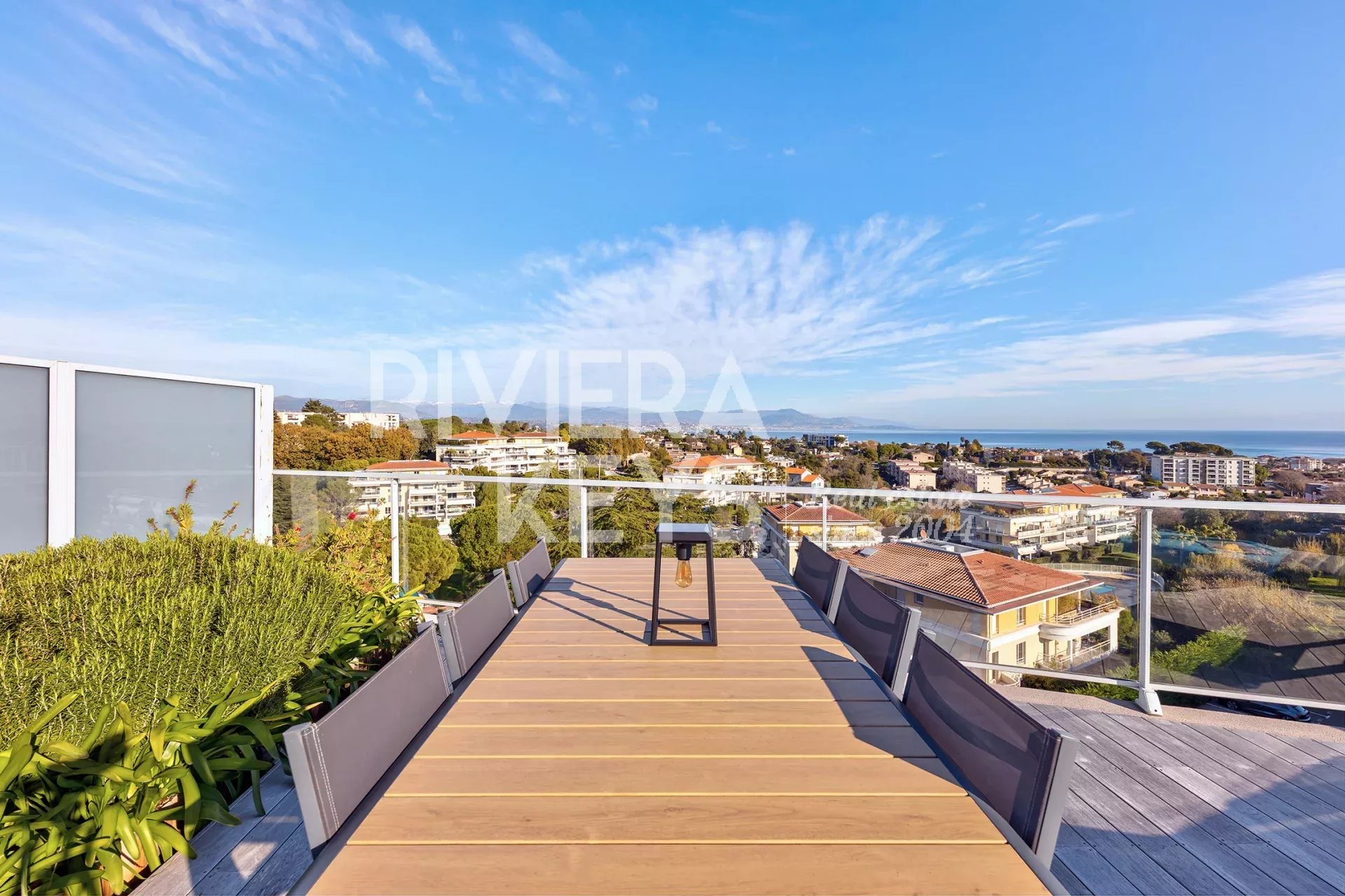 SOUS OFFRE ACCEPTEE .Dans le secteur prisé des Combes à Antibes, ce superbe appartement de 3 pièces, situé au dernier étage d'une petite résidence de standing récente, offre un cadre exceptionnel. Bénéficiant d'une climatisation intégrée, il se compose d'un séjour lumineux avec une cuisine ouverte entièrement équipée, de 2 chambres, chacune dotée d'une salle d'eau dont une avec WC, d'une terrasse de plain-pied et d'un vaste solarium de plus de 50 m². Ce dernier révèle une vue imprenable sur la Méditerranée et les montagnes environnantes.