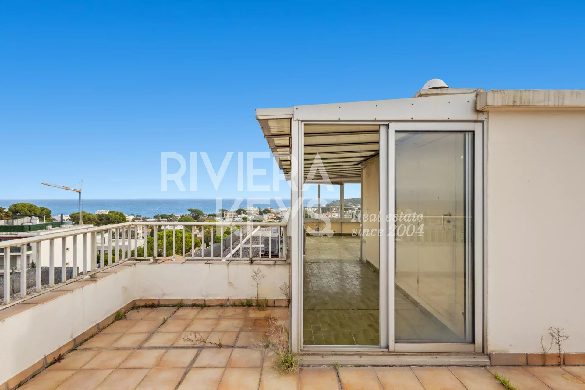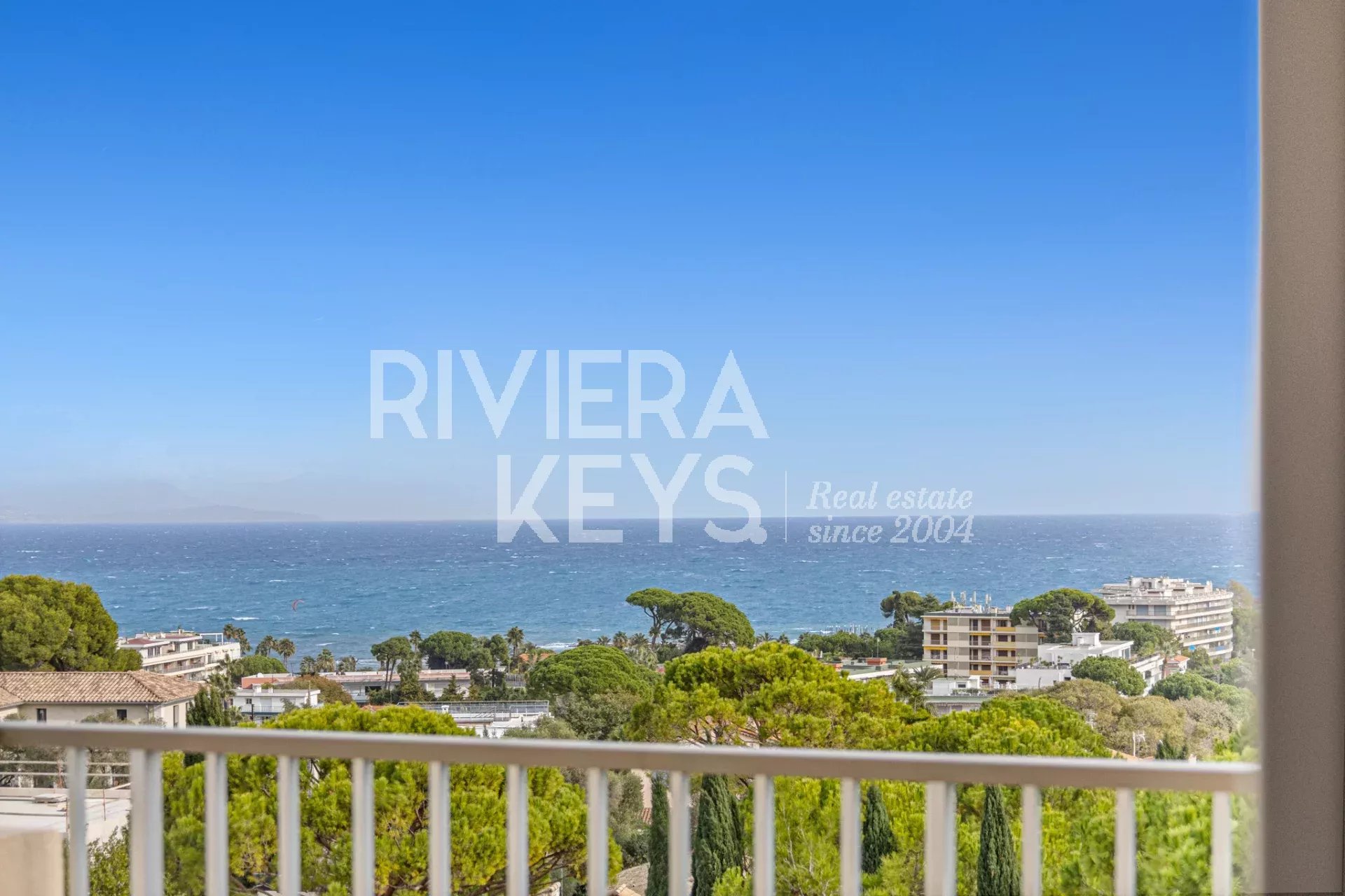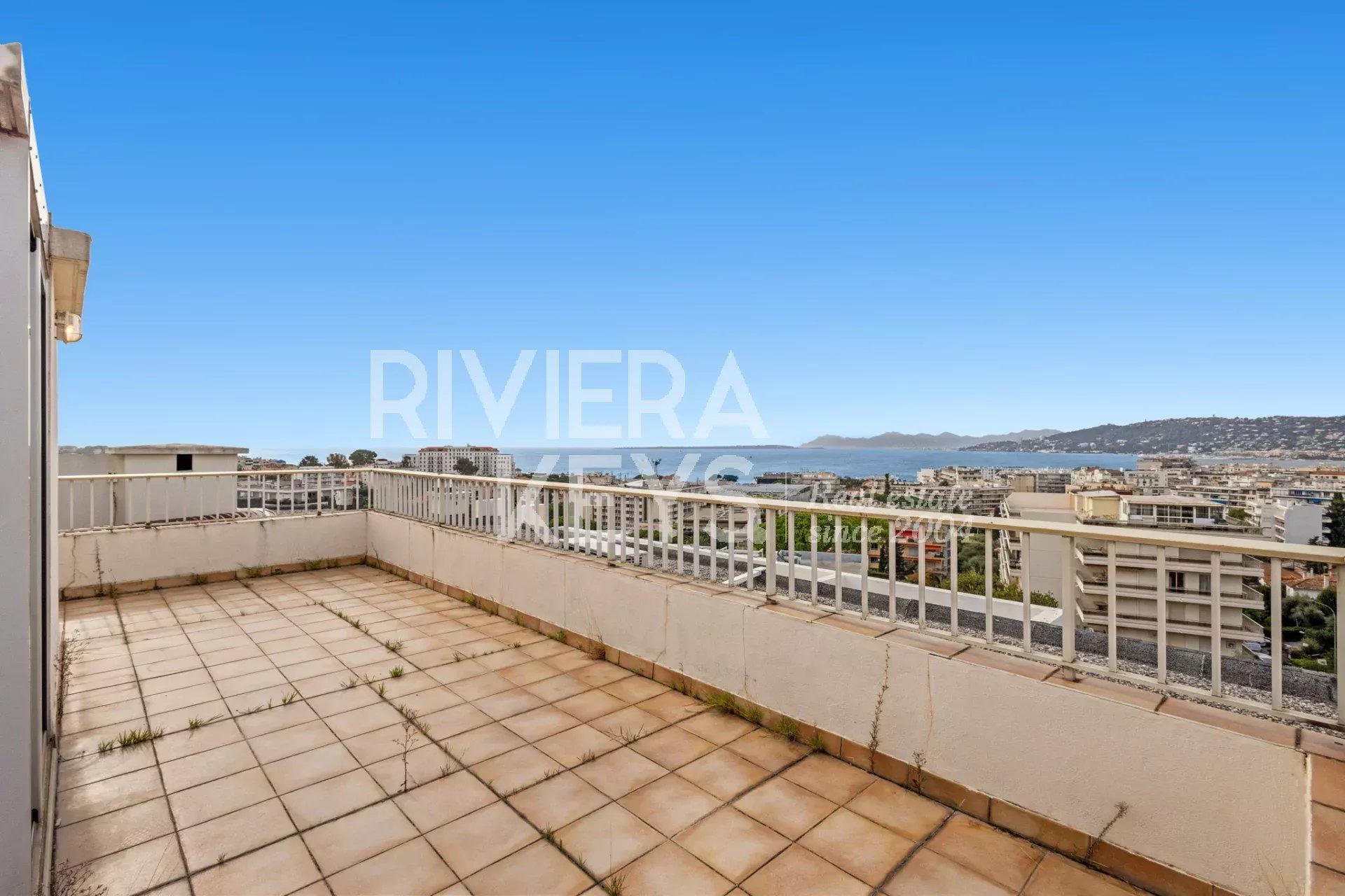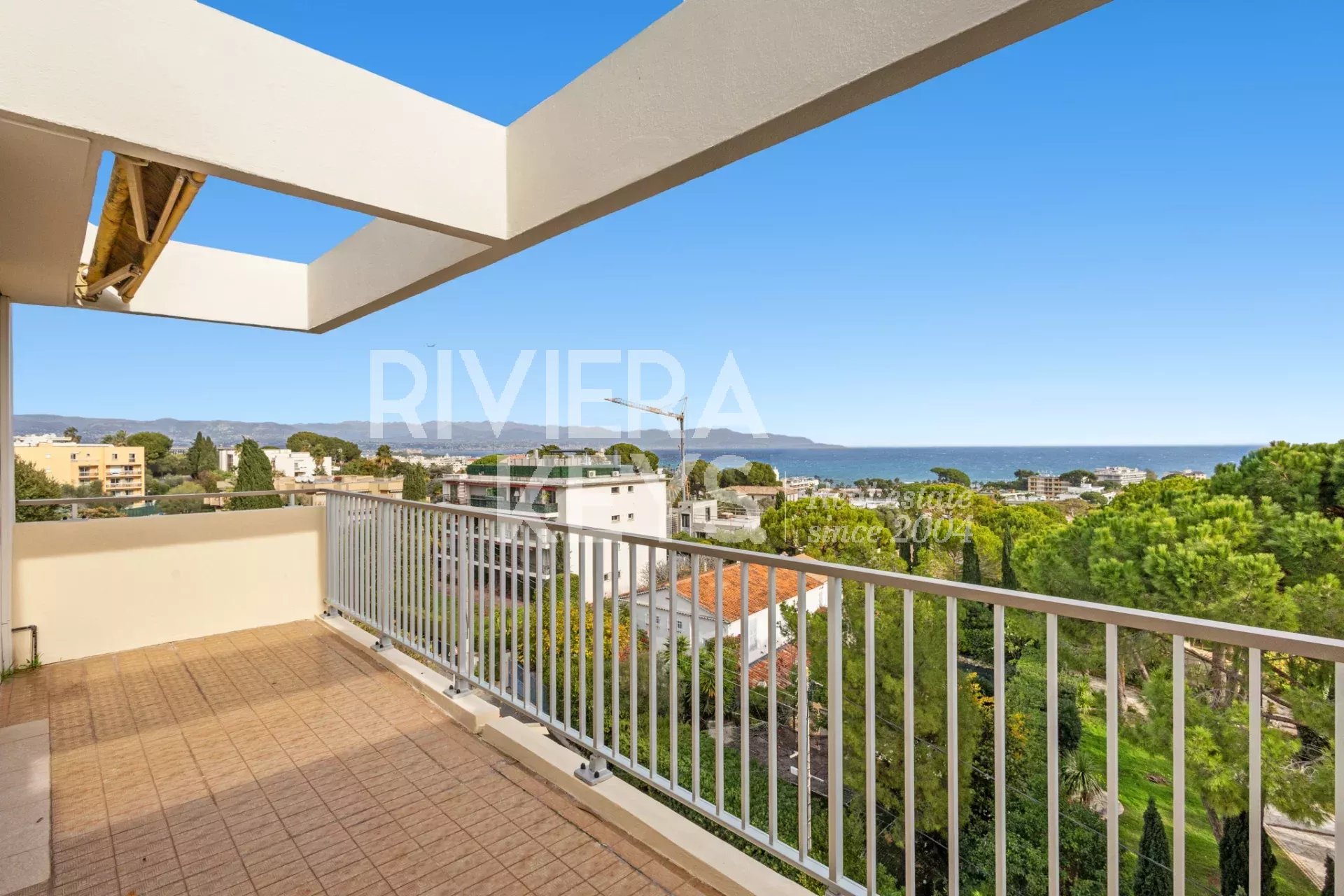 Situé au dernier étage d’une petite résidence, il offre plus de 100 m² habitables et une vue mer spectaculaire à 360° sur Antibes, Juan-les-Pins et les îles de Lérins.