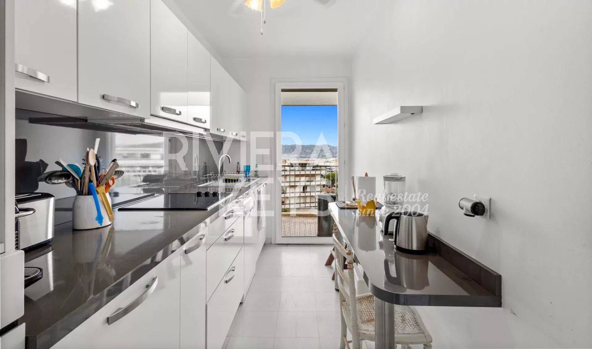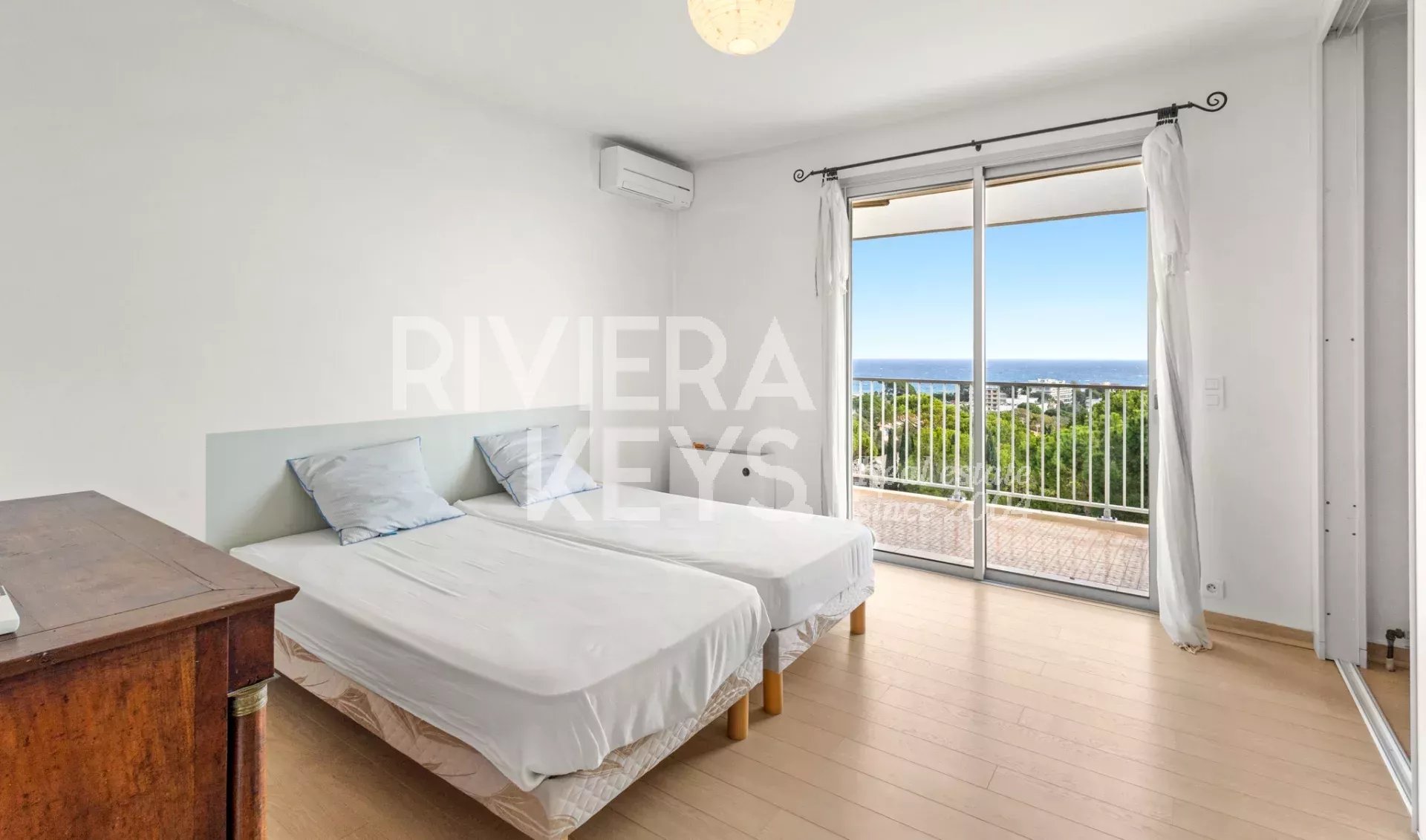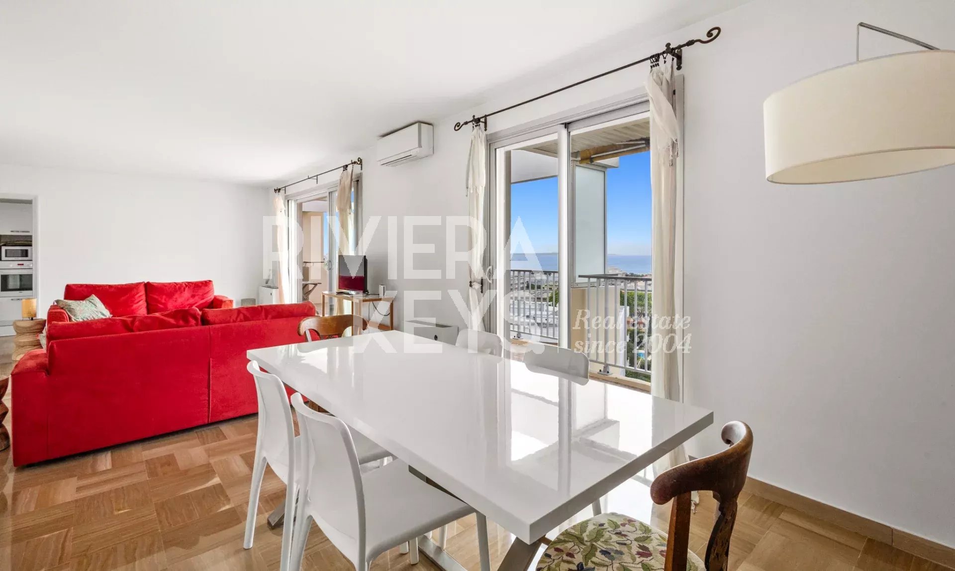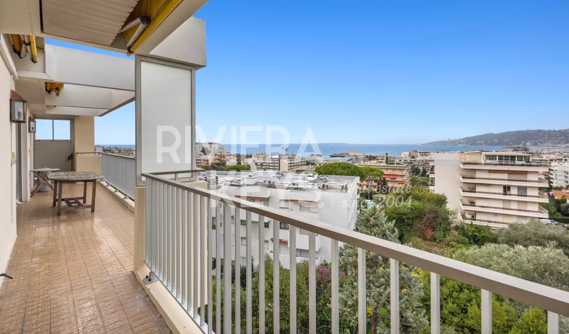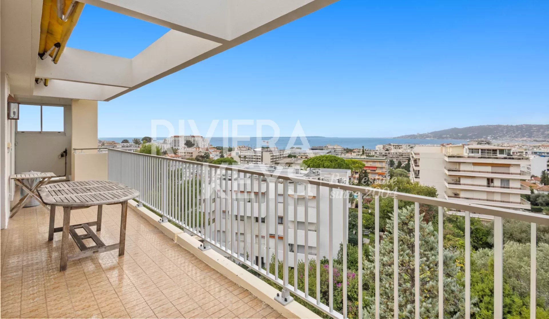 Situé au dernier étage d’une petite résidence, il offre plus de 100 m² habitables et une vue mer spectaculaire à 360° sur Antibes, Juan-les-Pins et les îles de Lérins.