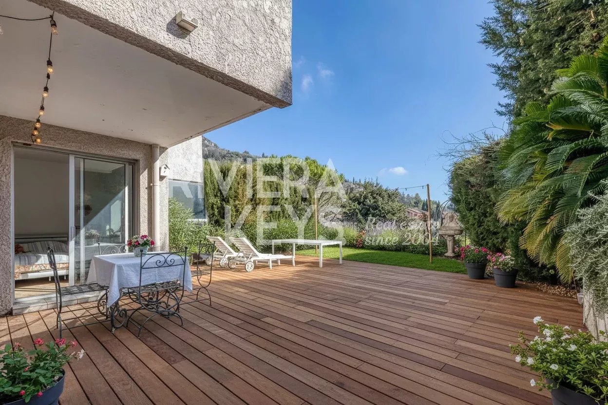 L’ensemble des pièces principales s’ouvre sur une superbe terrasse d’environ 100 m², en partie couverte. Un véritable prolongement du séjour, idéal pour les repas en extérieur, les moments de détente face aux Baous.