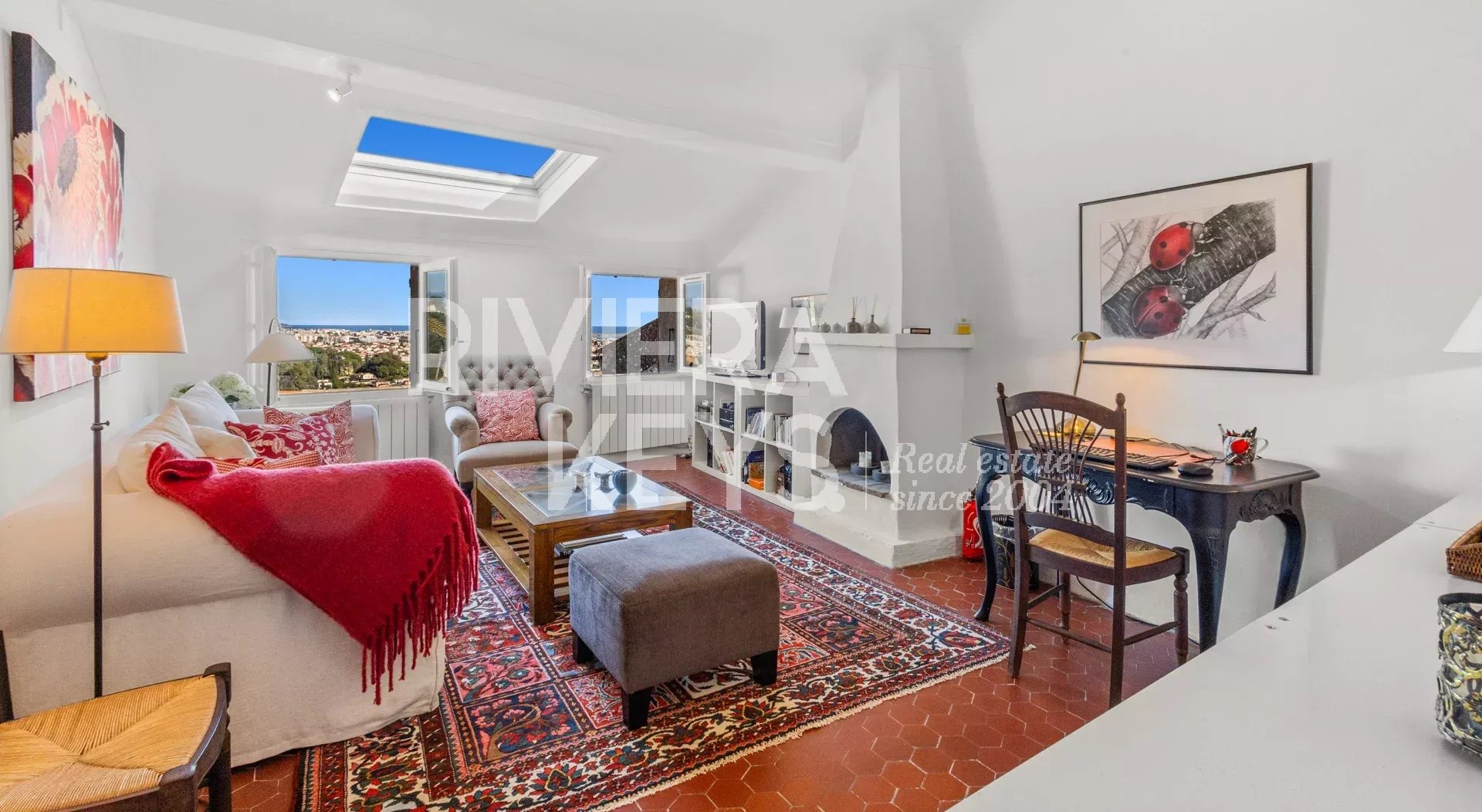 - Au troisième étage, une autre grande chambre, ainsi qu’un salon avec cheminée et vue sur la mer.
