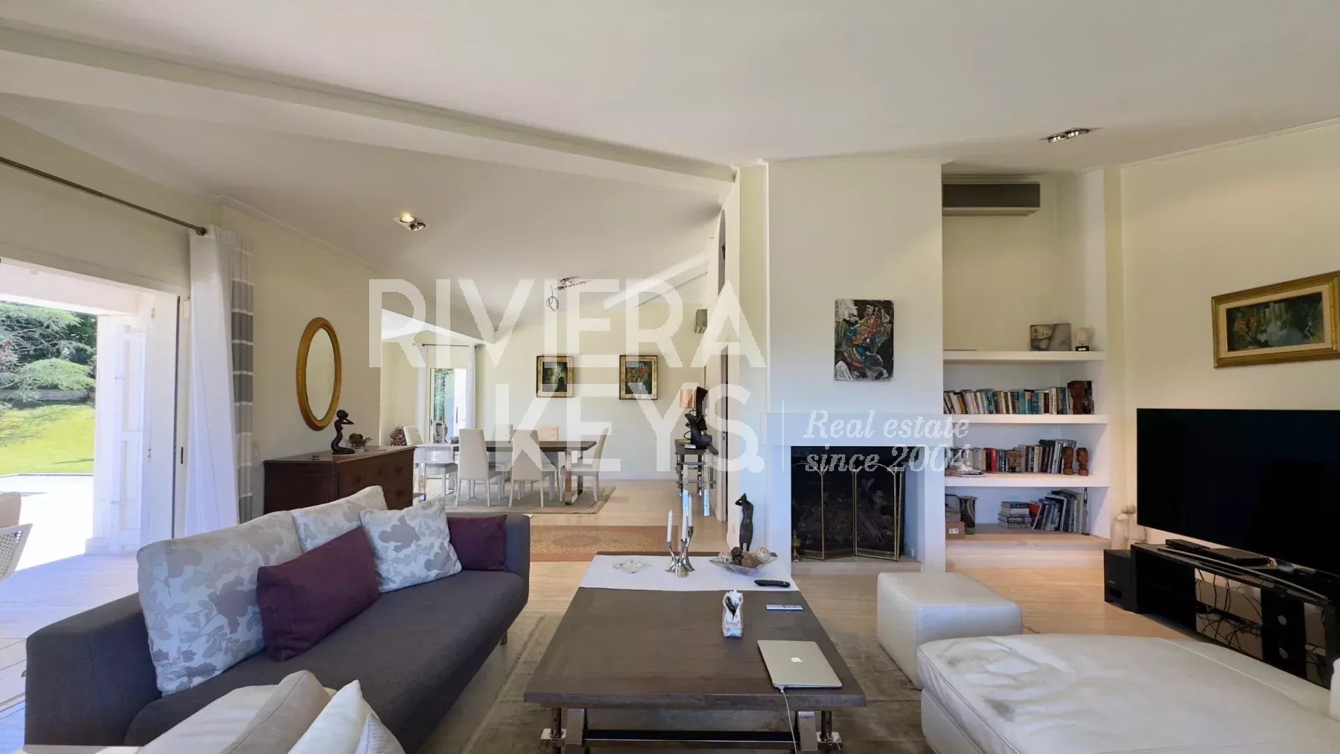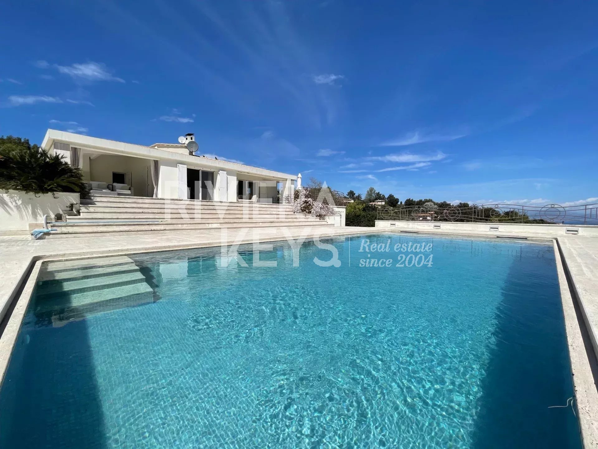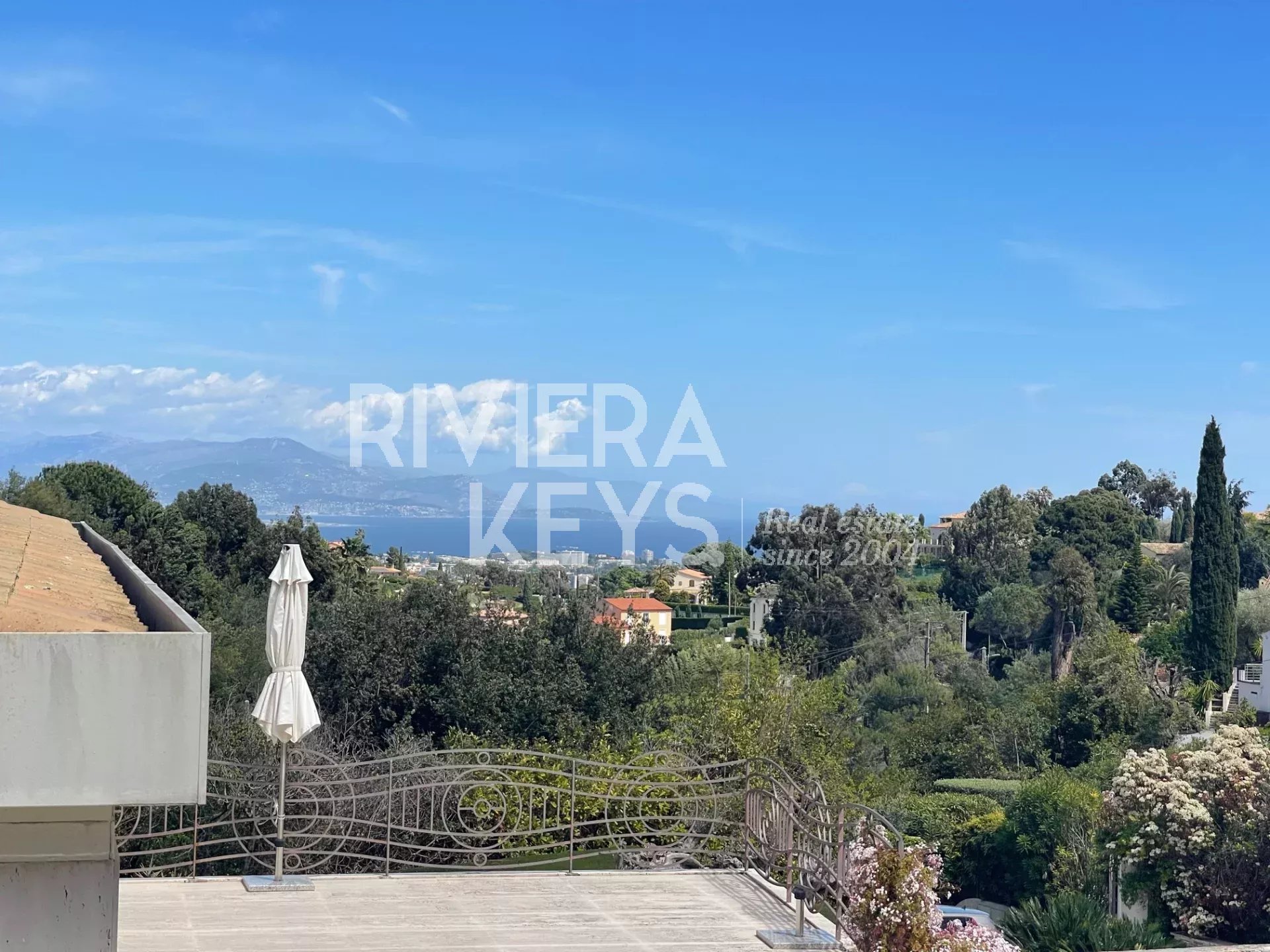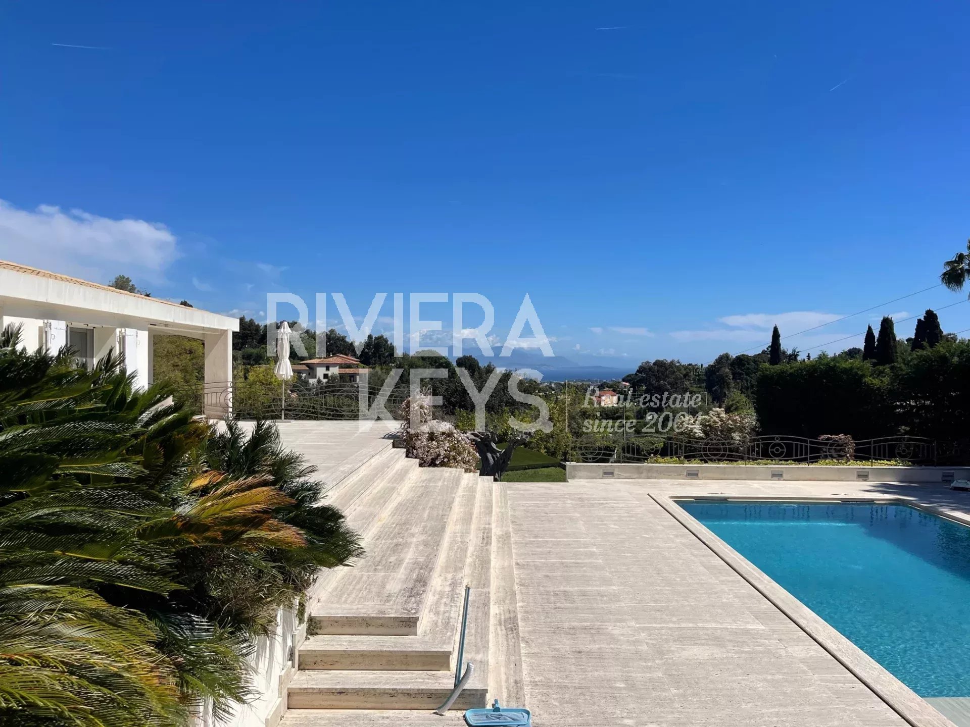 Depuis le salon et les grandes terrasses, on peut profiter d’une agréable vue sur la mer et apercevoir le bleu intense de la Riviera, apportant une touche méditerranéenne très appréciable au quotidien.