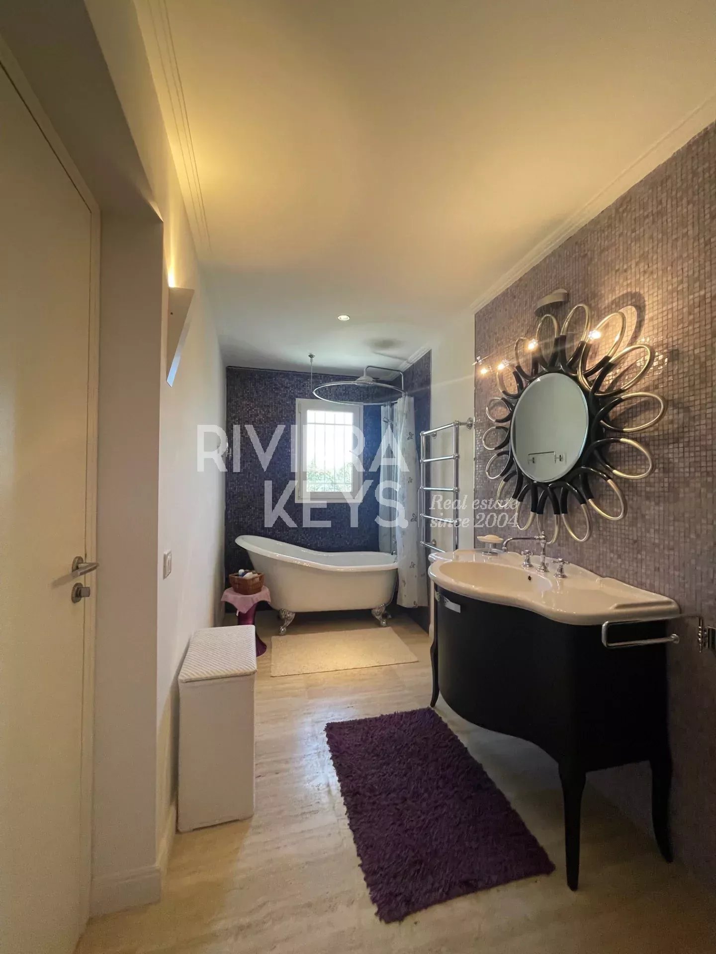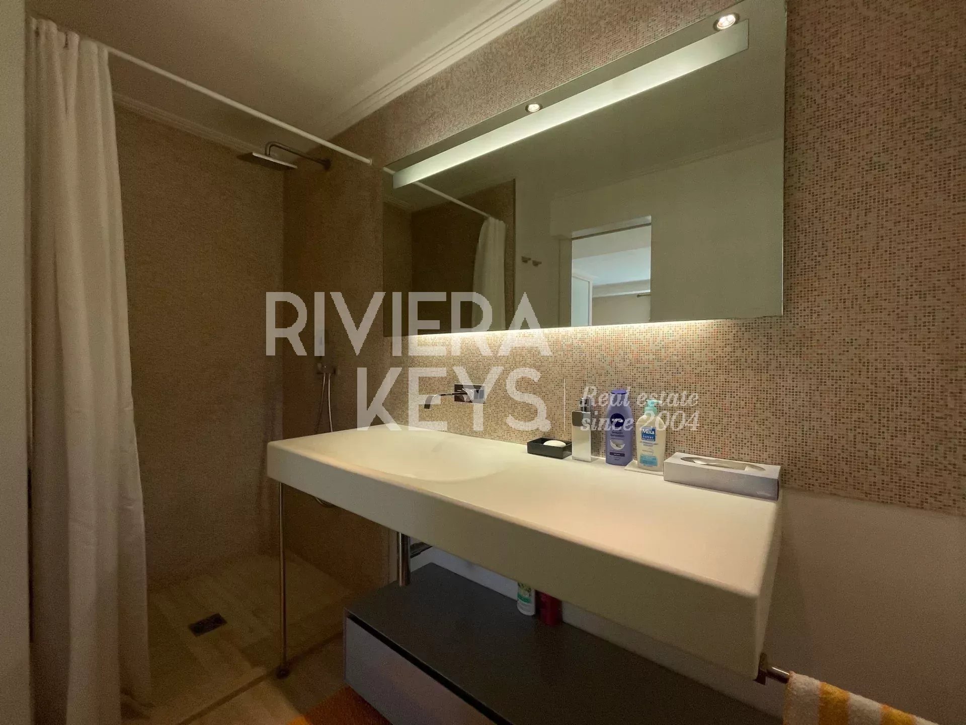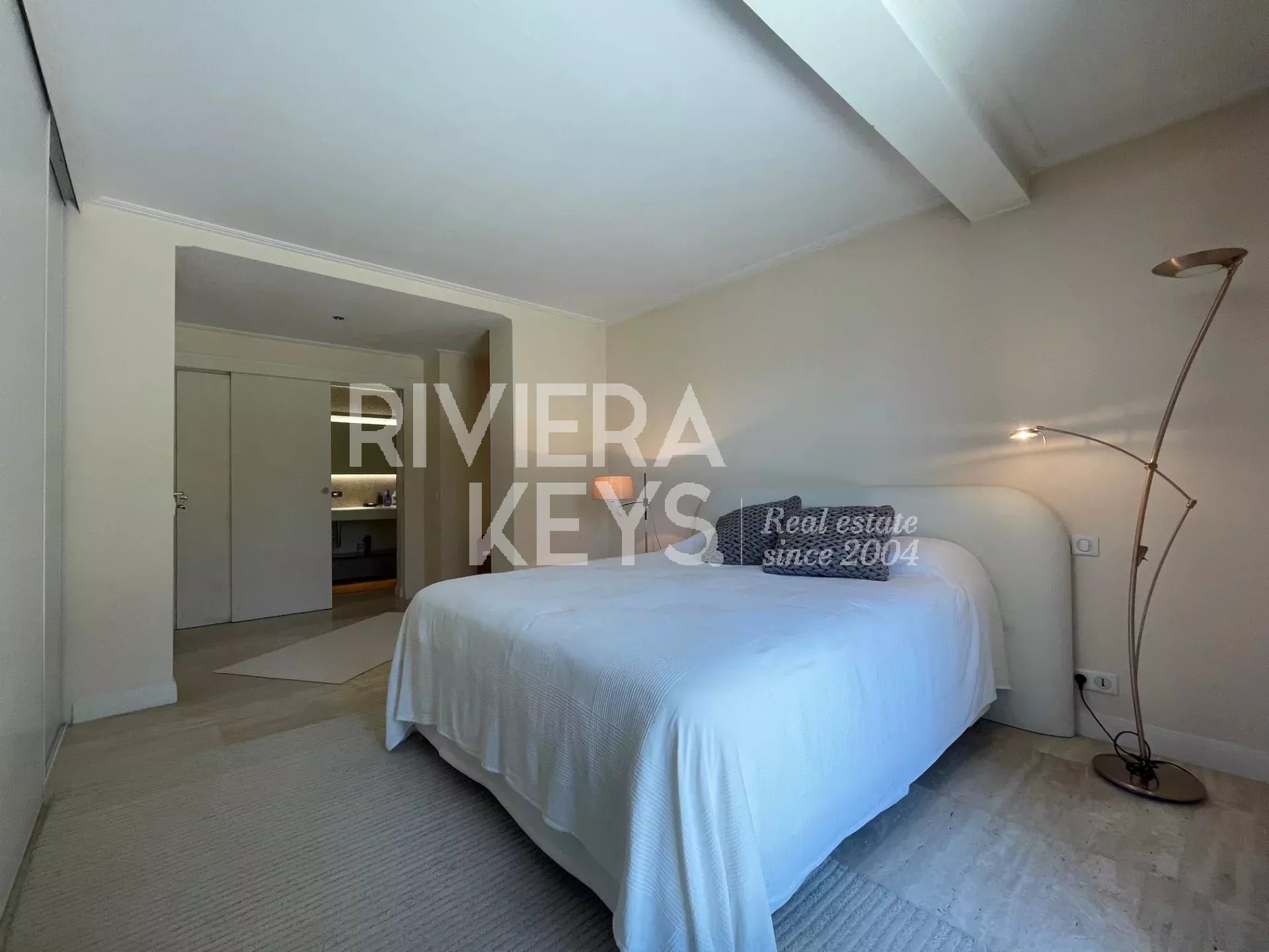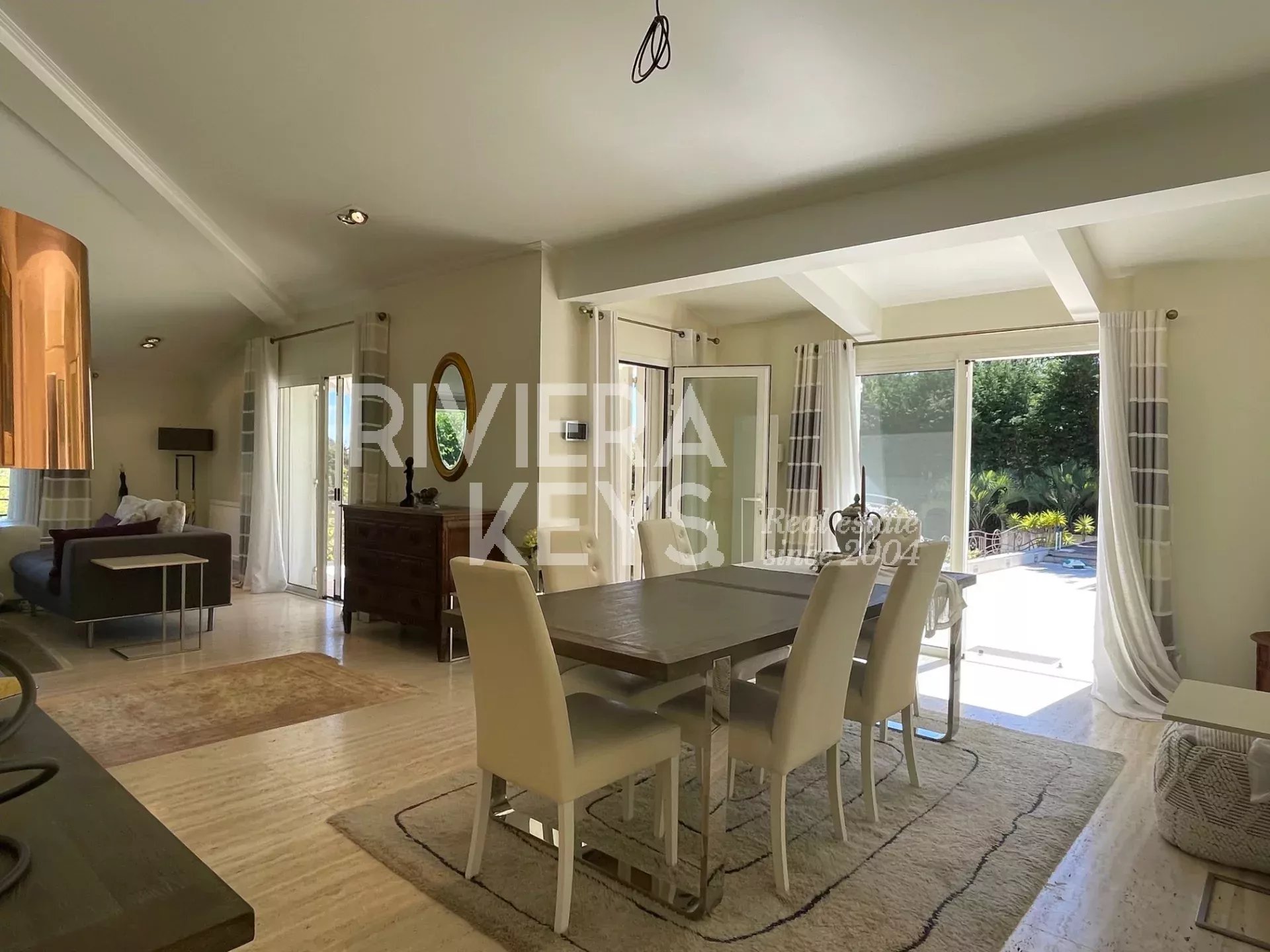 Depuis le salon et les grandes terrasses, on peut profiter d’une agréable vue sur la mer et apercevoir le bleu intense de la Riviera, apportant une touche méditerranéenne très appréciable au quotidien.