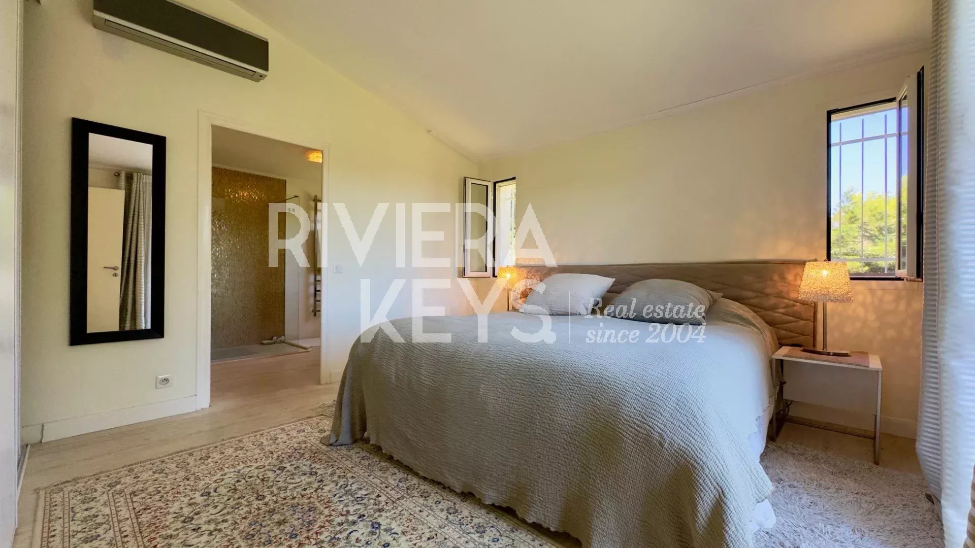 La suite parentale bénéficie d'une salle de bains privative ainsi que d'une terrasse privée avec vue dégagée sur les environs. Trois autres chambres, deux salles de bains, un grand dressing, une buanderie et une pièce de stockage complètent la partie nuit.