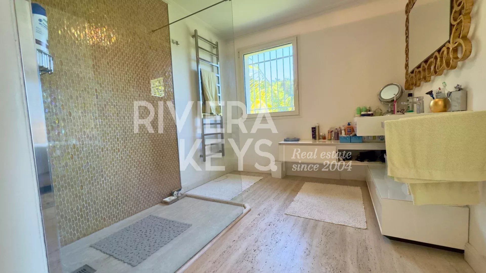 Un atout exceptionnel : les sols de la villa, ainsi que les aménagements extérieurs, sont revêtus de grandes dalles de travertin en provenance d’Italie, conférant à l’ensemble une élégance intemporelle et une grande unité visuelle.