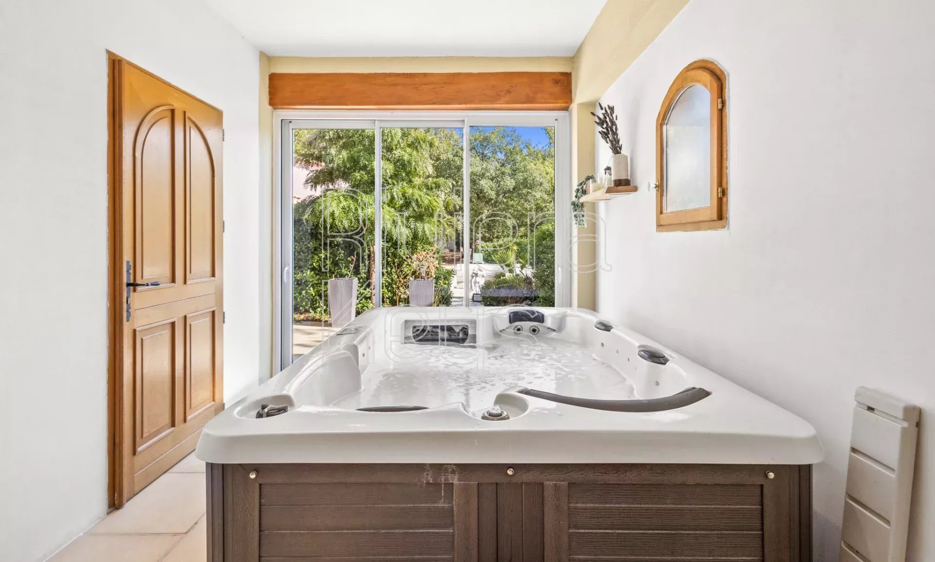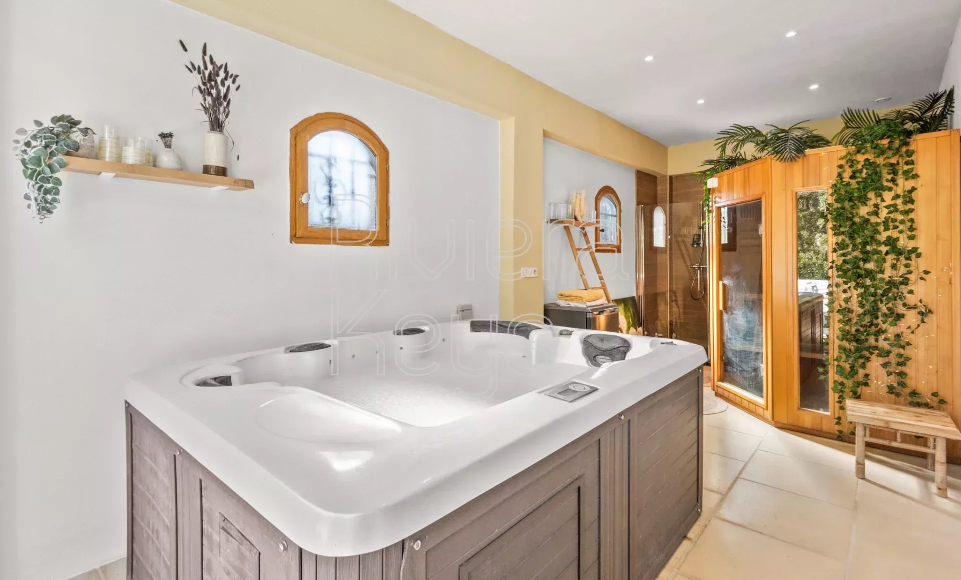 Les extérieurs sont pensés pour le confort et la détente : une belle piscine entourée de terrasses, un spa avec jacuzzi, un terrain arboré de 3 000 m², ainsi qu’un petit chalet servant de rangement pour le mobilier d’été.