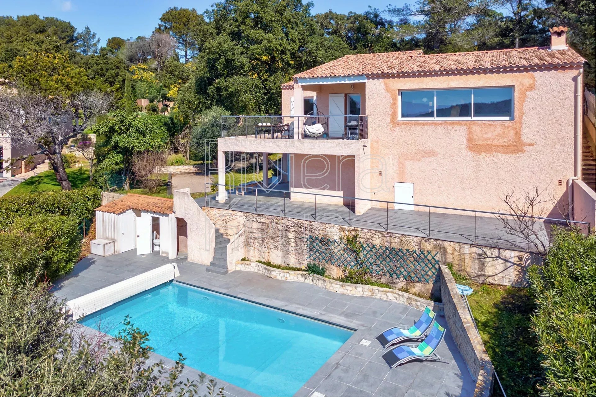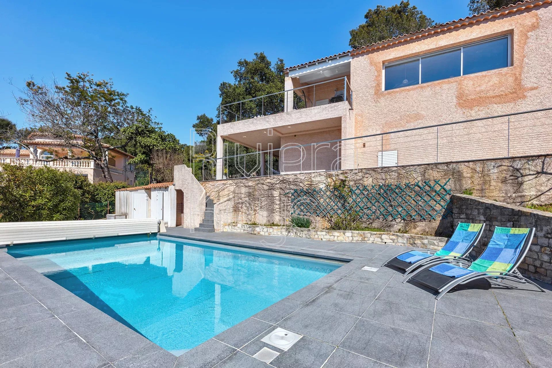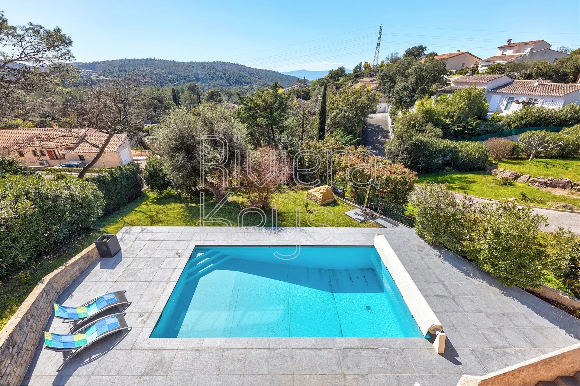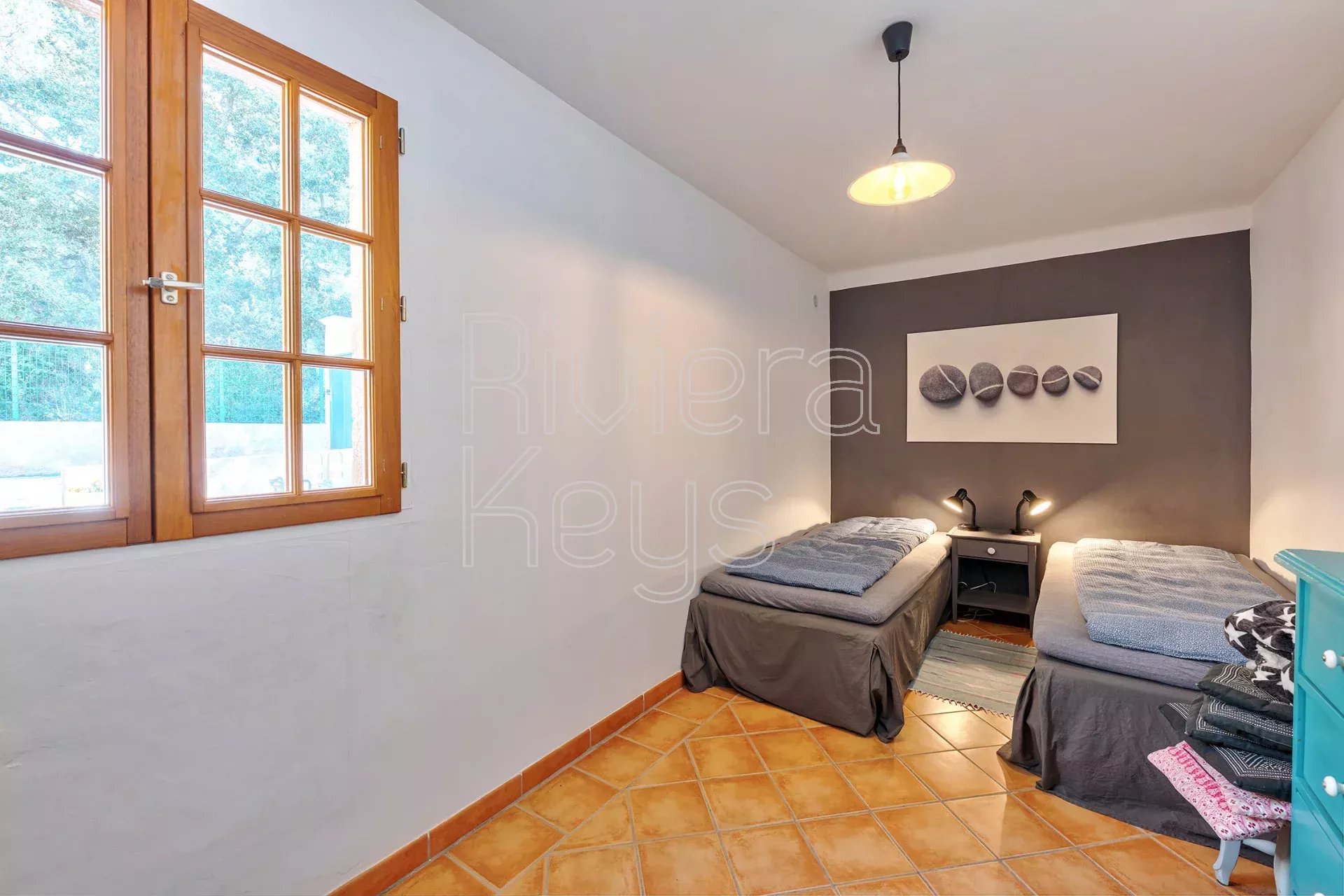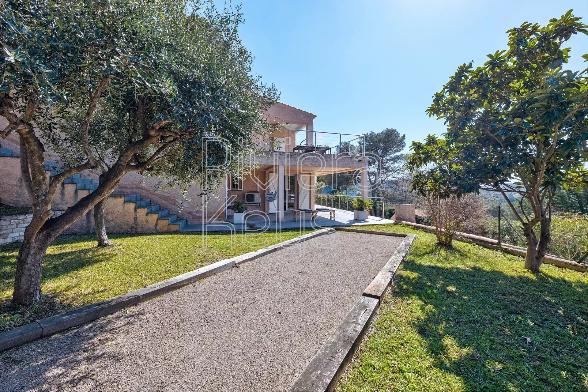 Le jardin aménagé en restanques comprend un terrain de pétanque, une piscine et plusieurs places de parking, le tout sécurisé par un portail automatique.