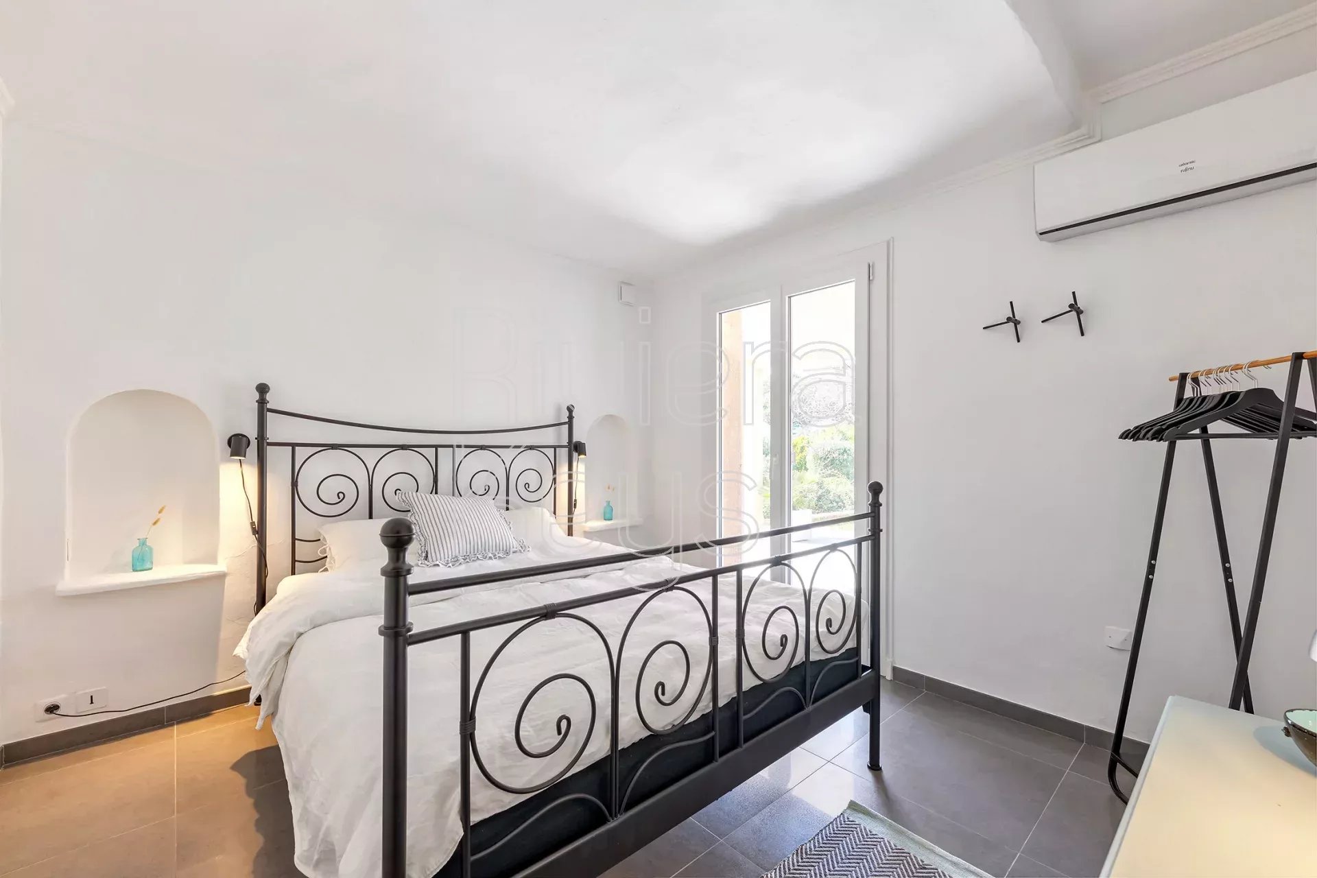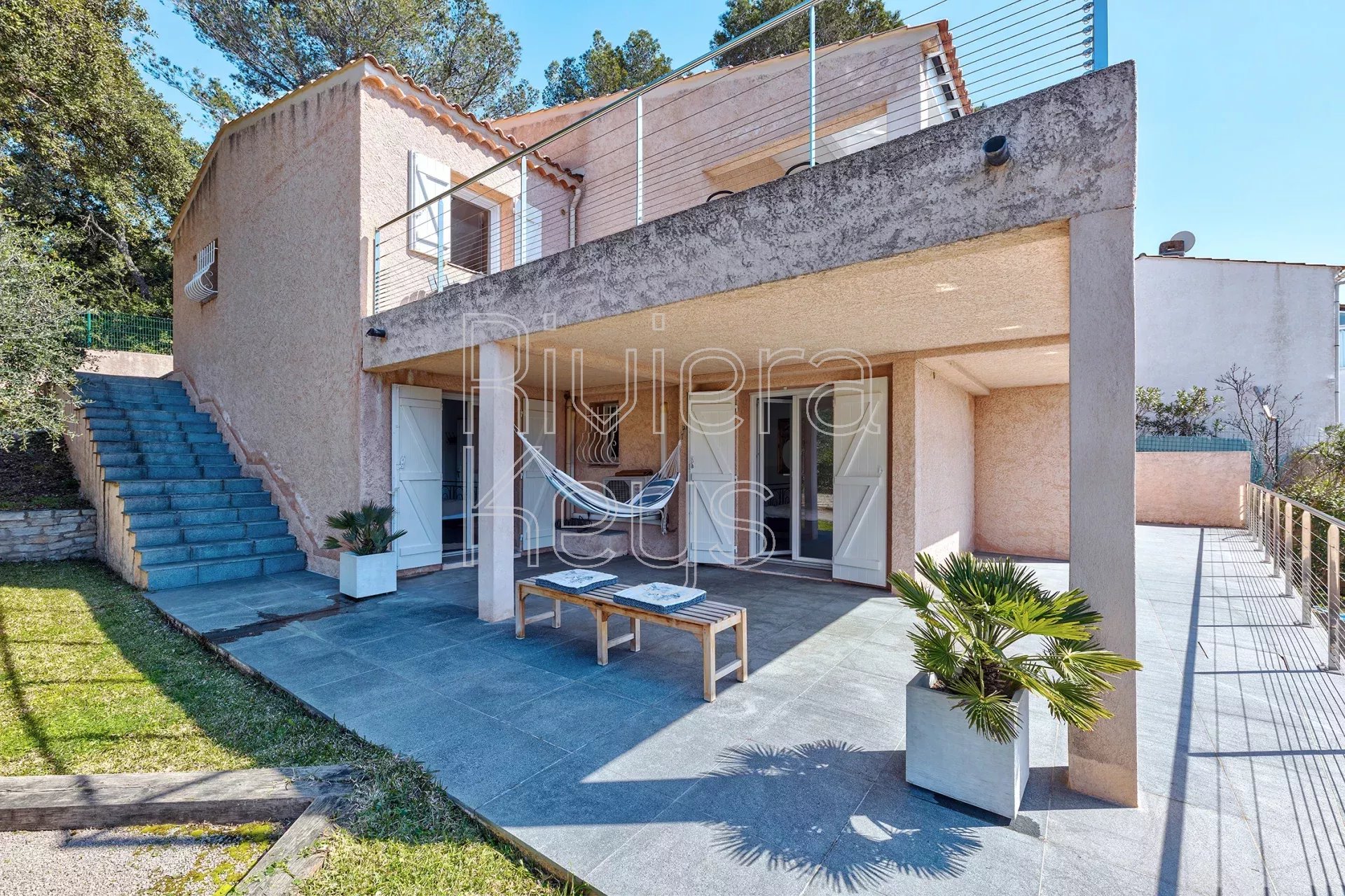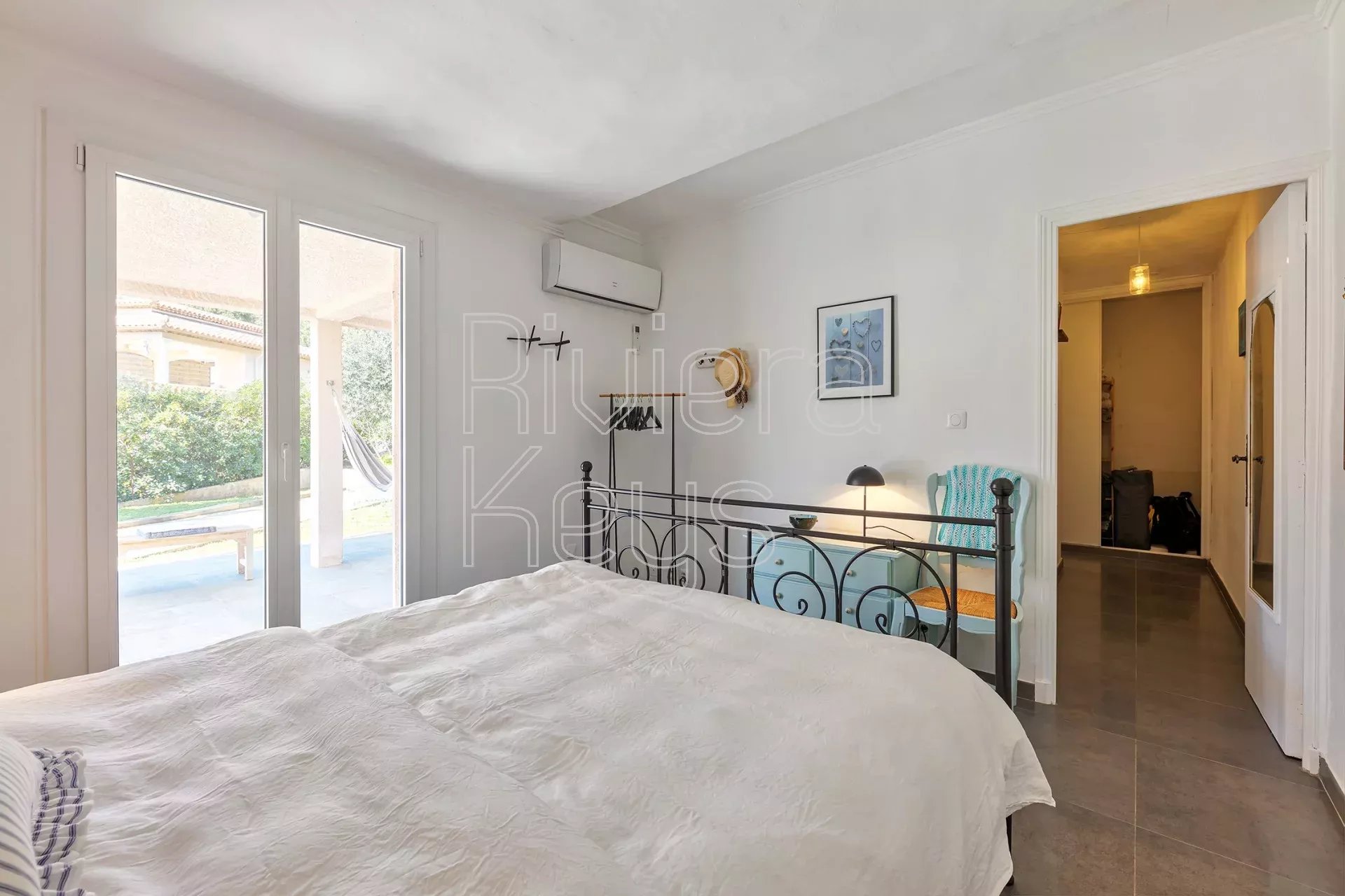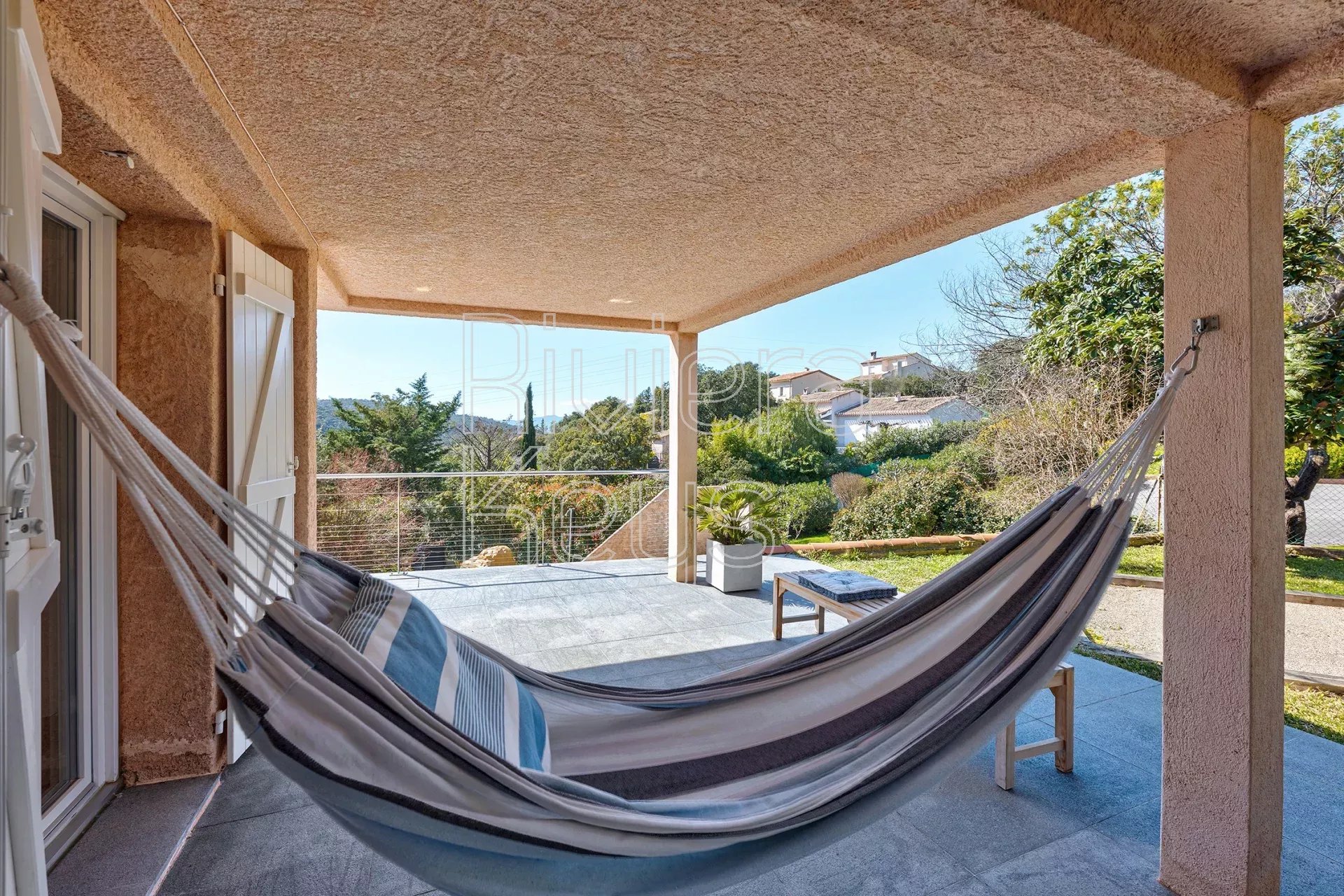 Le jardin aménagé en restanques comprend un terrain de pétanque, une piscine et plusieurs places de parking, le tout sécurisé par un portail automatique.
