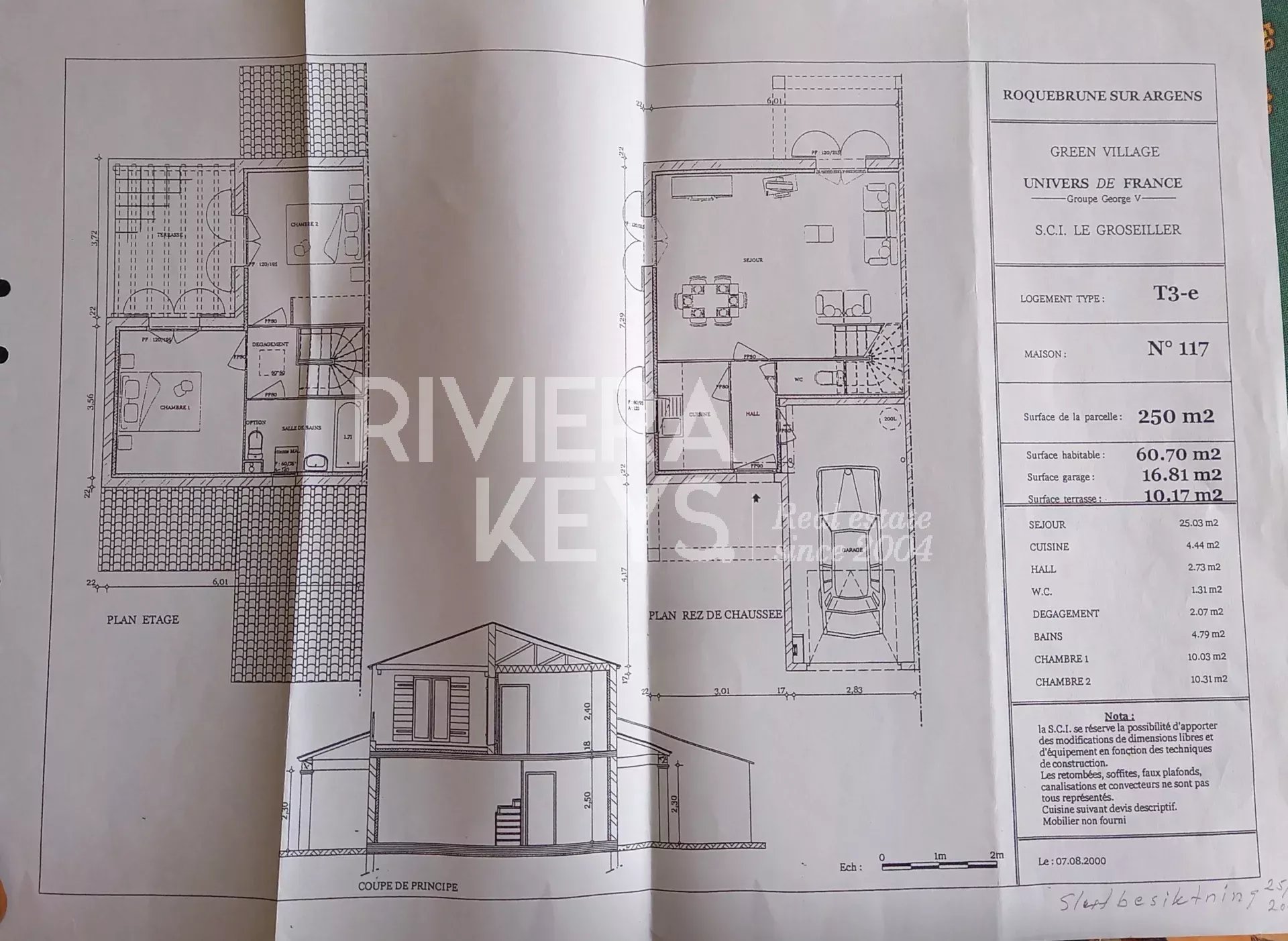 Huset består i første etasje av en stue/spisestue som vender ut mot hagen, et uavhengig kjøkken og separate toaletter. Ovenpå er det to flotte soverom som åpner ut mot en terrasse på rundt 10 m², og et bad med toalett. I første etasje, er det terrasse på ca. 15 m² og en hyggelig hage med belysning og petanquebane. Det hører til en garasje og en privat parkeringsplass.