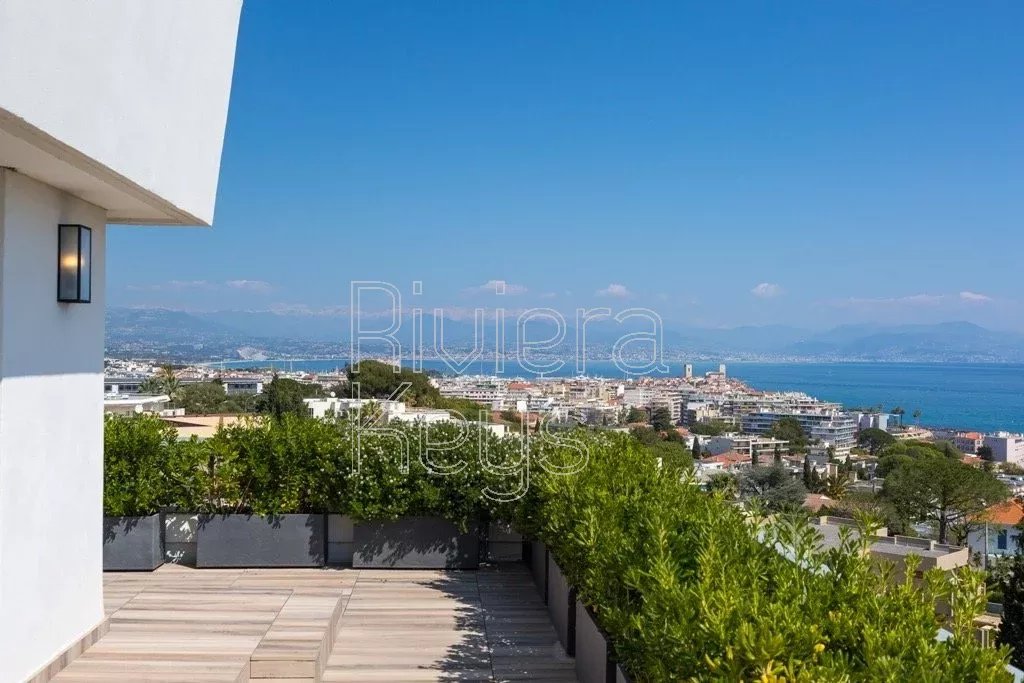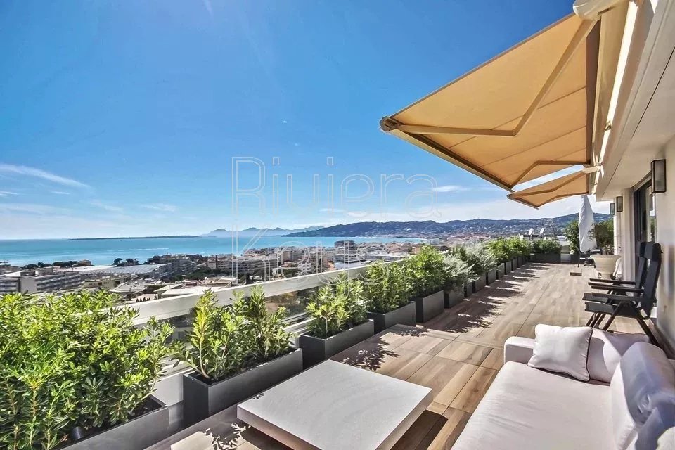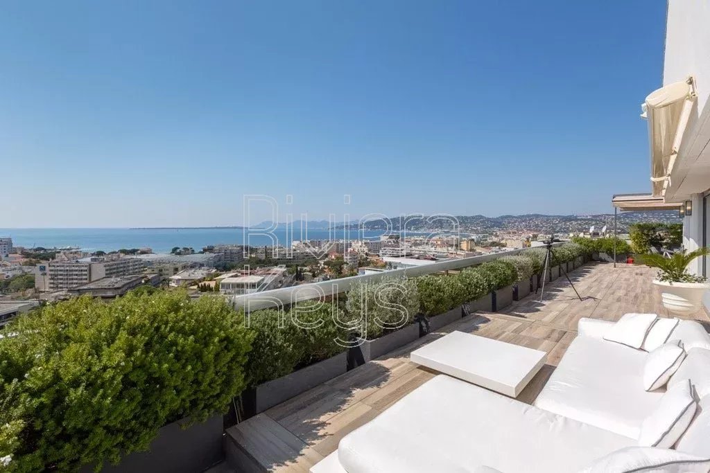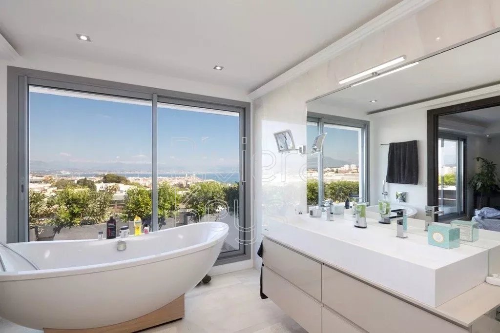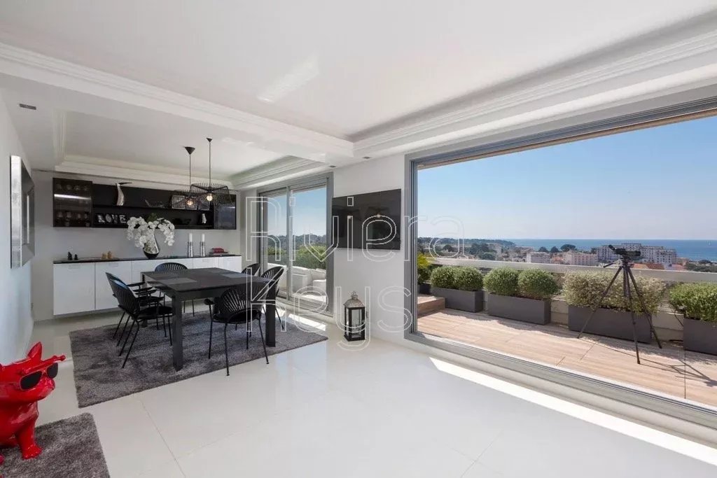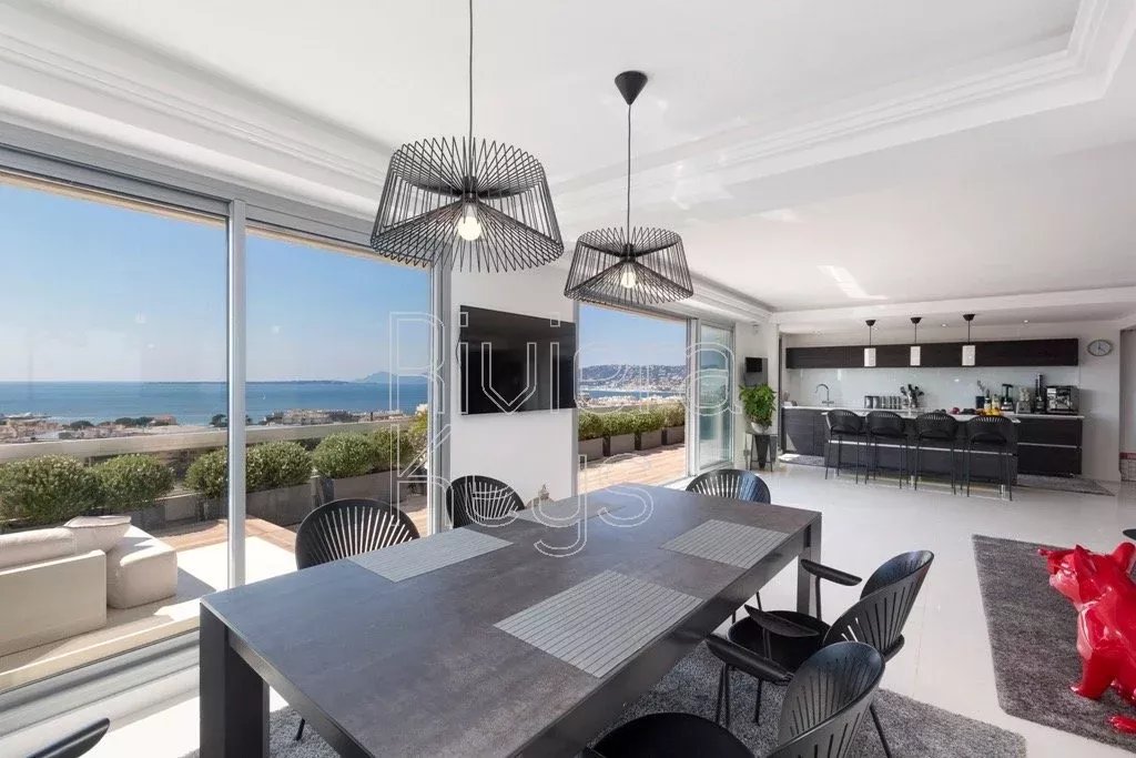 Mellom Antibes og Juan-les-Pins finner du denne takleiligheten på 142 m² i 10. og øverste etasje, med tre soverom, alle med eget bad. Moderne stil med førsteklasses kjøkken og overdådige interiørdetaljer.