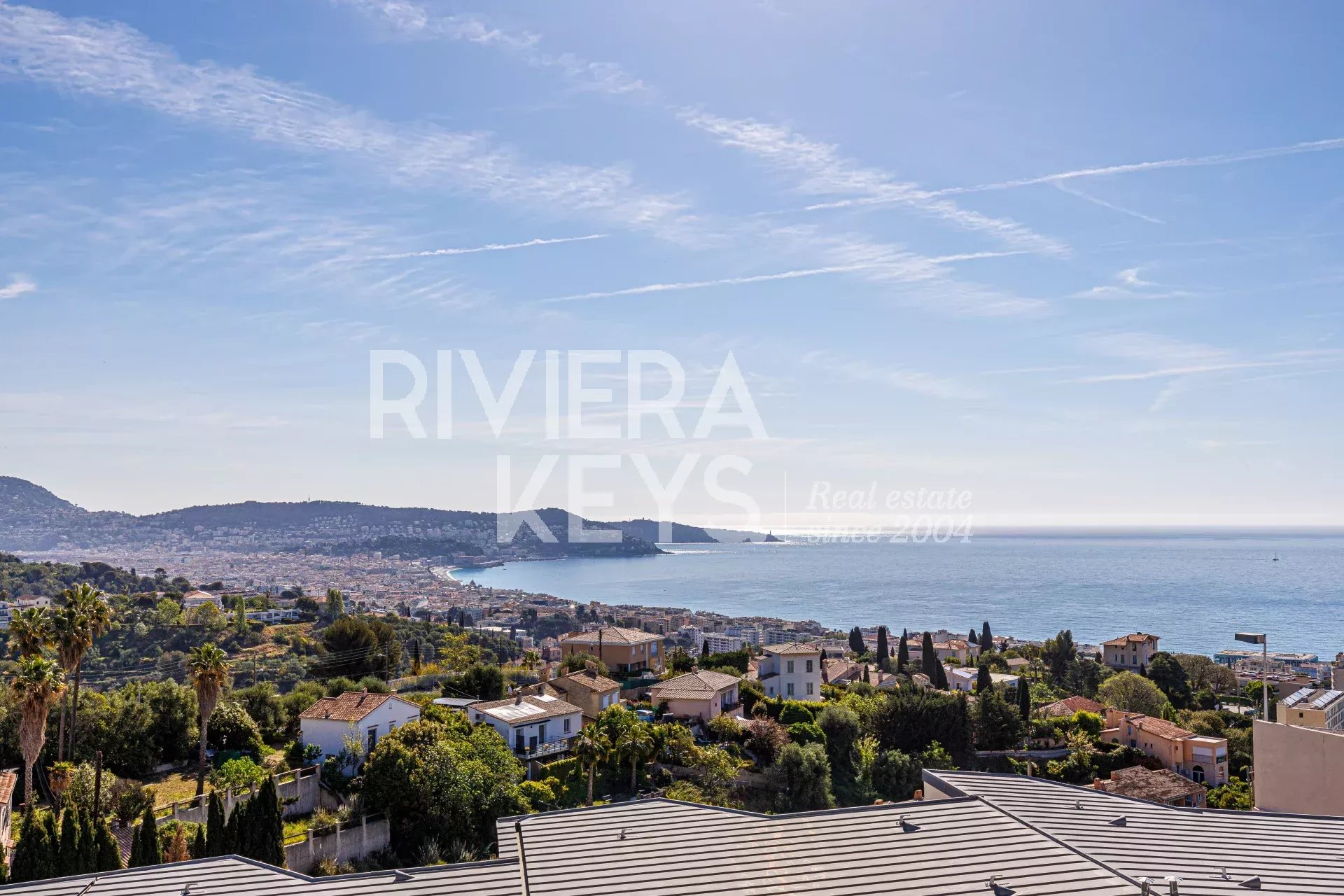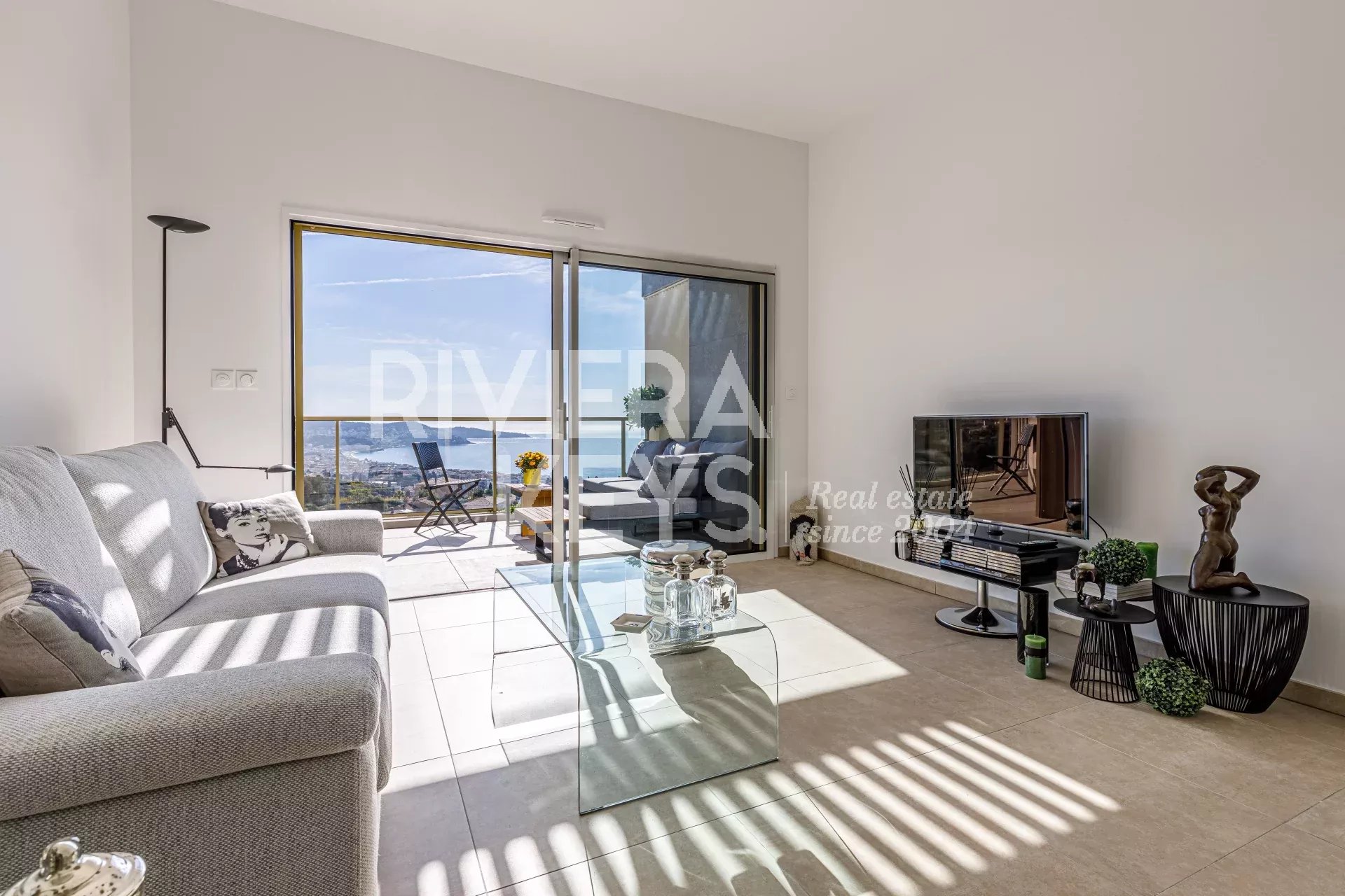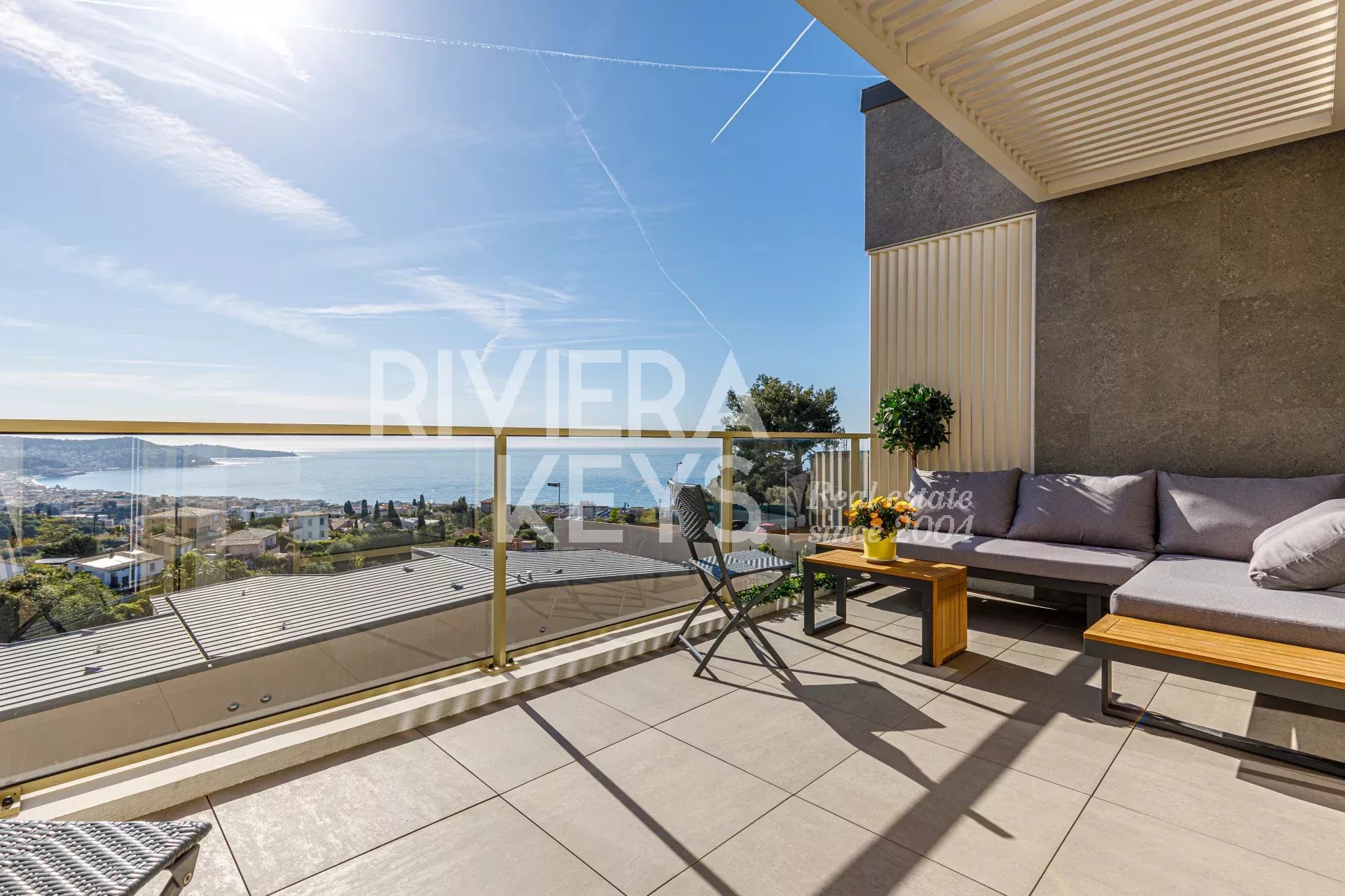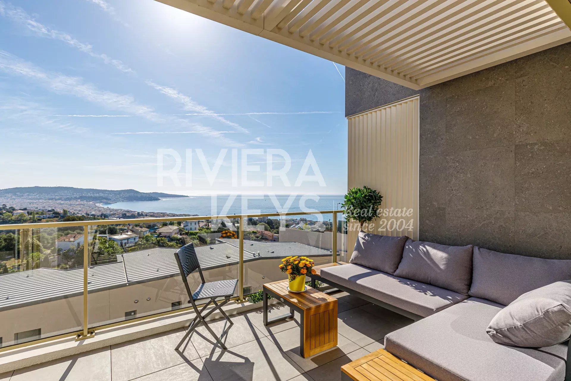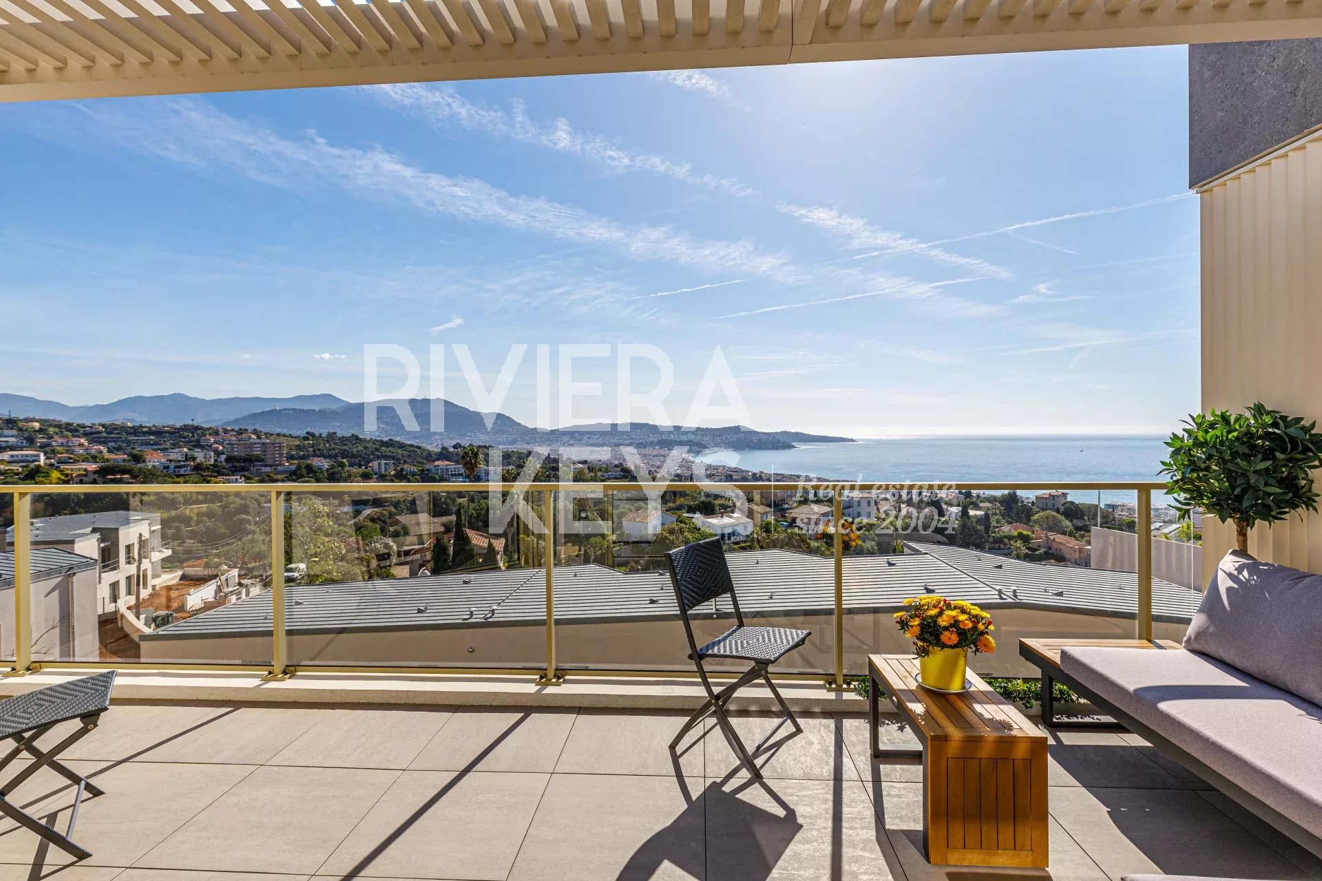 Denne flotte treromsleiligheten i øverste etasje på ca. 80 m² ble ferdigstilt i 2022 og ligger i åsen over Nice i en lukket residens med oppvarmet basseng, gjesteleilighet, treningsrom, heis. Det er høyt under taket, moderne klimaanlegg med både varm- og kaldluft og byr på en entré, stue med utsikt og direkte utgang til terrassen, et moderne fullt utstyrt kjøkken, to soverom, det ene med eget bad med dusj, individuelt toalett og et bad med badekar. Enda en terrasse med utgang fra kjøkkenet. Mulighet til å kjøpe en garasje i kjelleren.