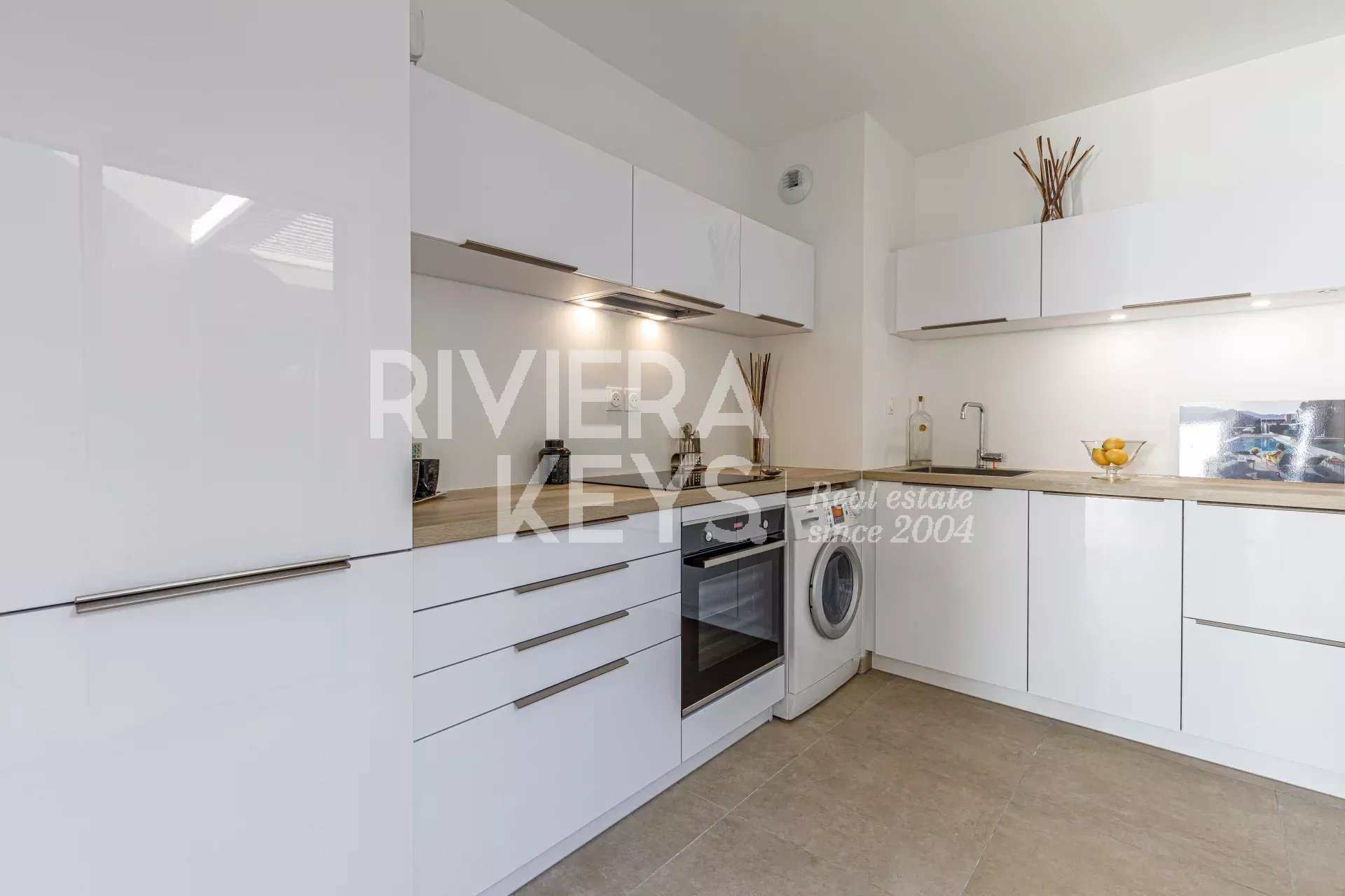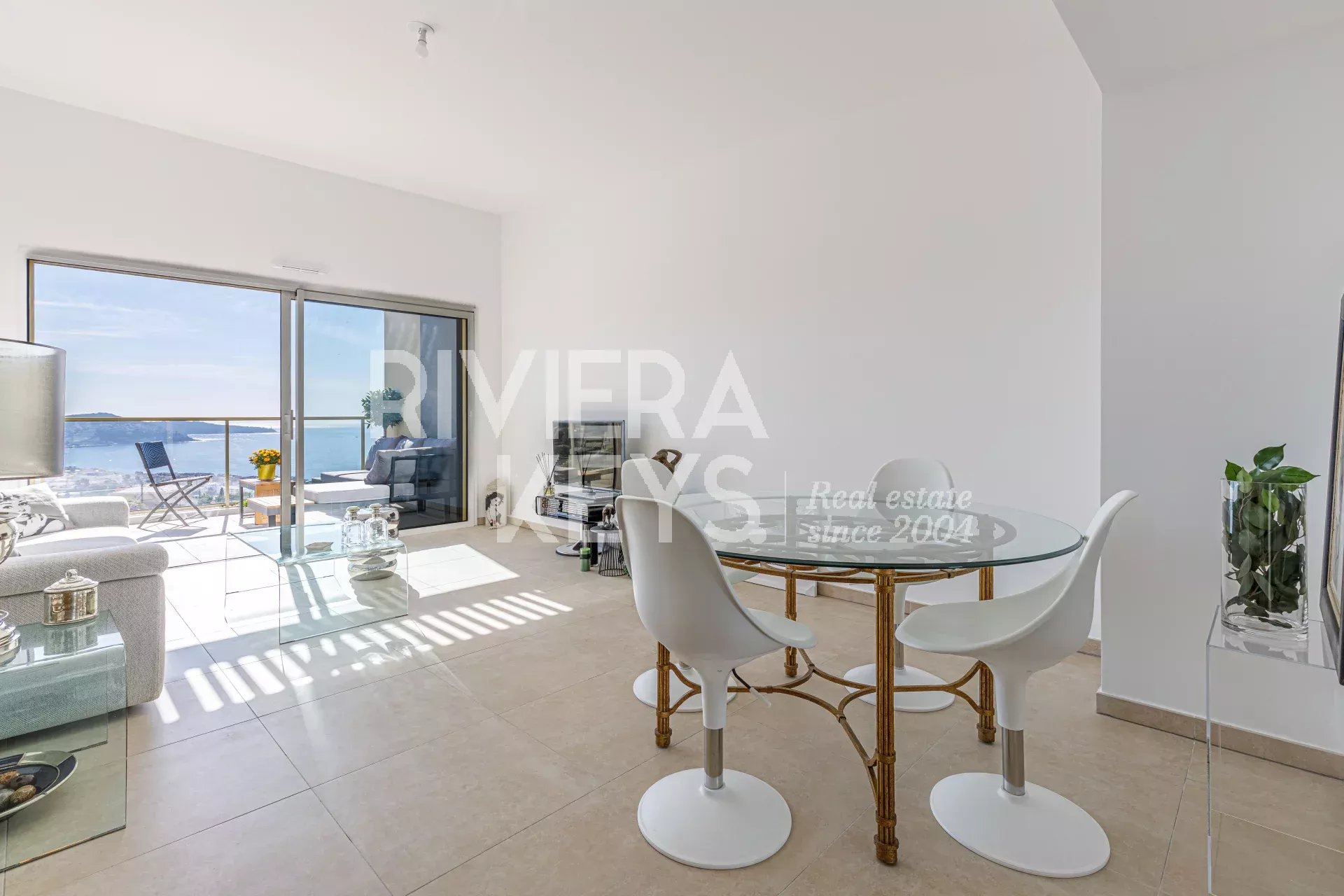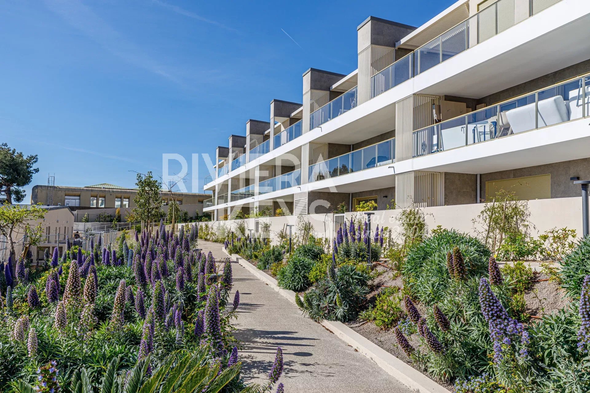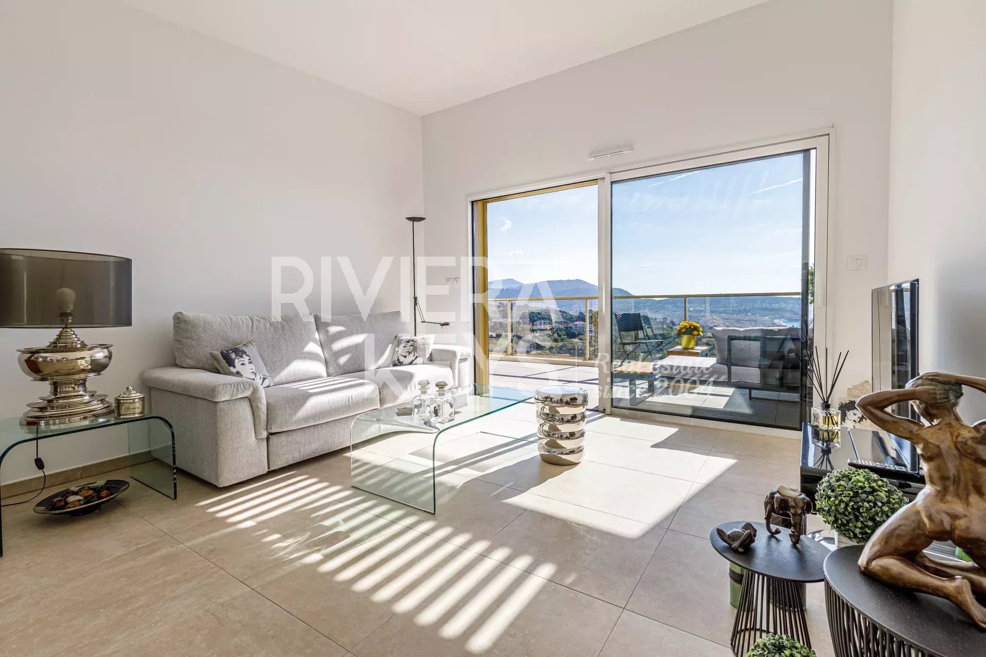 Denne flotte treromsleiligheten i øverste etasje på ca. 80 m² ble ferdigstilt i 2022 og ligger i åsen over Nice i en lukket residens med oppvarmet basseng, gjesteleilighet, treningsrom, heis. Det er høyt under taket, moderne klimaanlegg med både varm- og kaldluft og byr på en entré, stue med utsikt og direkte utgang til terrassen, et moderne fullt utstyrt kjøkken, to soverom, det ene med eget bad med dusj, individuelt toalett og et bad med badekar. Enda en terrasse med utgang fra kjøkkenet. Mulighet til å kjøpe en garasje i kjelleren.