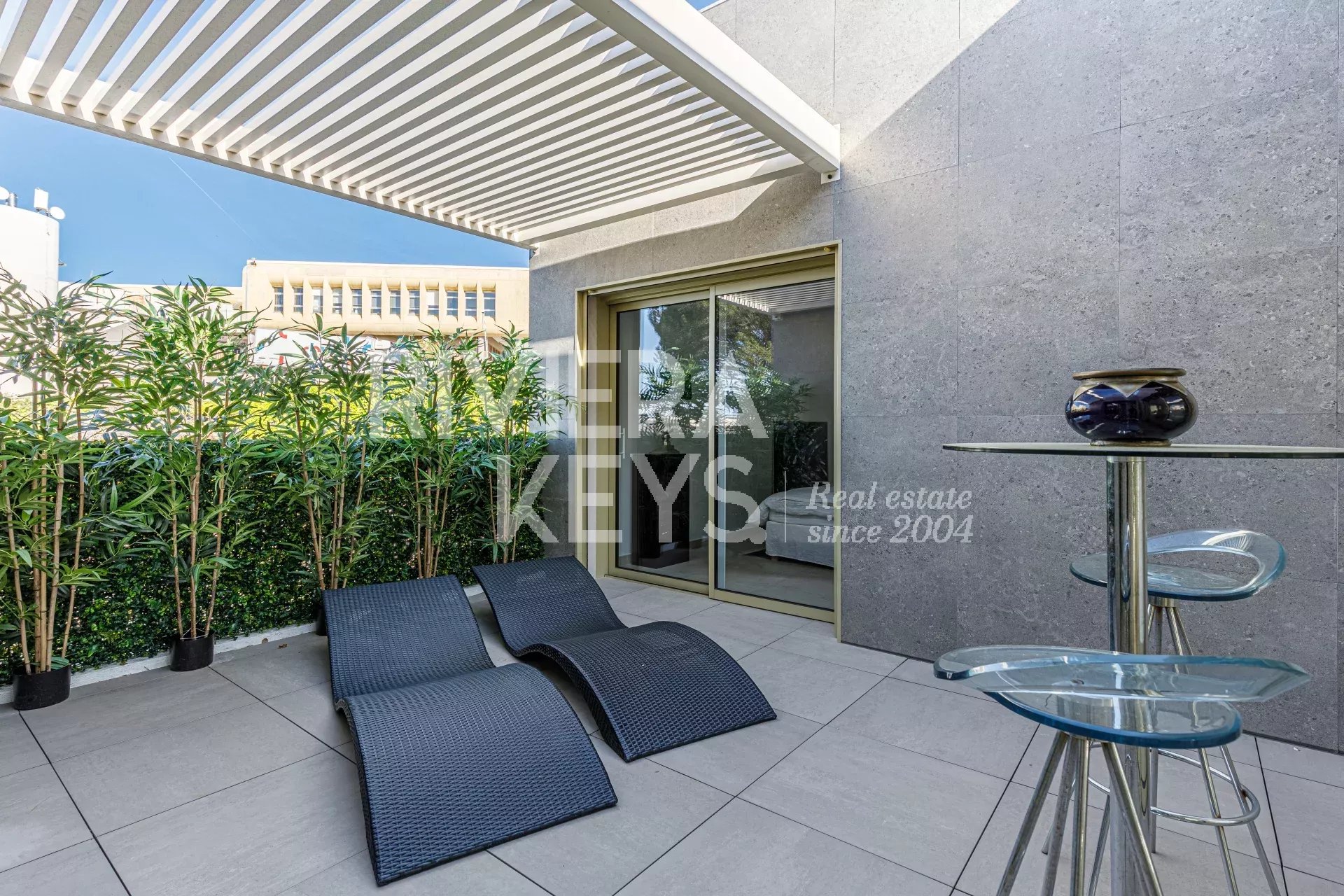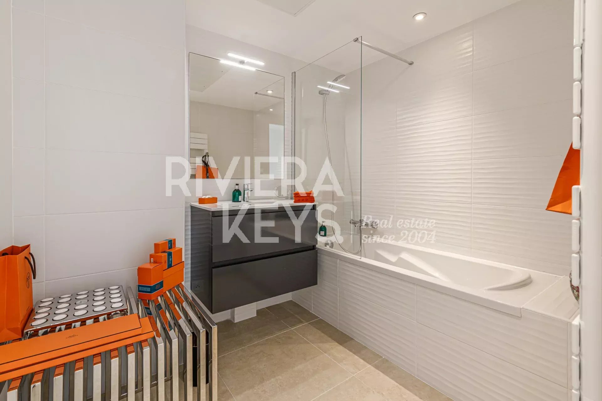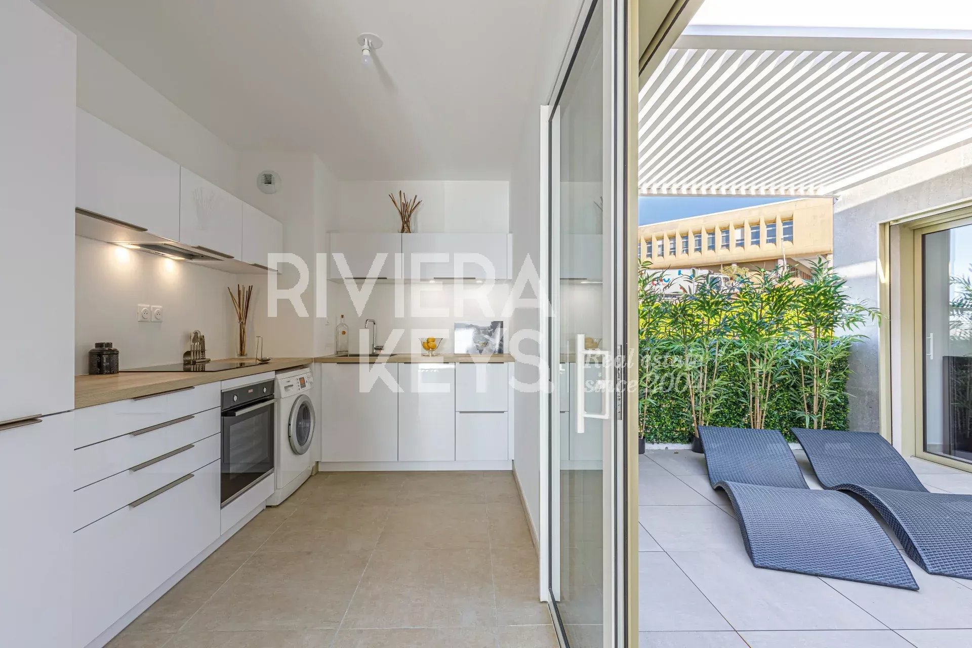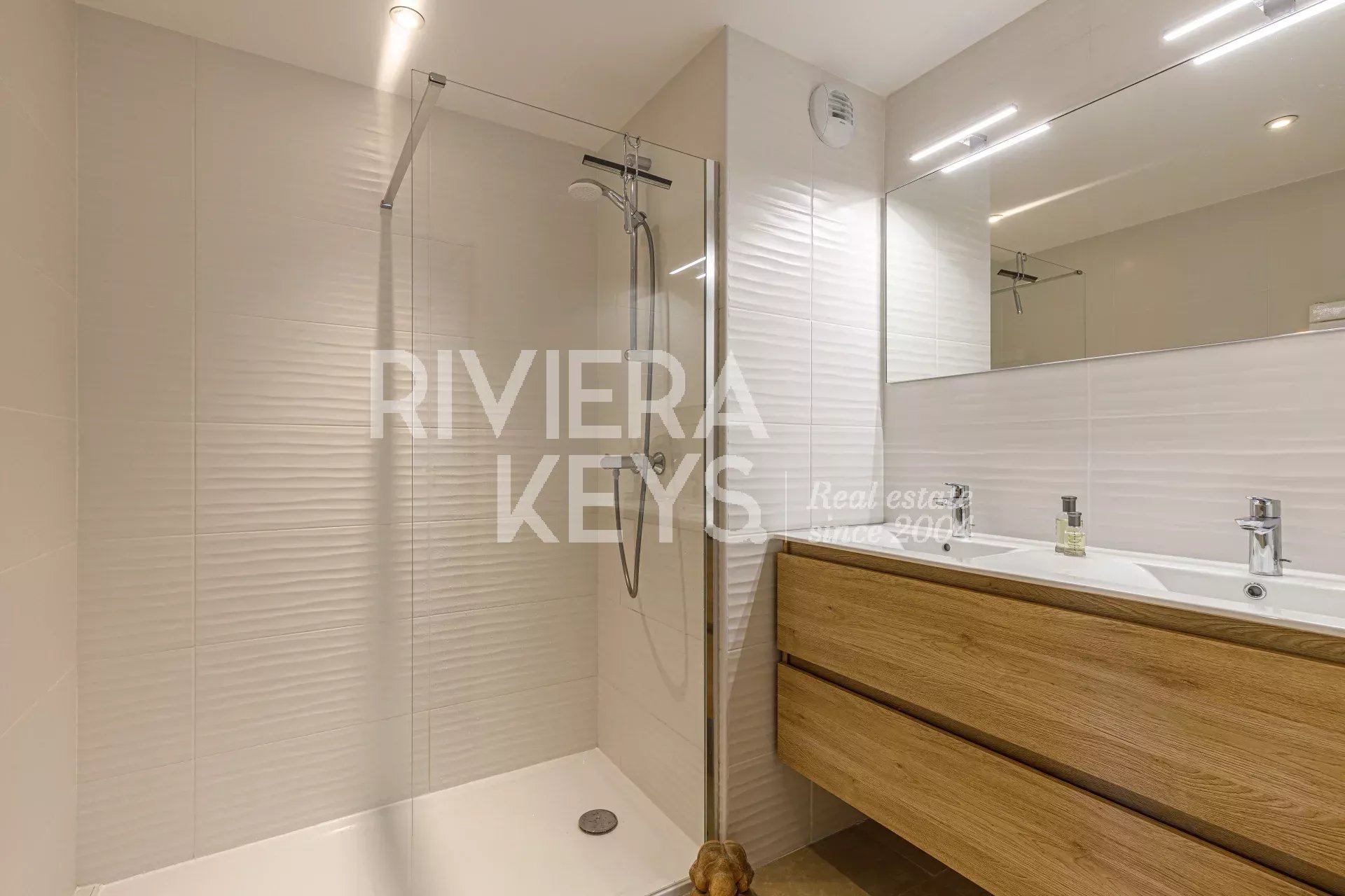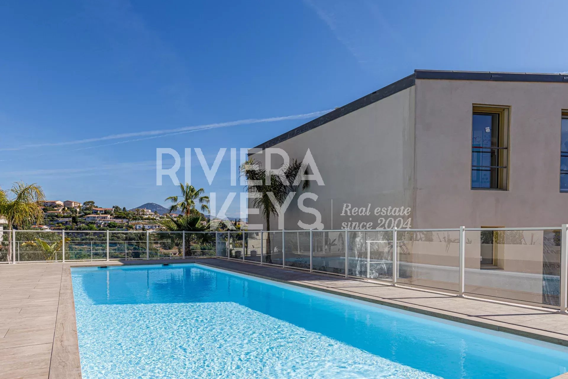 Denne flotte treromsleiligheten i øverste etasje på ca. 80 m² ble ferdigstilt i 2022 og ligger i åsen over Nice i en lukket residens med oppvarmet basseng, gjesteleilighet, treningsrom, heis. Det er høyt under taket, moderne klimaanlegg med både varm- og kaldluft og byr på en entré, stue med utsikt og direkte utgang til terrassen, et moderne fullt utstyrt kjøkken, to soverom, det ene med eget bad med dusj, individuelt toalett og et bad med badekar. Enda en terrasse med utgang fra kjøkkenet. Mulighet til å kjøpe en garasje i kjelleren.