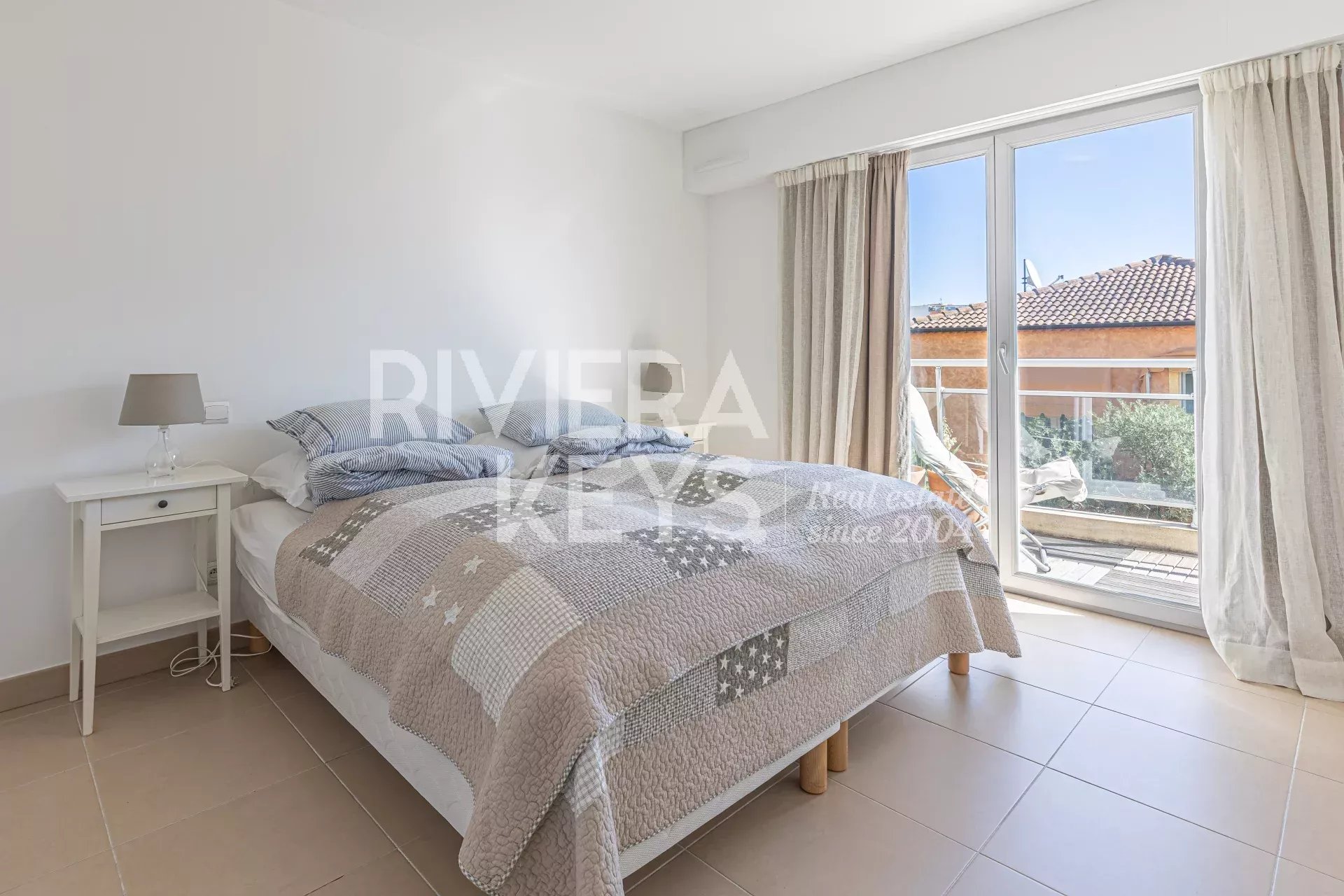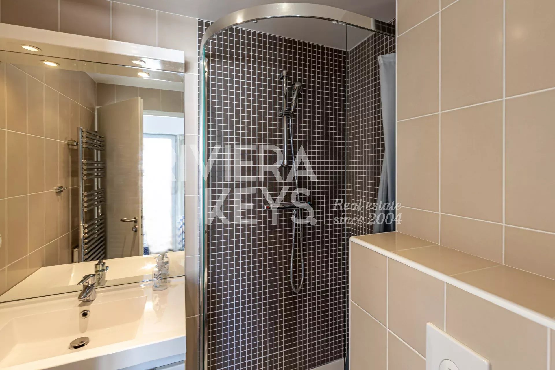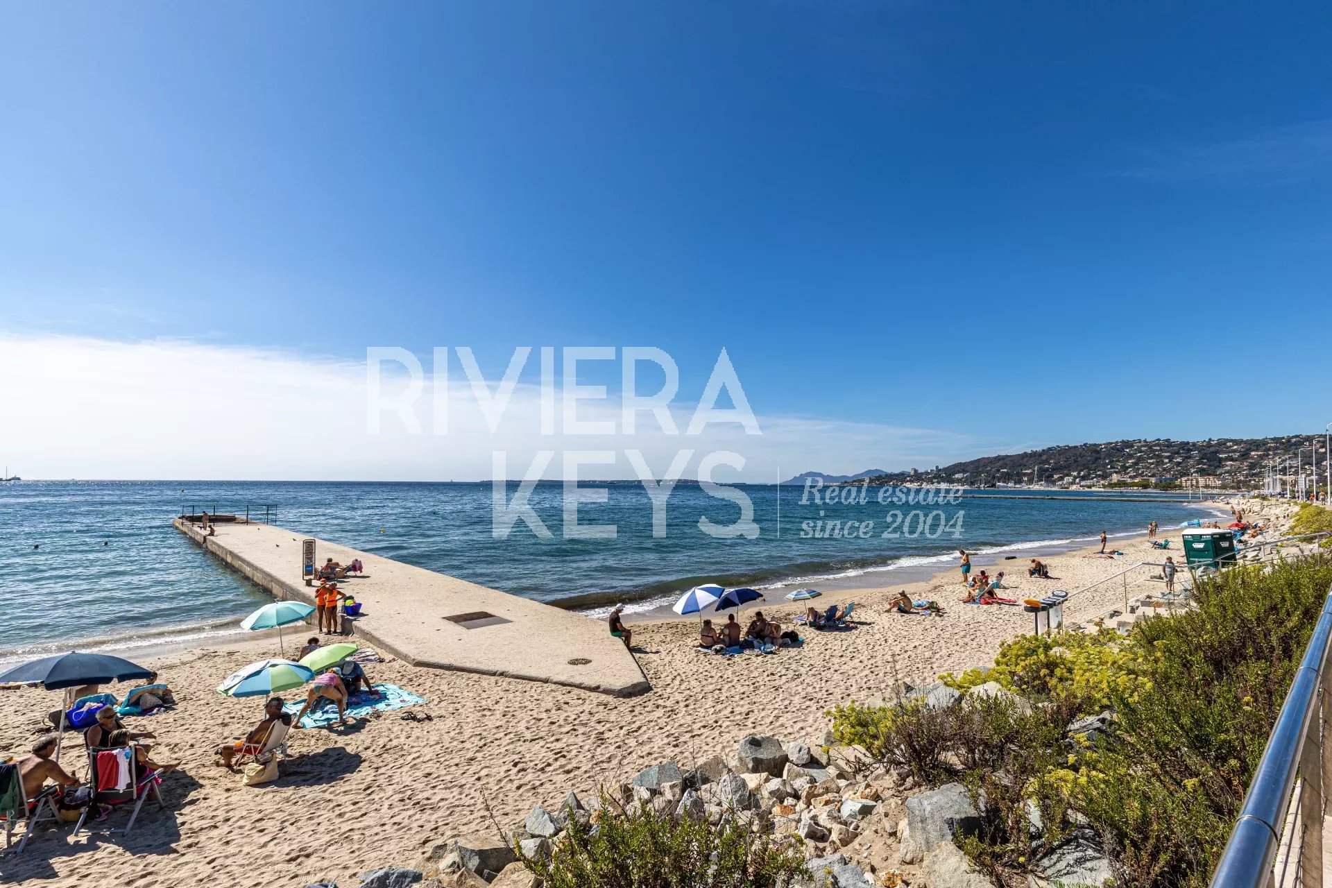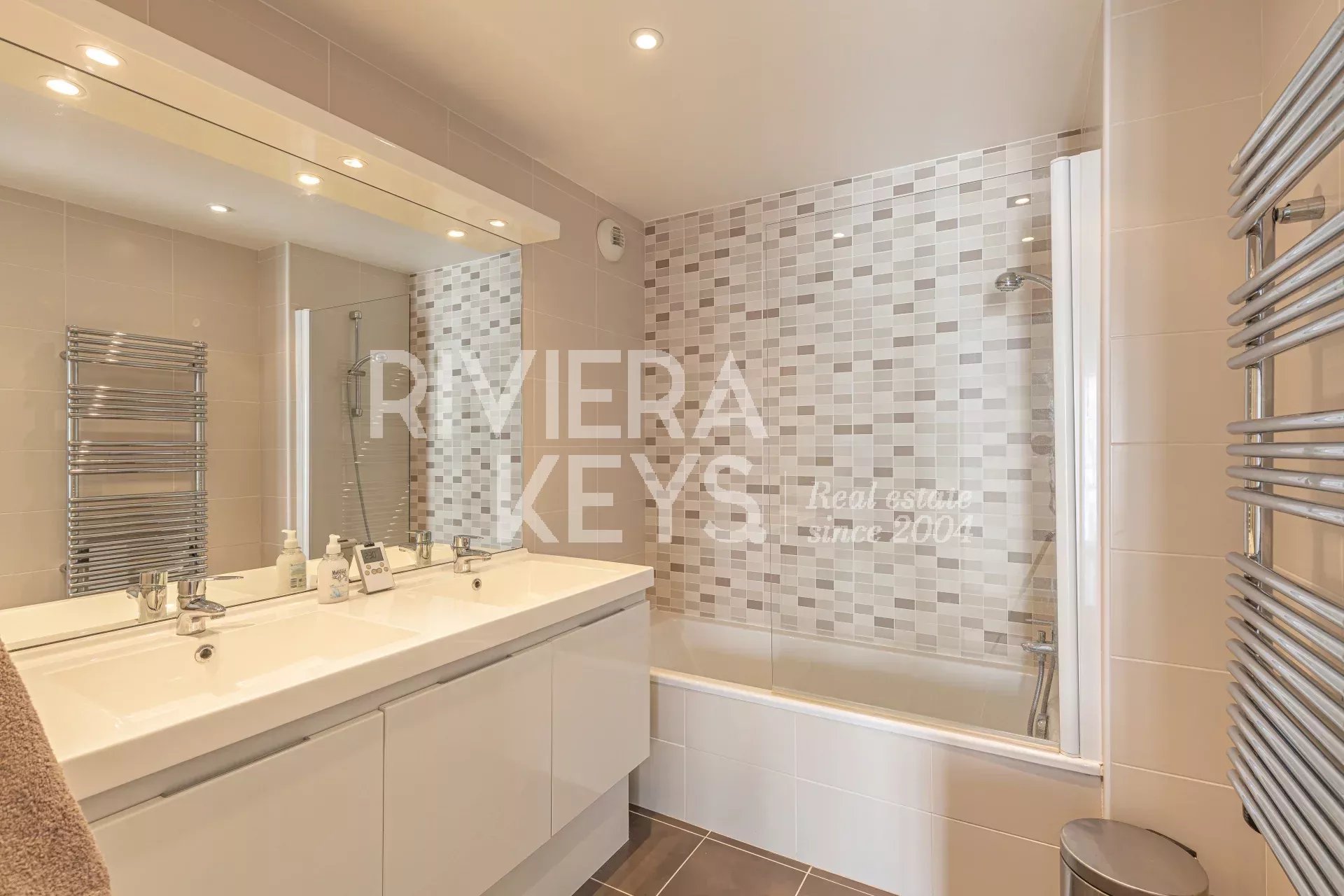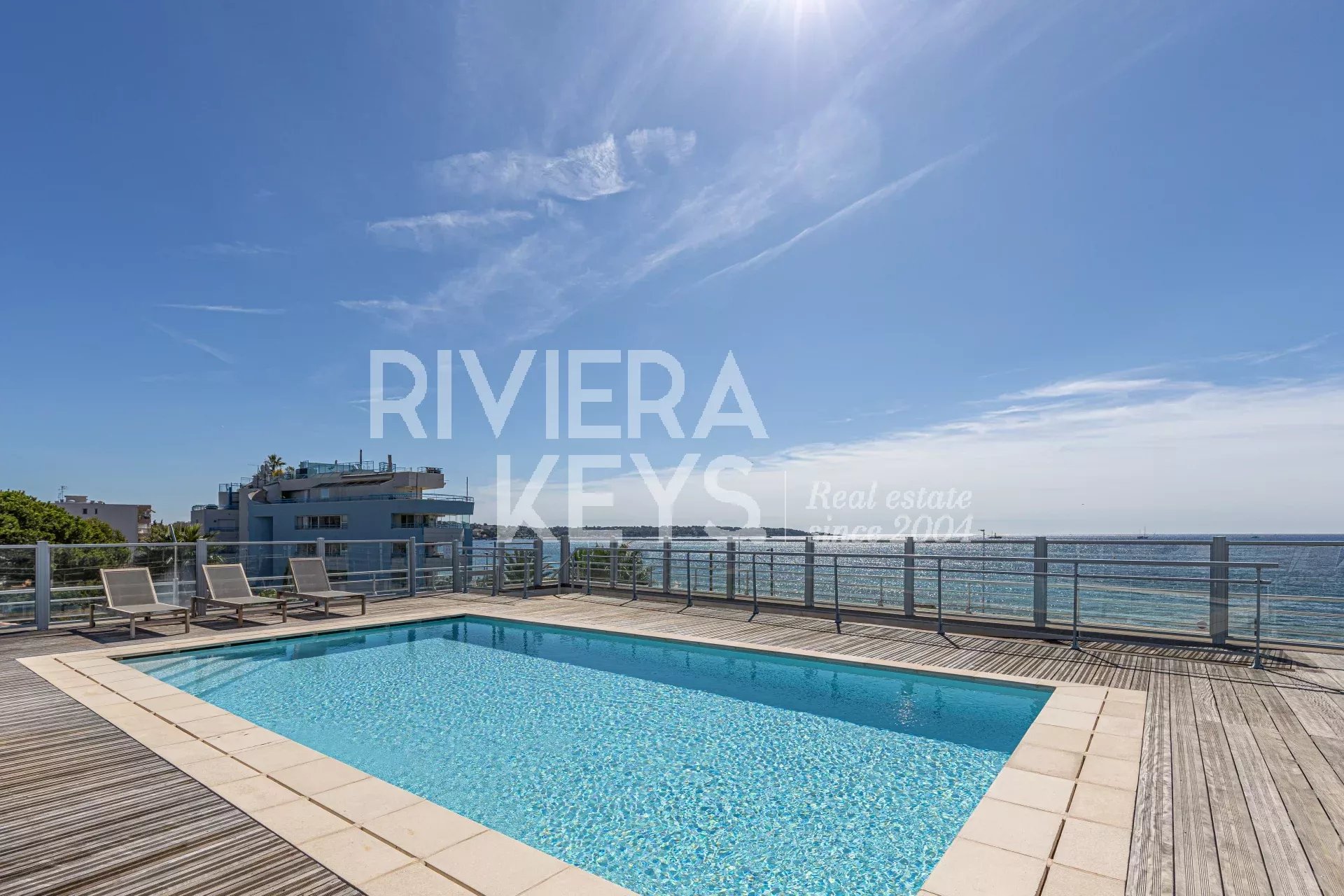 Rymlig lägenhet på ca 90 m², med fantastisk havsutsikt och pool på taket med kort avstånd till stranden i kvarteret Bijou plage i Juan-les-Pins. Entré, kombinerat vardagsrum och matsal med öppet kök och utgång till terrassen i sydost. Master bedroom med garderob och eget duschrum och toalett. 2 sovrum och ett badrum med badkar. Gästtoalett. Stort garage.