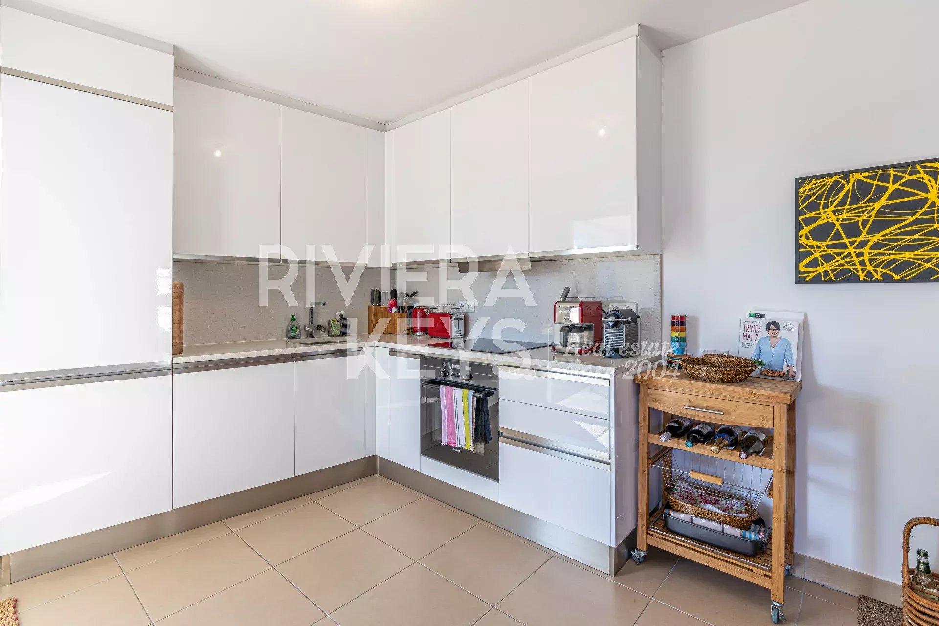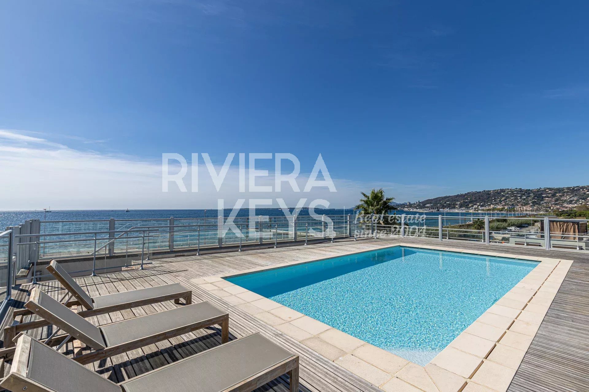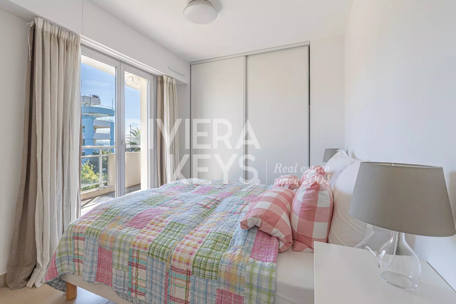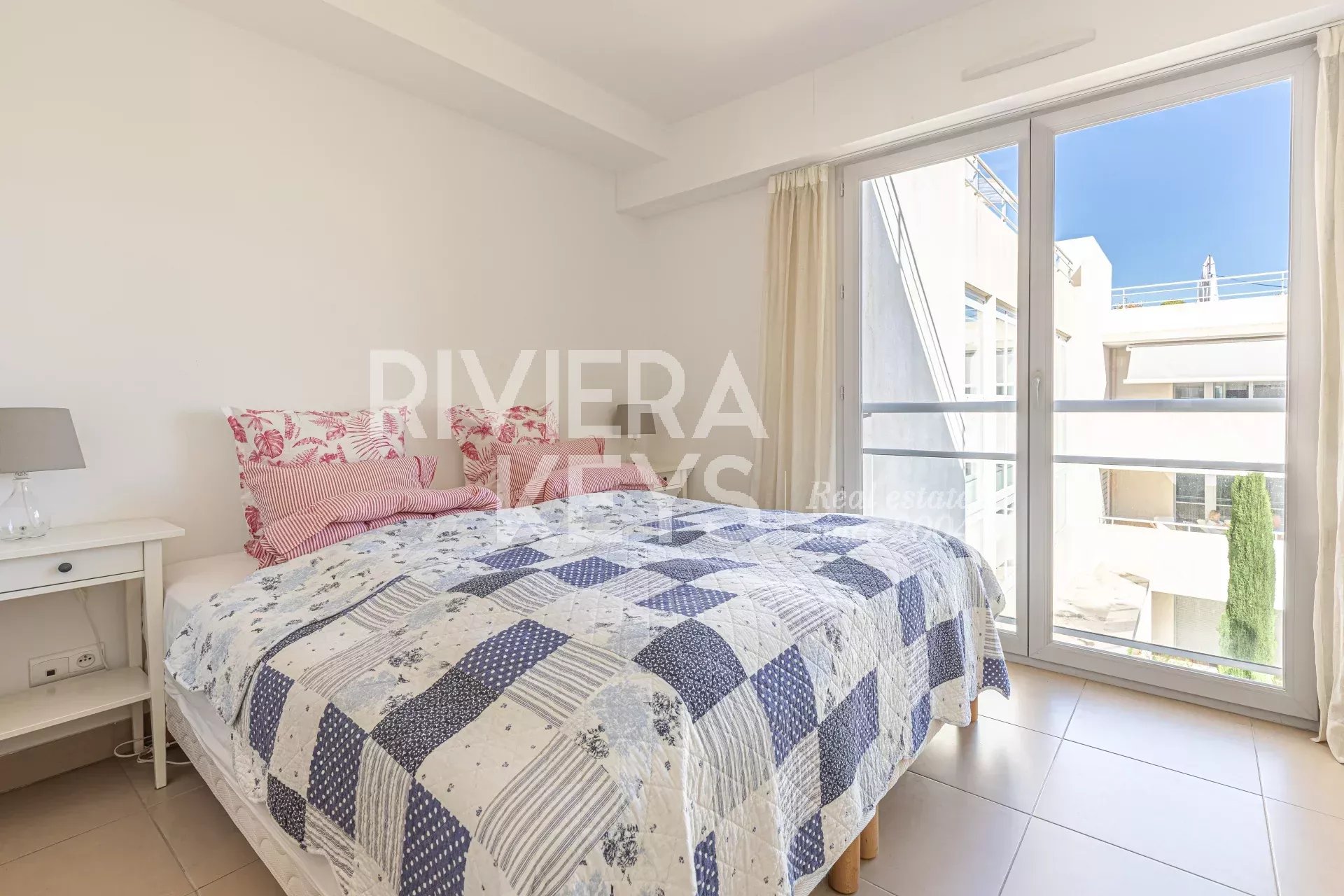 Rymlig lägenhet på ca 90 m², med fantastisk havsutsikt och pool på taket med kort avstånd till stranden i kvarteret Bijou plage i Juan-les-Pins. Entré, kombinerat vardagsrum och matsal med öppet kök och utgång till terrassen i sydost. Master bedroom med garderob och eget duschrum och toalett. 2 sovrum och ett badrum med badkar. Gästtoalett. Stort garage.