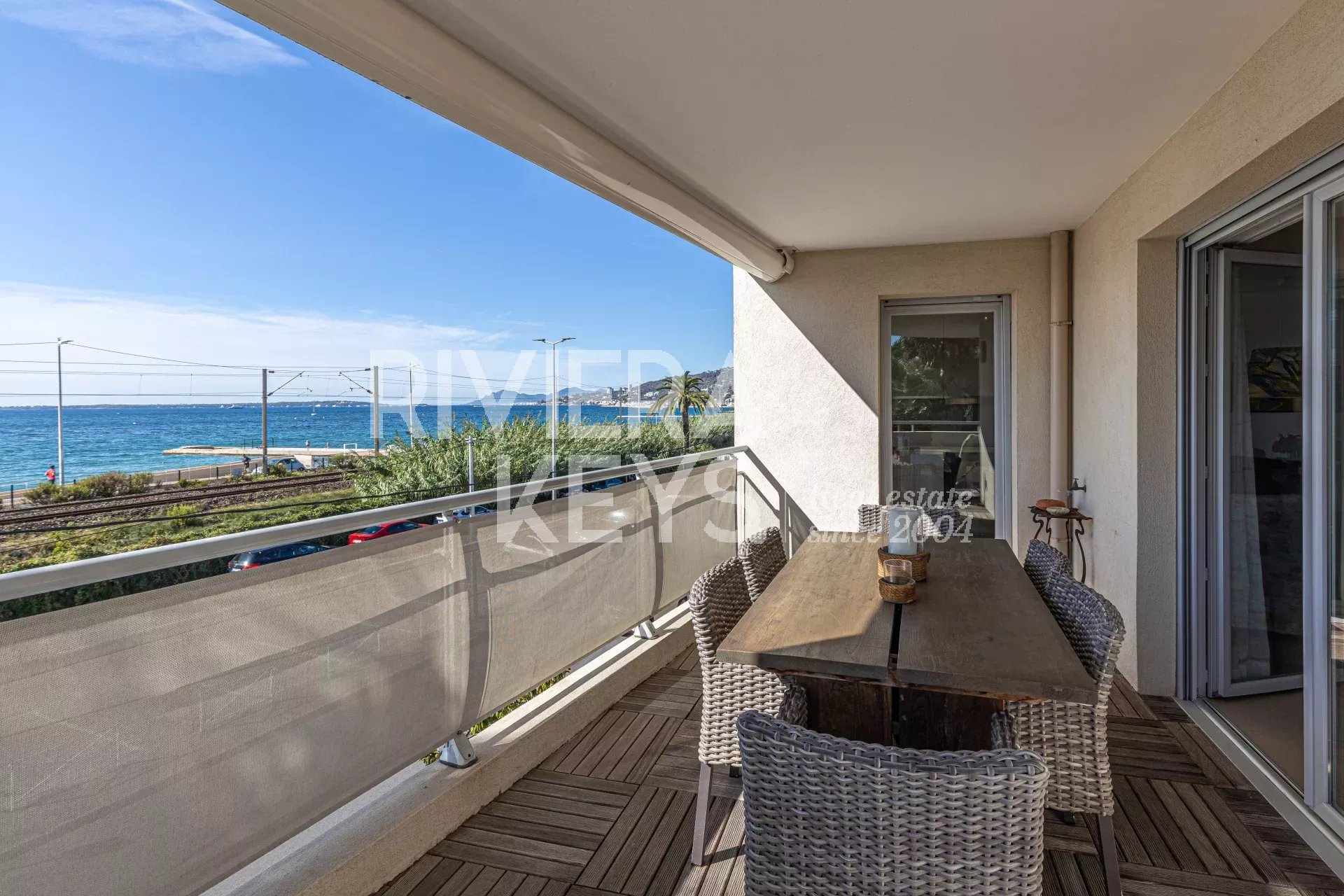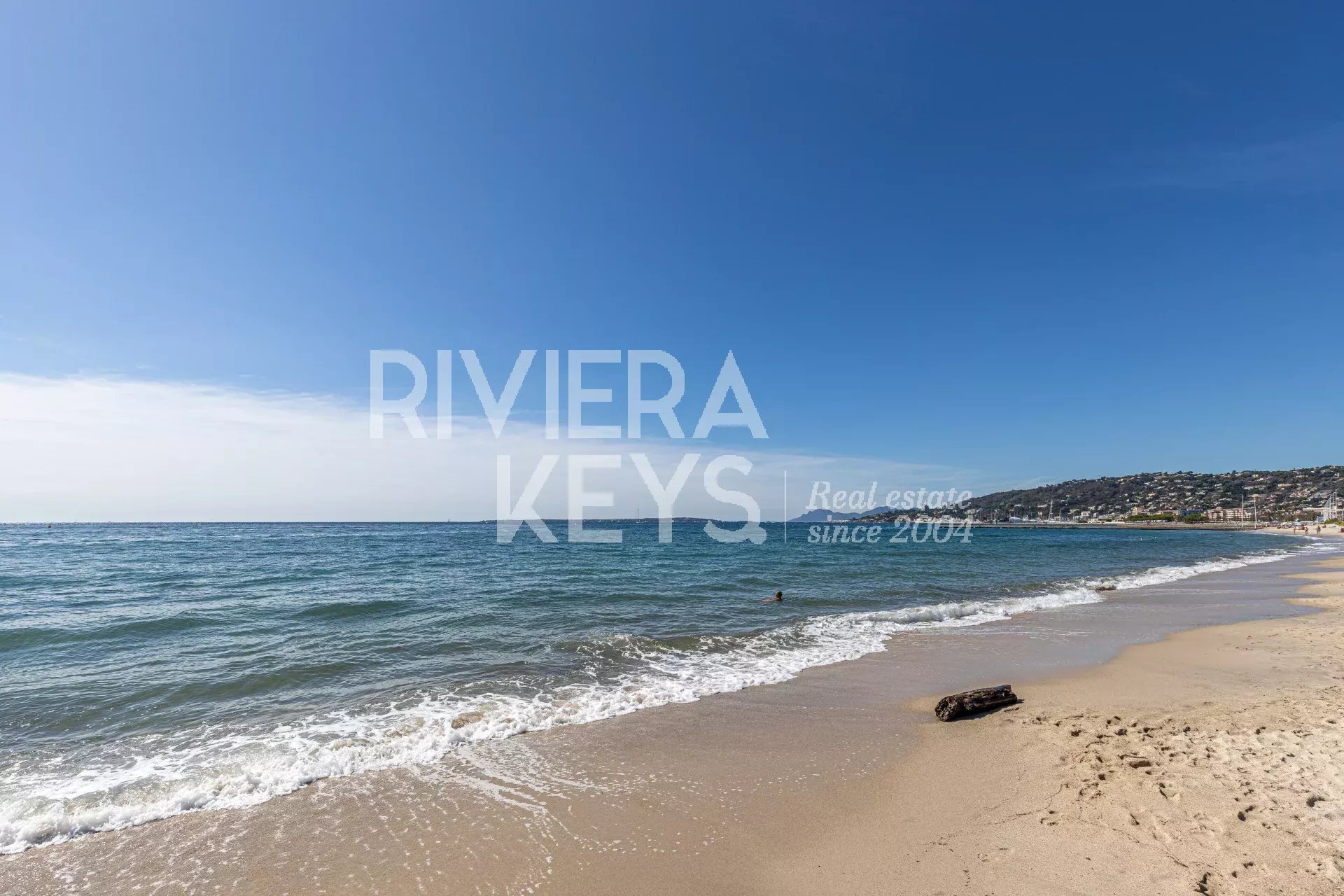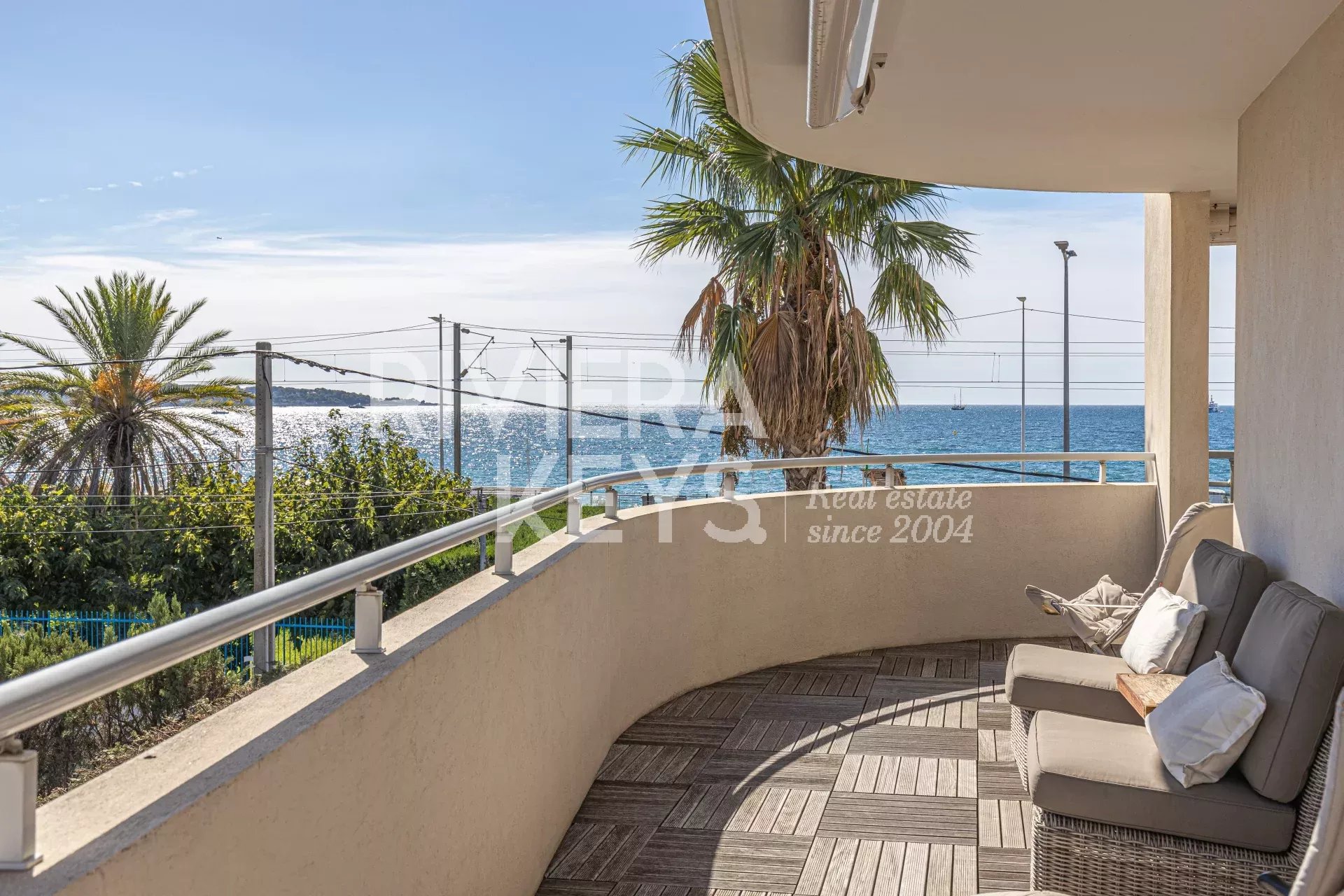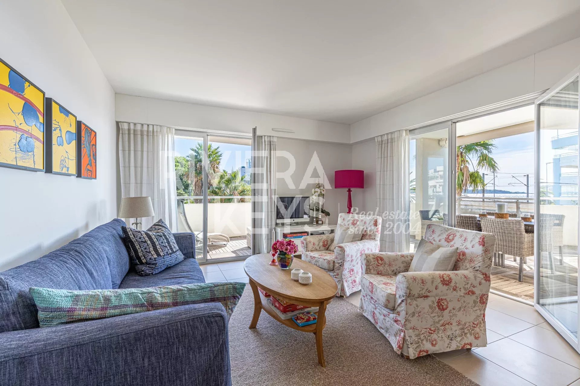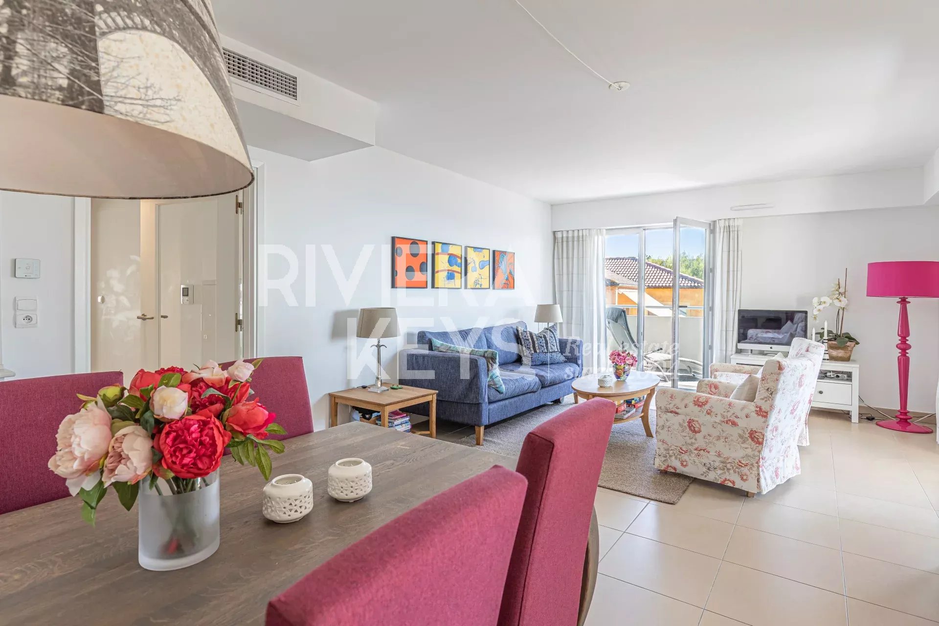 Rymlig lägenhet på ca 90 m², med fantastisk havsutsikt och pool på taket med kort avstånd till stranden i kvarteret Bijou plage i Juan-les-Pins. Entré, kombinerat vardagsrum och matsal med öppet kök och utgång till terrassen i sydost. Master bedroom med garderob och eget duschrum och toalett. 2 sovrum och ett badrum med badkar. Gästtoalett. Stort garage.