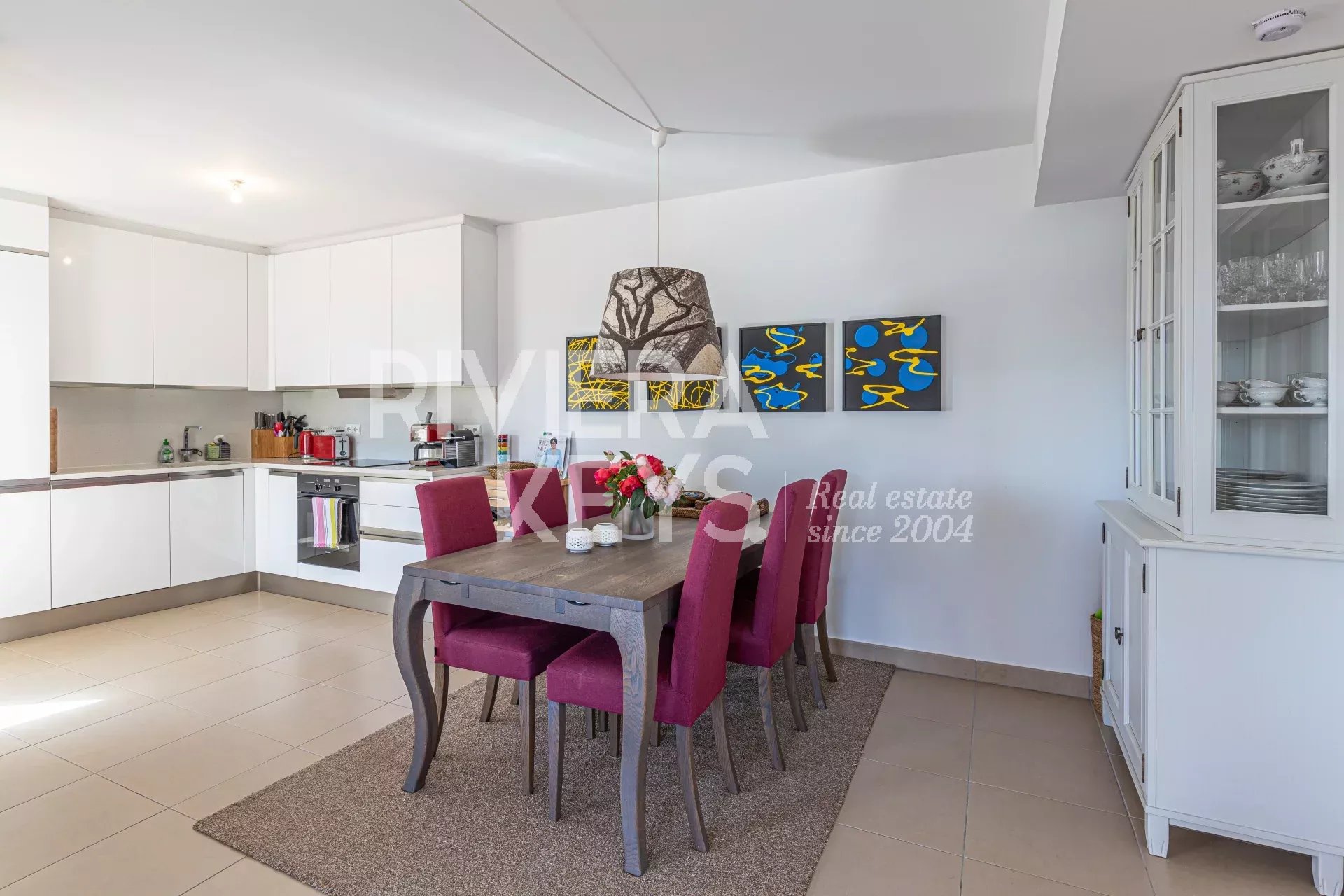 Liten, prestigefylld fastighet från 2012 med trevlig takterrass med pool och magisk havsutsikt, kort avstånd till alla faciliteter och med gästparkering.