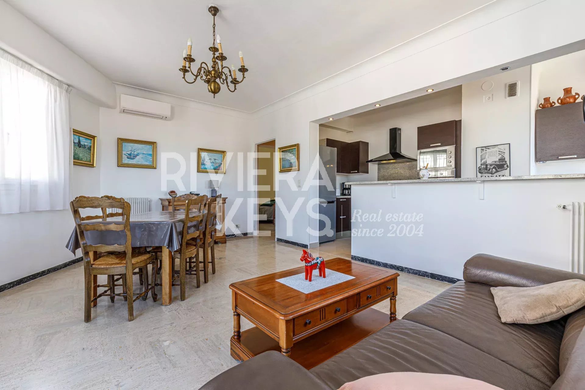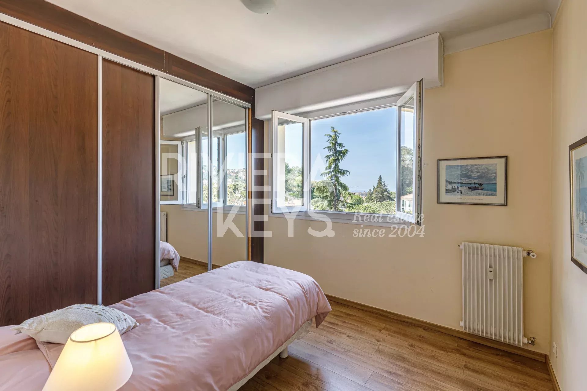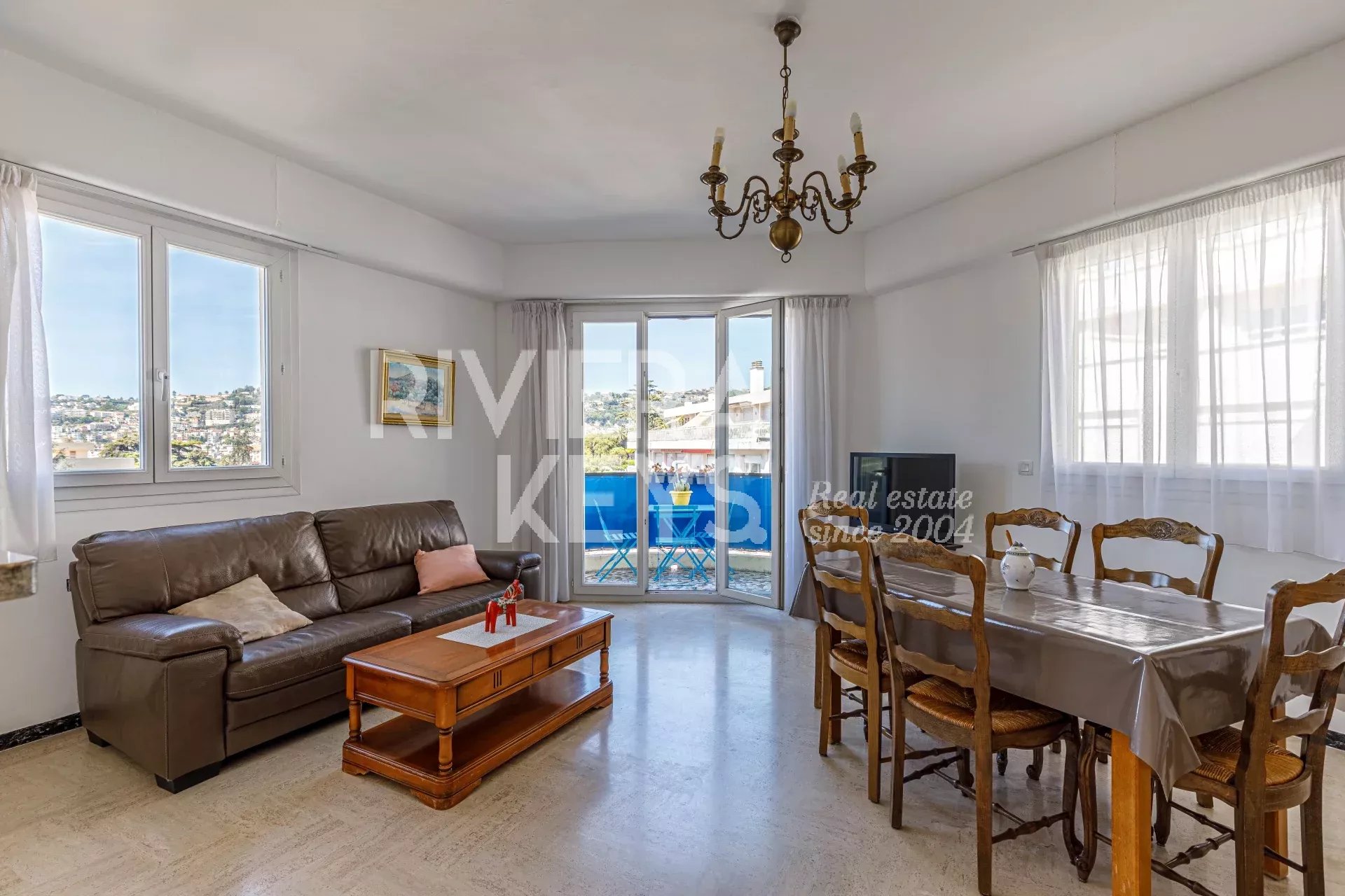 Ljus lägenhet i gott skick med högt i tak, på cirka 70 m² med två sovrum, på näst översta våningen med hiss i en välskött fastighet i området Chambrun i norra Nice. Nära affärer, spårvagn, skolor och centrum. Hall, ett vardagsrum som vetter mot en balkong med fri utsikt, kök i öppen planlösning, två sovrum, ett badrum, garderober, en separat toalett och ytterligare en balkong. Möjlighet att köpa garage i tillägg.