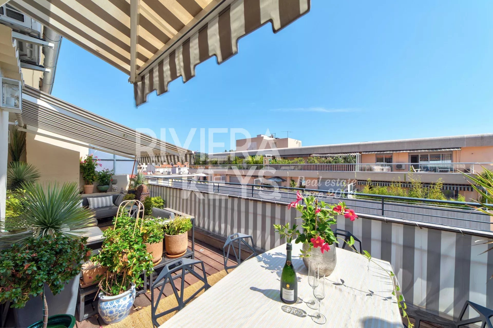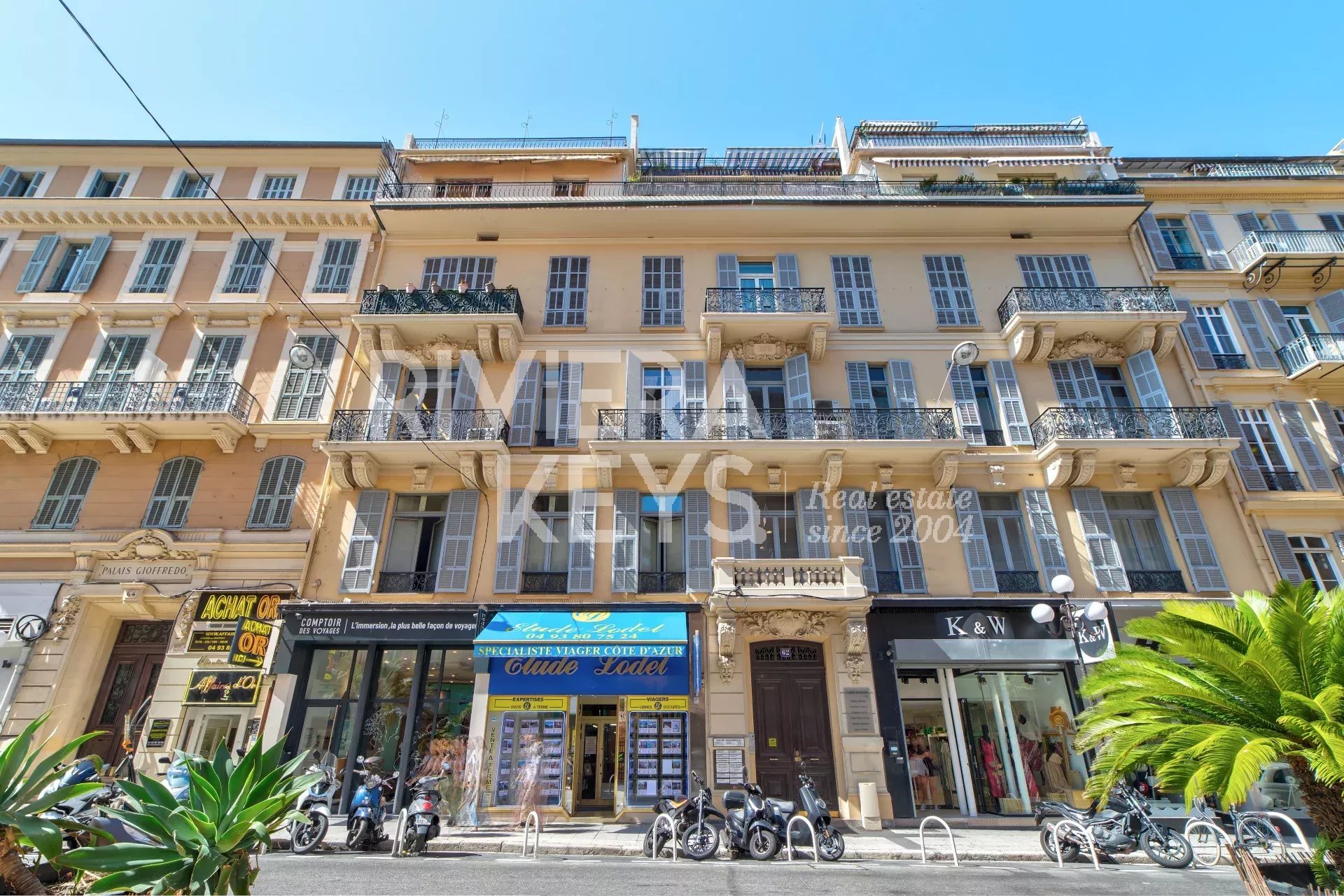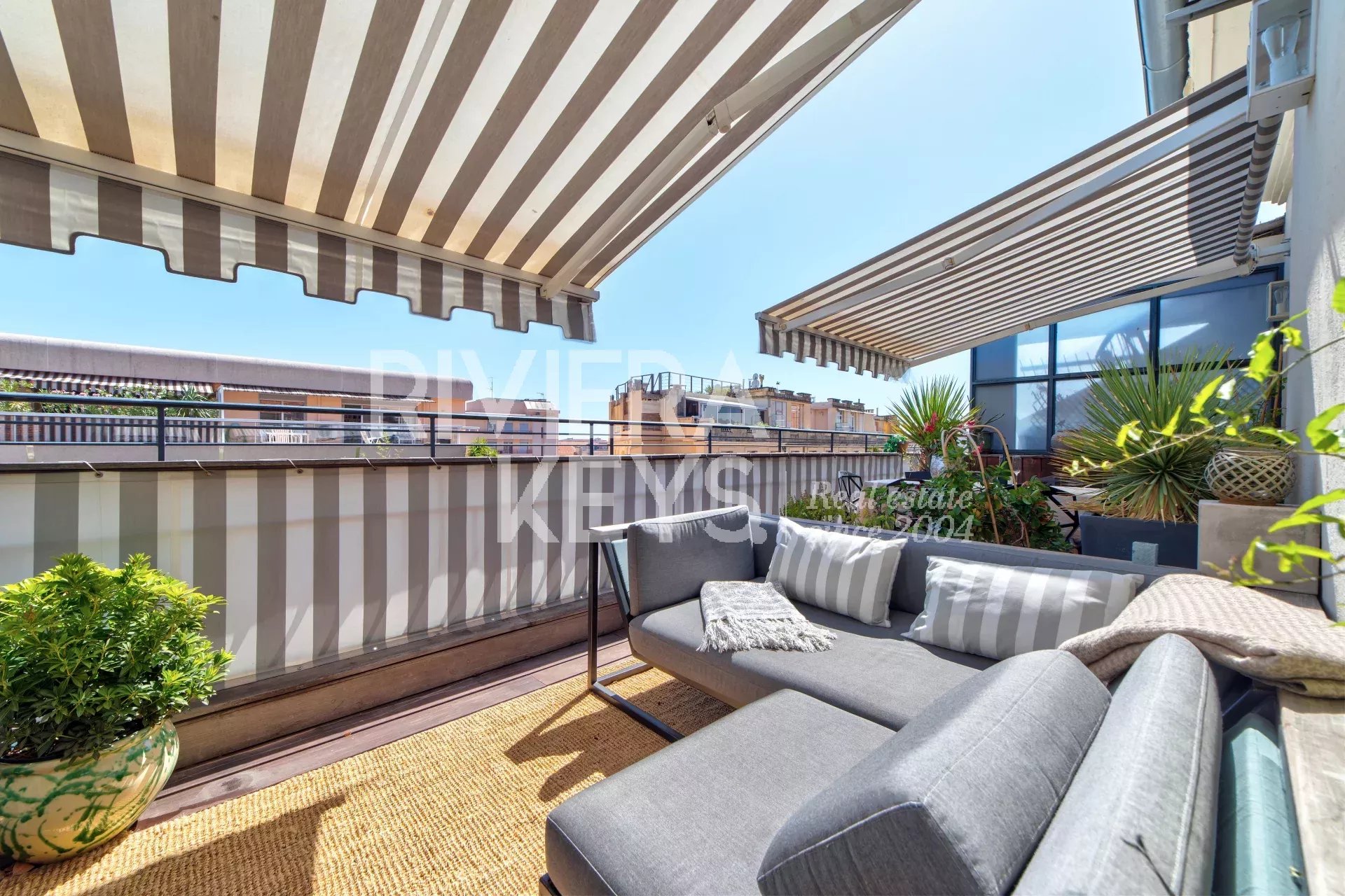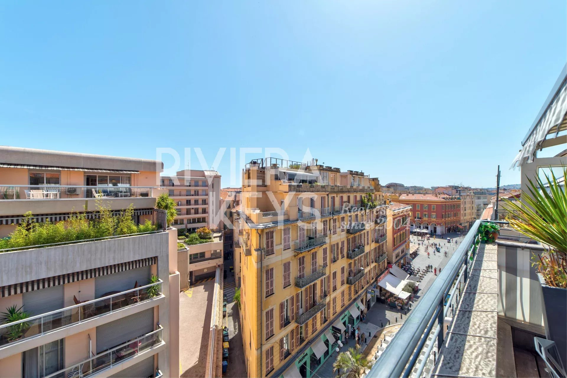 Vacker ljus lägenhet på cirka 110 m² i 2 plan, på översta våningen i en byggnad med hiss, ett stenkast från Place Massena, hamnområdet och affärerna, restaurangerna och stränderna vid Promenade des Anglais. Lägenheten består av ett stort ljust vardagsrum med högt i tak, fullt utrustat kök i öppen planlösning, 3 sovrum, 2 duschrum. Fantastisk terrass på 22 m² med markiser och utsikt över Place Massena.