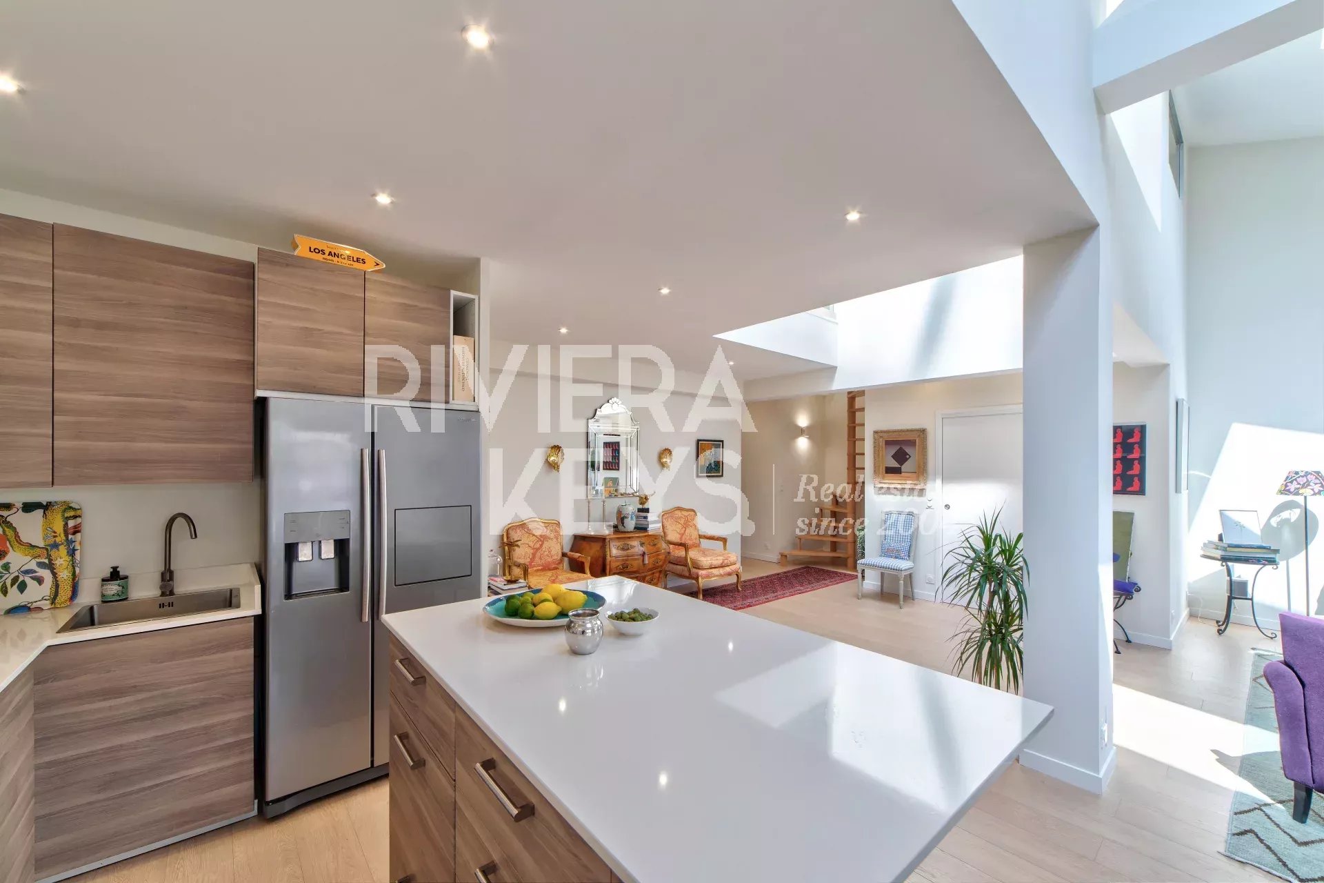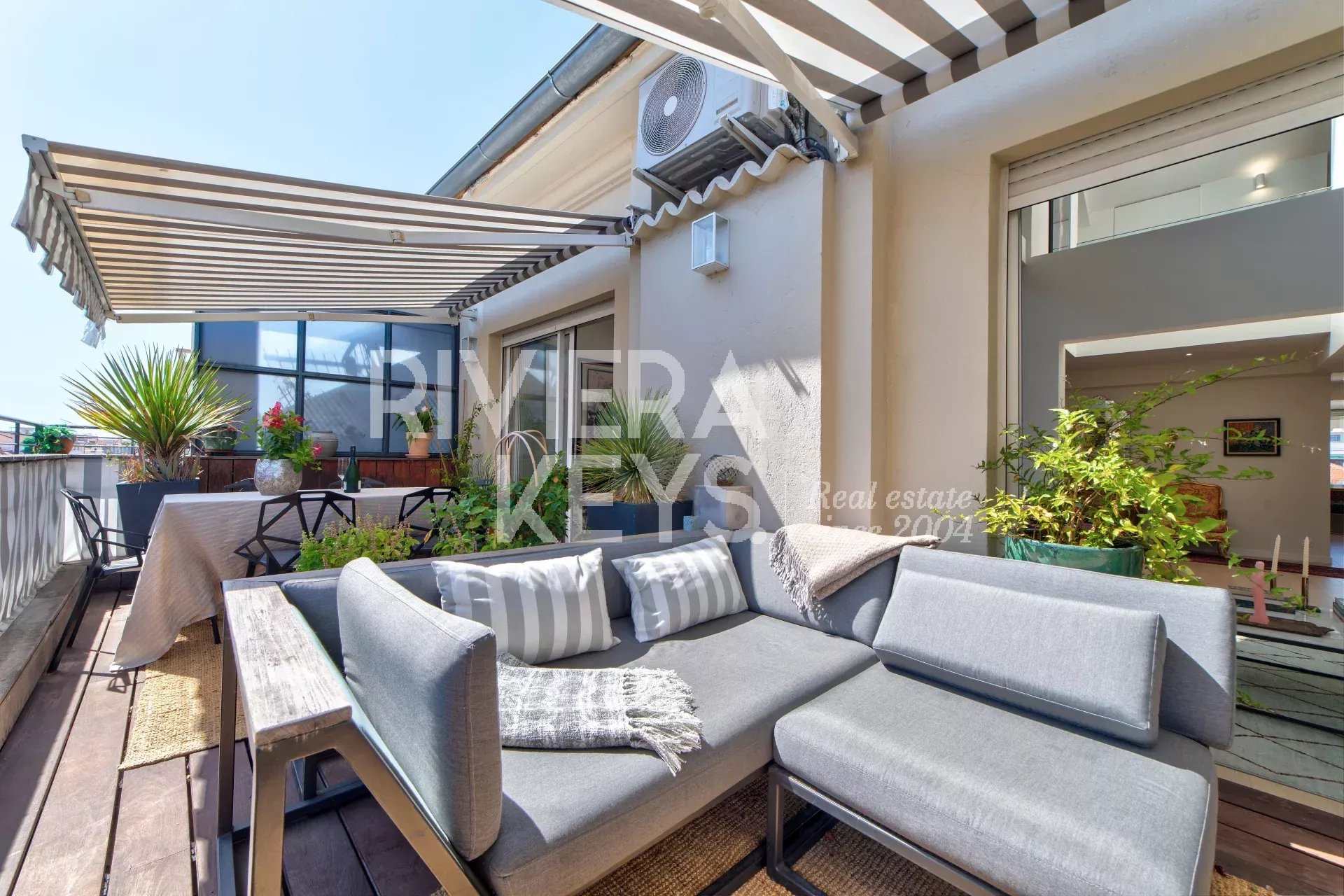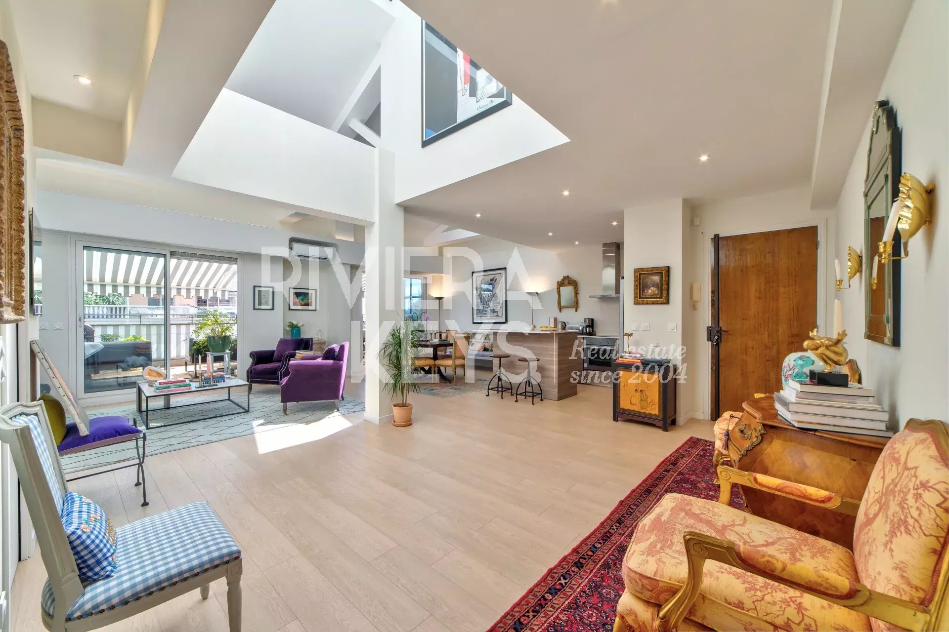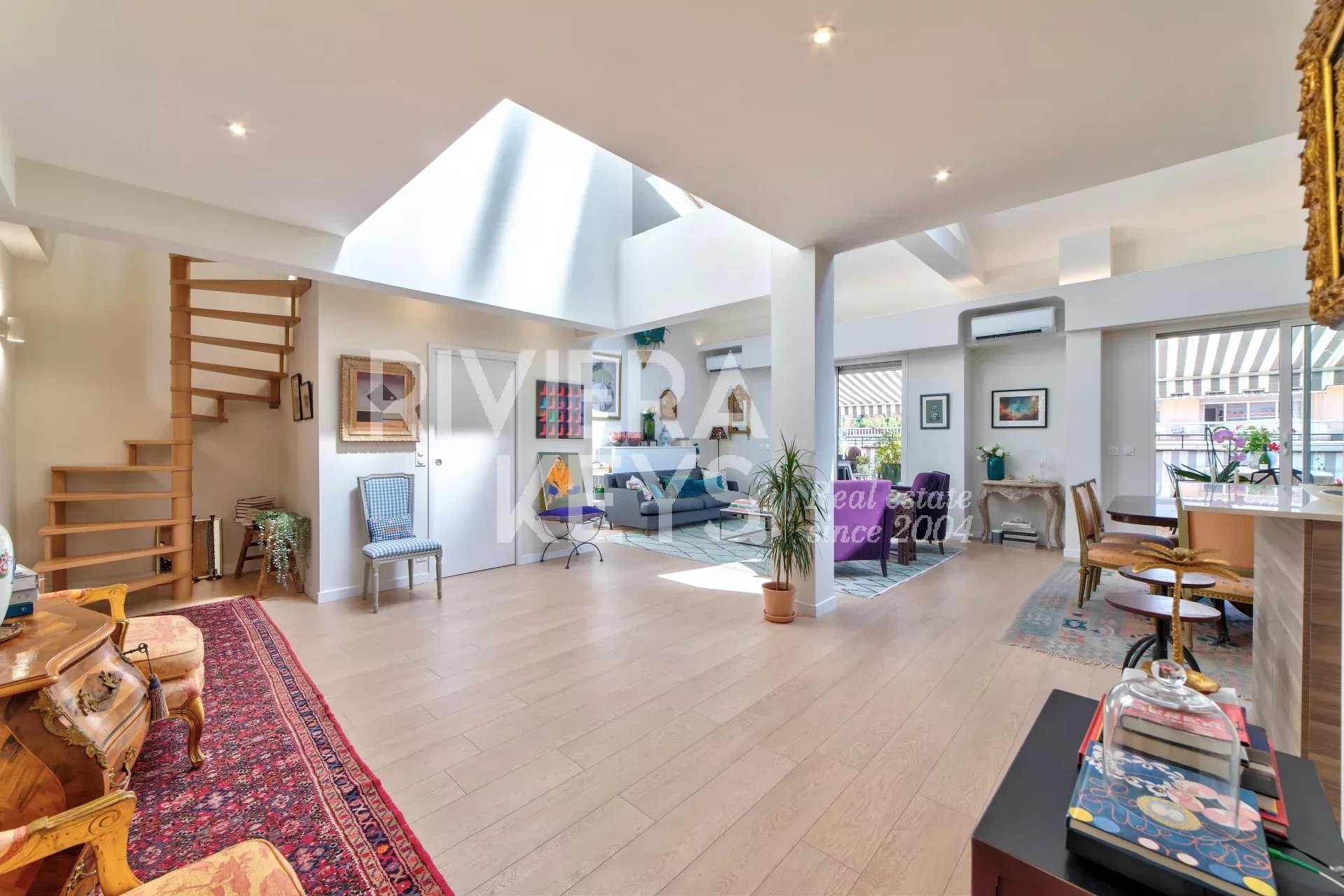 Vacker ljus lägenhet på cirka 110 m² i 2 plan, på översta våningen i en byggnad med hiss, ett stenkast från Place Massena, hamnområdet och affärerna, restaurangerna och stränderna vid Promenade des Anglais. Lägenheten består av ett stort ljust vardagsrum med högt i tak, fullt utrustat kök i öppen planlösning, 3 sovrum, 2 duschrum. Fantastisk terrass på 22 m² med markiser och utsikt över Place Massena.
