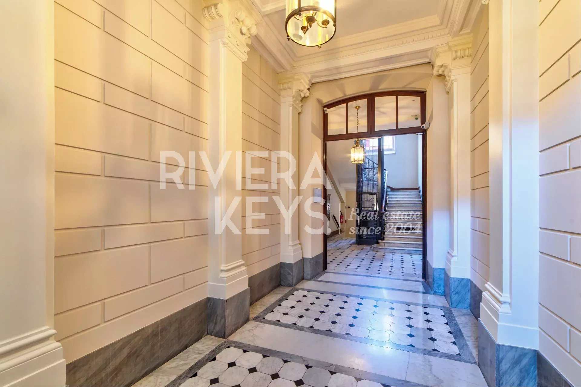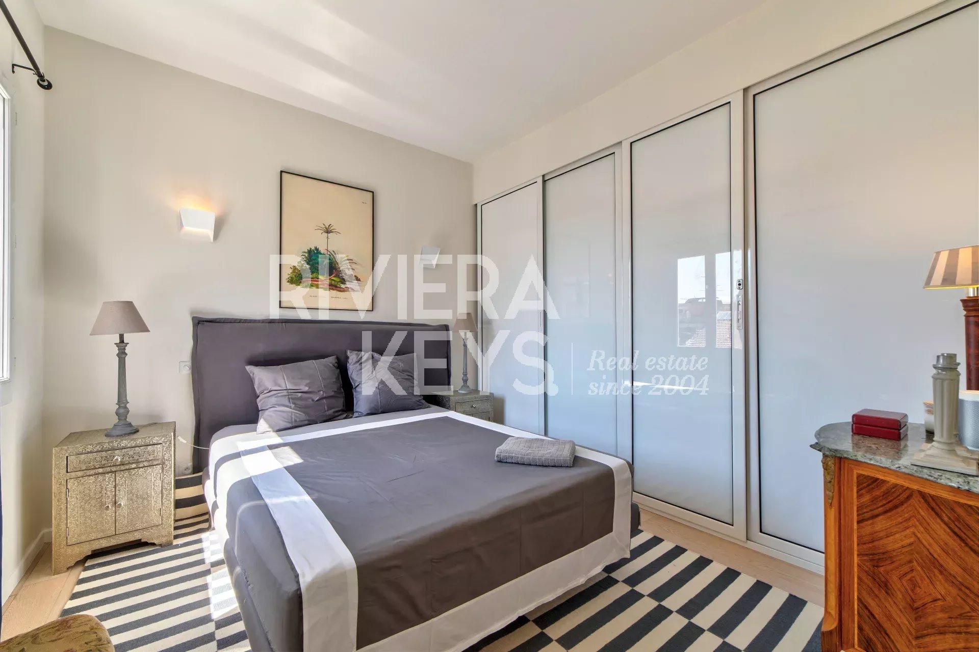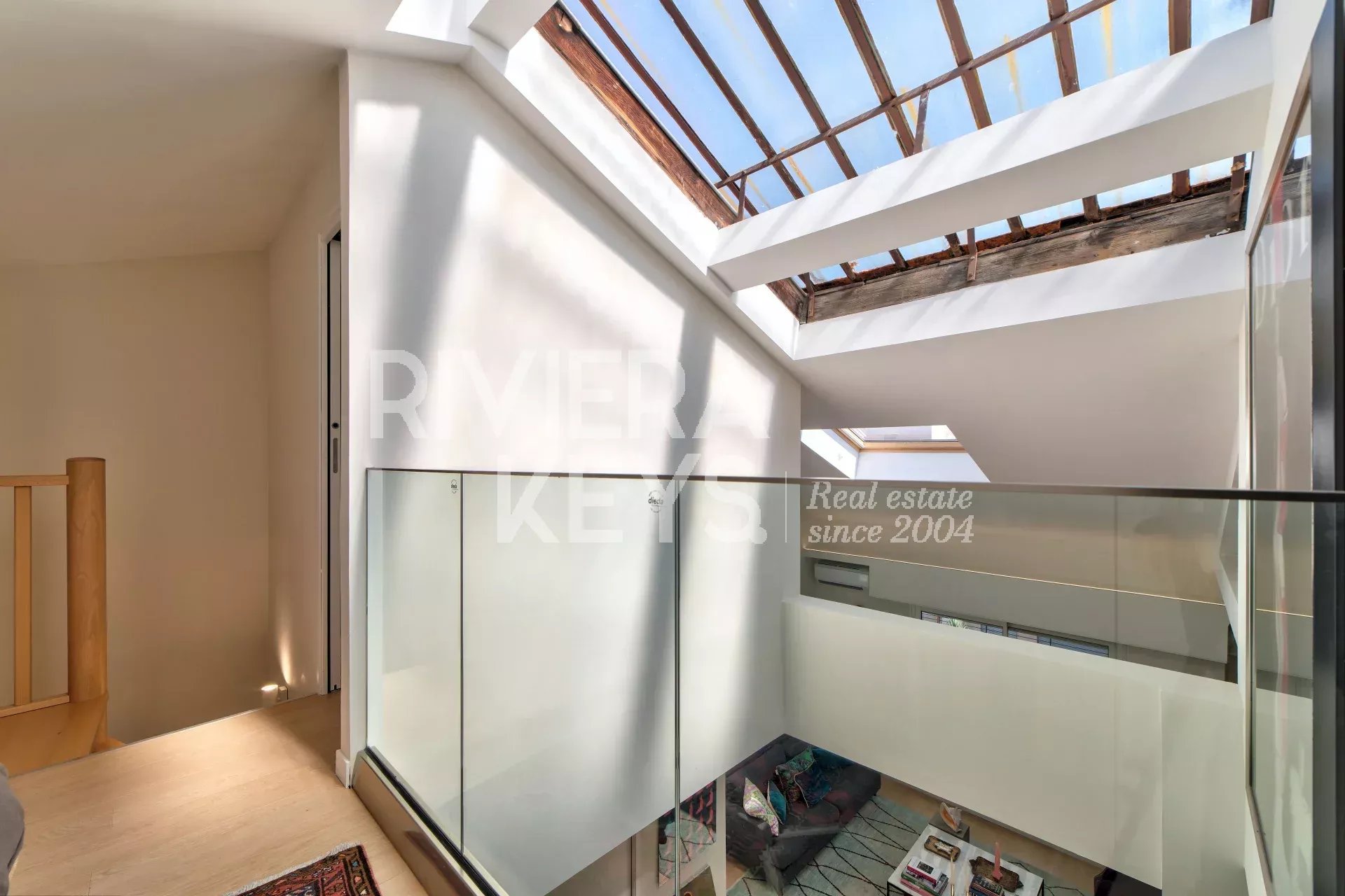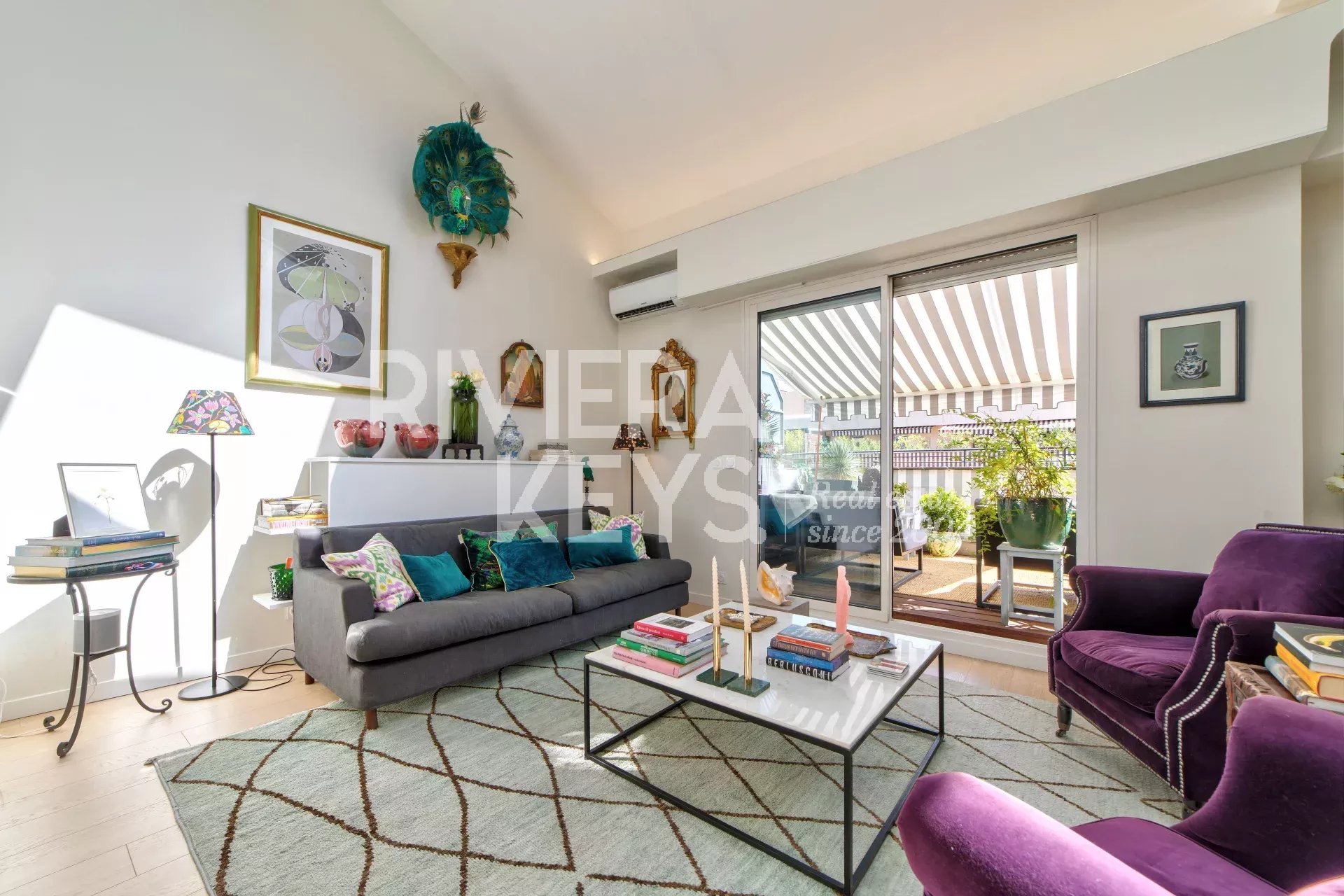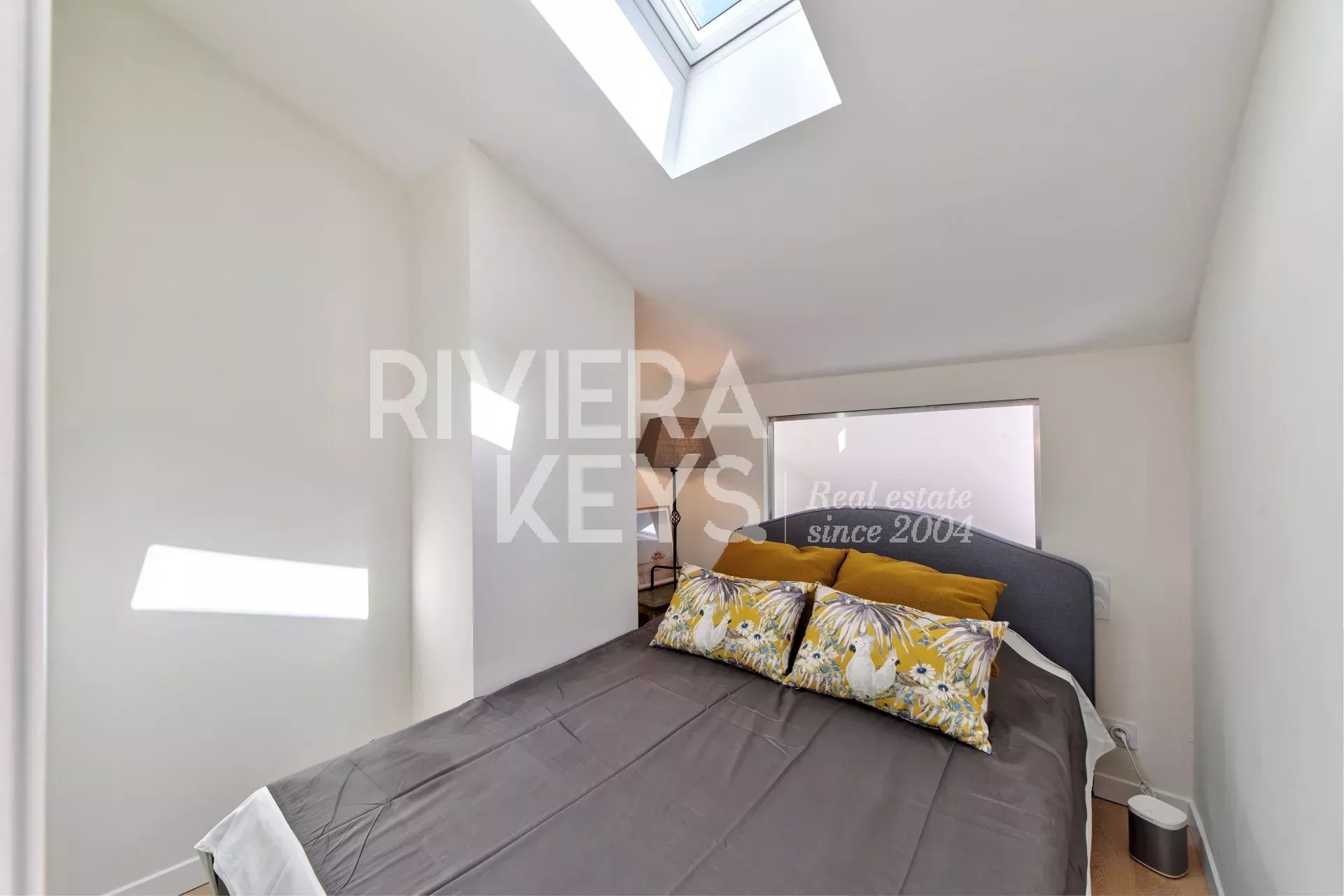 Vacker ljus lägenhet på cirka 110 m² i 2 plan, på översta våningen i en byggnad med hiss, ett stenkast från Place Massena, hamnområdet och affärerna, restaurangerna och stränderna vid Promenade des Anglais. Lägenheten består av ett stort ljust vardagsrum med högt i tak, fullt utrustat kök i öppen planlösning, 3 sovrum, 2 duschrum. Fantastisk terrass på 22 m² med markiser och utsikt över Place Massena.