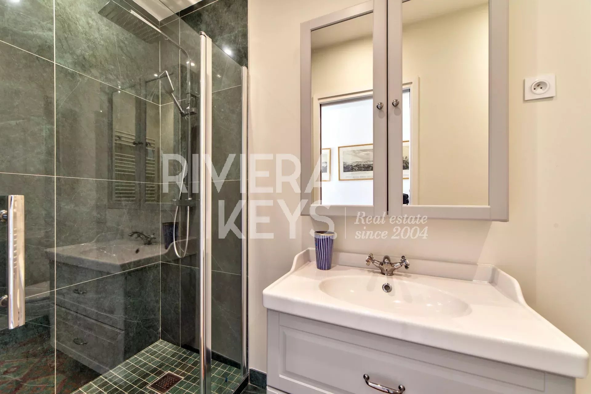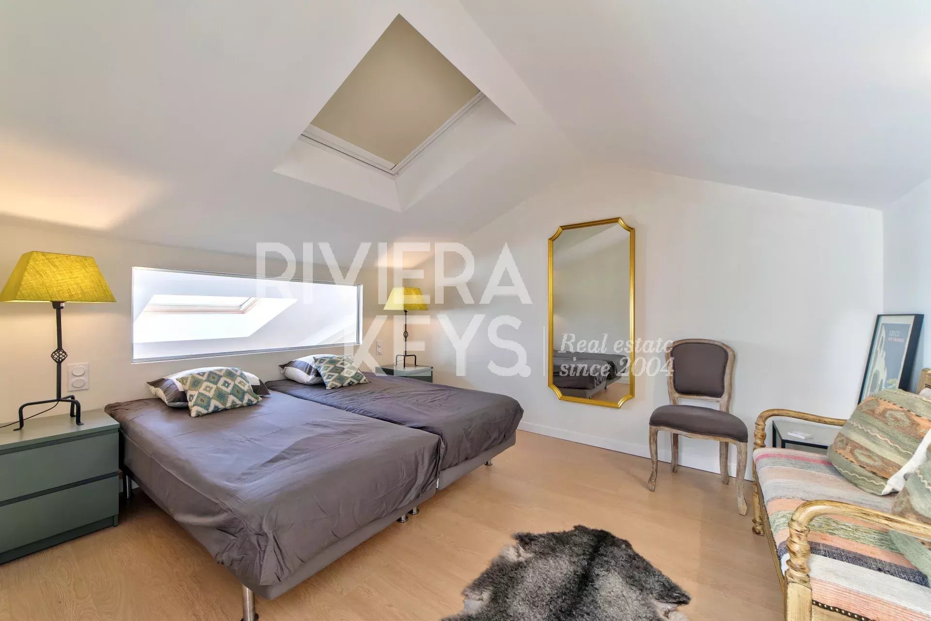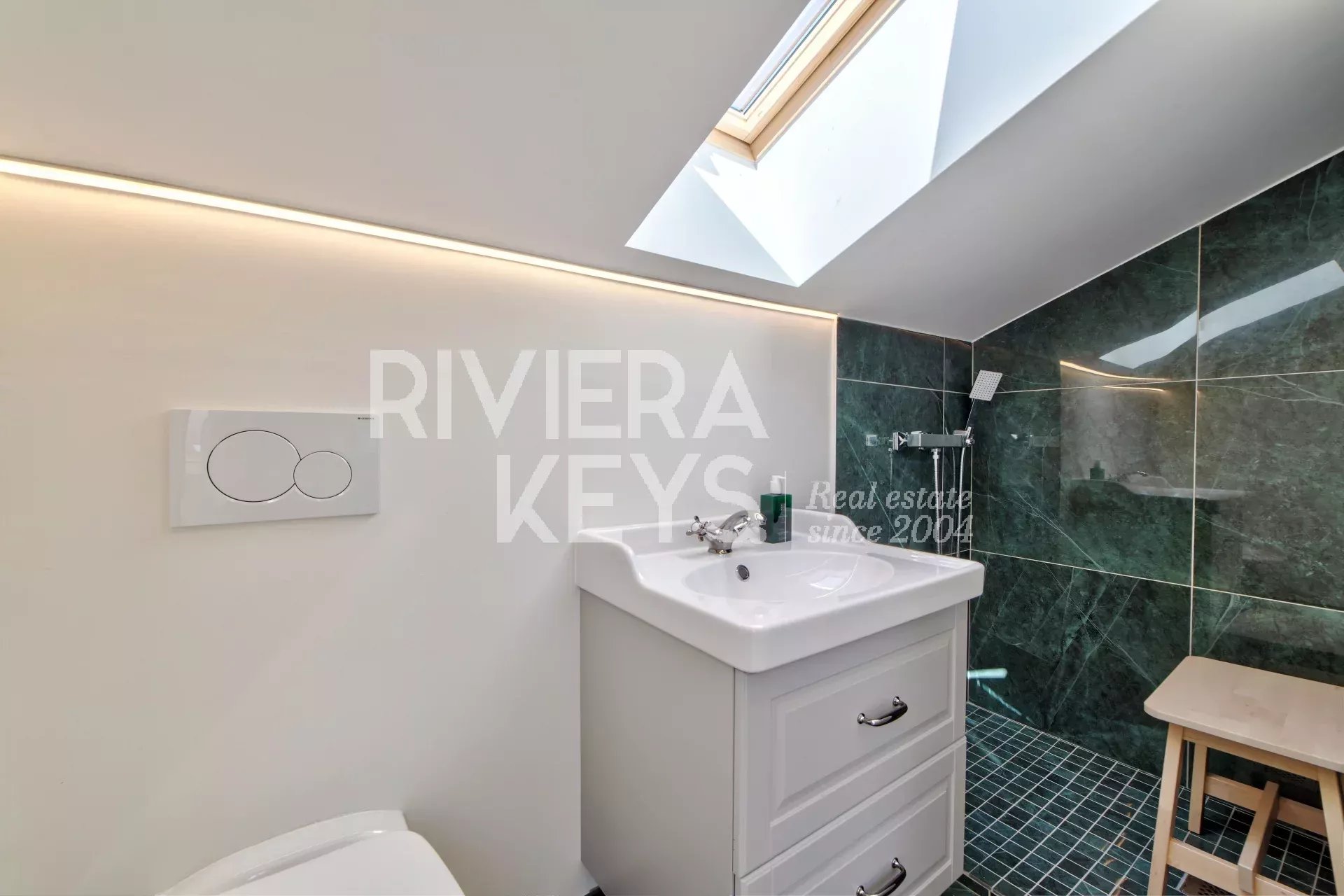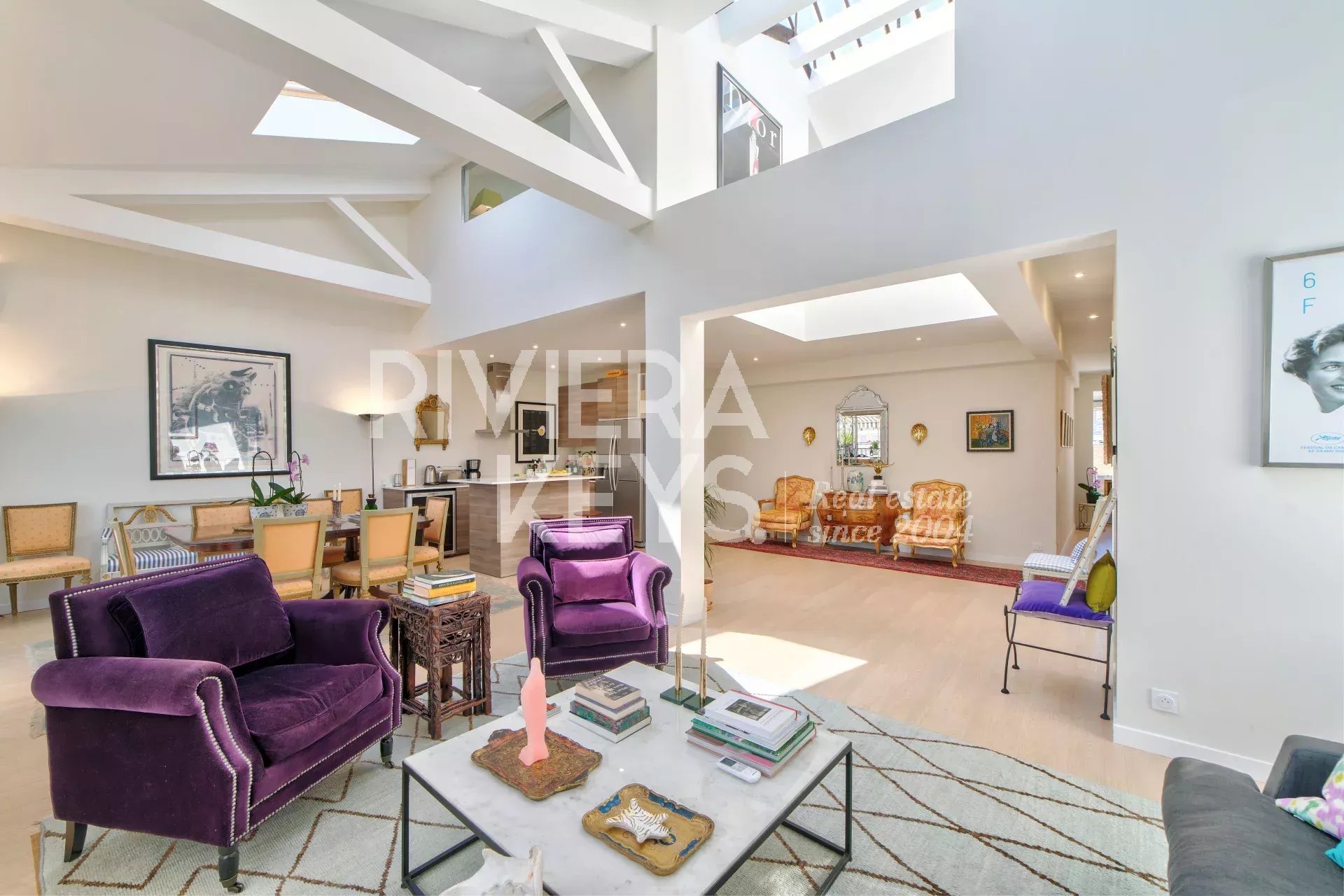 Vacker ljus lägenhet på cirka 110 m² i 2 plan, på översta våningen i en byggnad med hiss, ett stenkast från Place Massena, hamnområdet och affärerna, restaurangerna och stränderna vid Promenade des Anglais. Lägenheten består av ett stort ljust vardagsrum med högt i tak, fullt utrustat kök i öppen planlösning, 3 sovrum, 2 duschrum. Fantastisk terrass på 22 m² med markiser och utsikt över Place Massena.